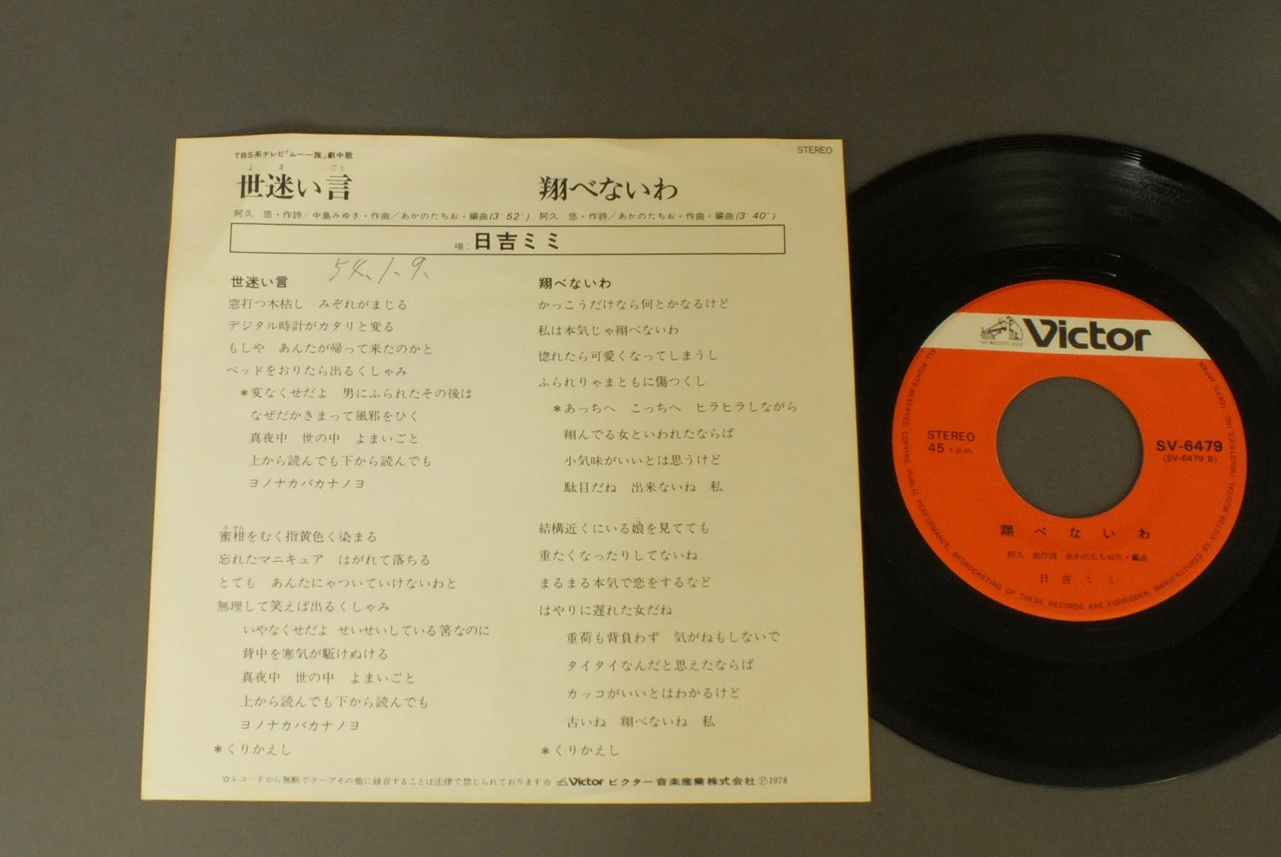 MIMI HIYOSHI日吉ミミ/YOMAIGOOTOドラマ ムー一族 劇中歌 世迷い言 SV6479 製造国:日本盤 / Media:7inch外観:EX盤の状態:EX+ 価格(税込):¥330(売約済) 送料 7inch:定形外郵便 360円~LP:定形外郵便 660円~送料は、注文の最終画面で確認頂けます。 > > MIMI HIYOSHI/YOMAIGOOTO 盤の状態 (EX+)特記事項:極薄いスリキズ・スレ少し。一見してきれいな状態です。盤EX+の共通説明:盤面の極薄いスリキズ、スレ少し程度 音に出そうなものは無いように見える(極軽微なソフトティック音は除く)。 Tweet それぞれの画像をクリックすると、大きい写真が見られます こちらの商品もお勧めです 770円 I SEONG-AE季成愛 / SAYONARAさよなら - 演歌の源流を探る 1,210円 YUMI MATSUTOYA松任谷由実 / DA/DI/DAダ・ディ・ダ 1,870円 TAKURO YOSHIDAよしだたくろう / ON STAGEオン・ステージ ともだち 770円 5 BALLOONS五つの赤い風船 / GAME OVERゲームは終わり 880円 TAKAKO SHIRAI白井貴子 / HEART ATTACKER 3,850円 EIICHI OHTAKI大滝詠一 / EACH TIME MASTER SOUND PRESSINGEACH TIME MASTER SOUND盤 880円 MASA TAKAGI高木麻早 / 1st ALBUM高木麻早 990円 YOMI MATSUTOYA - TSUYOSHI NAGABUCHI etc長渕剛 ユ−ミン他 / TOSHIBA EMI PROMO ONLY東芝EMI総合試聴版