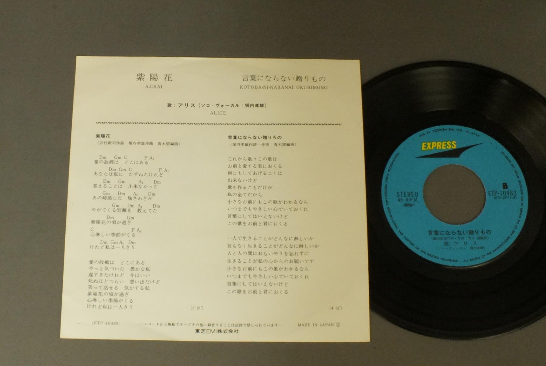 ALICEアリス/AJISAI紫陽花 ETP10483 製造国:日本盤 / Media:7inch外観:EX盤の状態:EX+ 価格(税込):¥330(売約済) 送料 7inch:定形外郵便 360円~LP:定形外郵便 660円~送料は、注文の最終画面で確認頂けます。 > > ALICE/AJISAI 外観 (EX)特記事項:右下にホッチキス穴外観EXの共通説明:ダメージが限定的。中古品としては保存状態がよい方。シミ、ヨゴレ、スレ 少し~軽度。 盤の状態 (EX+)特記事項:極薄いスリキズ・スレ少し。一見してきれいな状態です。盤EX+の共通説明:盤面の極薄いスリキズ、スレ少し程度 音に出そうなものは無いように見える(極軽微なソフトティック音は除く)。 Tweet それぞれの画像をクリックすると、大きい写真が見られます こちらの商品もお勧めです 1,980円 GOODBYE / FIFTH DIMENSION 1,210円 SNAKEMAN SHOWスネークマン・ショー / SNAKEMAN SHOWスネークマン・ショー 1,210円 MIYUKI NAKAJIMA中島みゆき / OKAERINASAIおかえりなさい 770円 ALL NIGHTERSオールナイターズ / 2nd ALBUMKIRAっとジェネレーション 3,300円 TOTAL PRODUCE ORGANAIZER SIDAN師★団 / SUPER FLIGHT IN THE DARK超・夜間飛行 770円 KEIKO FUJI藤圭子 / WOMAN`S BLUES女のブルース 880円 YOUSUI INOUE井上陽水 / NO INVITATION SHOW招待状のないショー 770円 CANDIESキャンディーズ / CANDY LABELキャンディ・レーベル