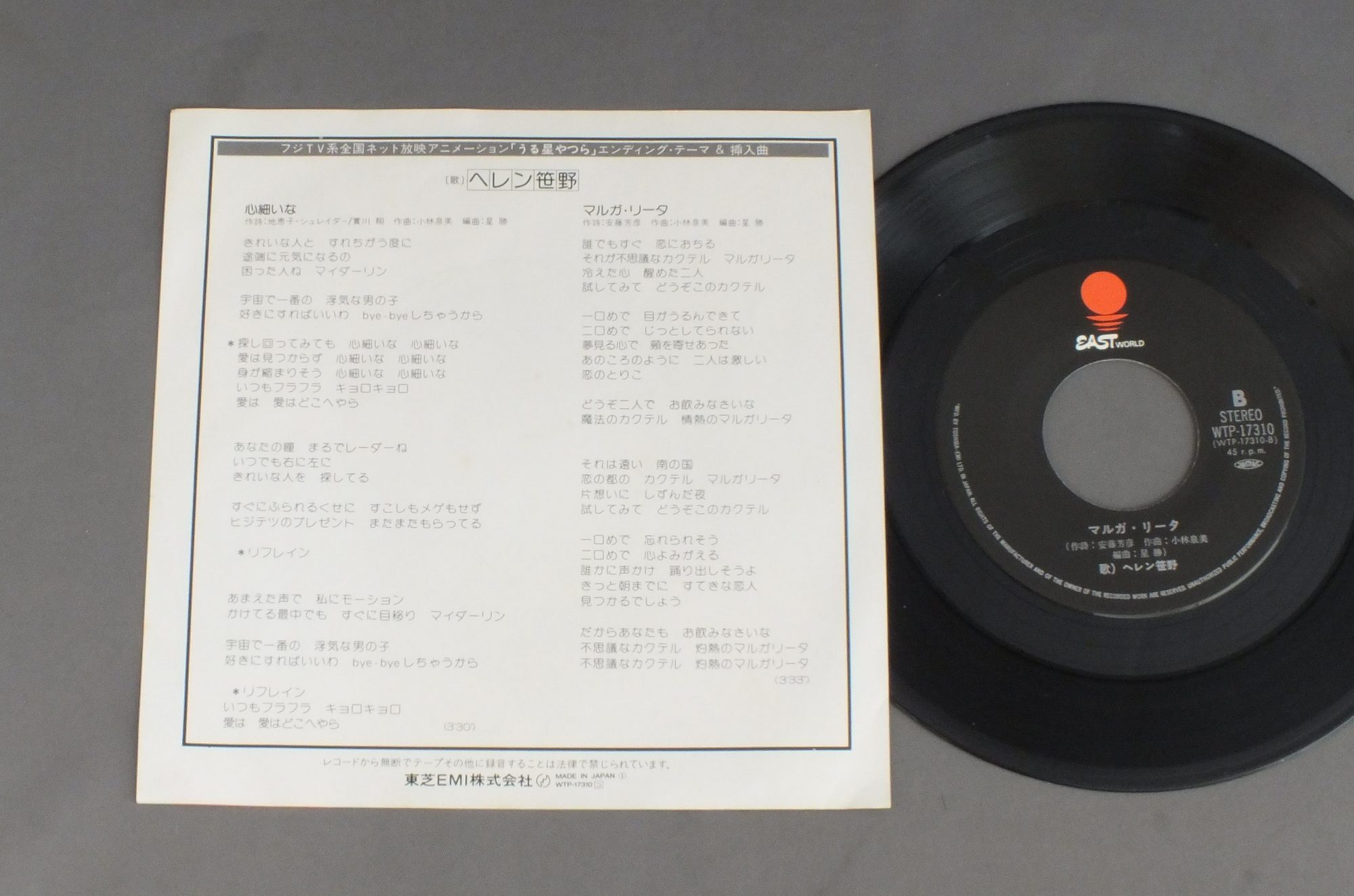 ヘレン笹野/URUSEI YATSURA ENDING THEME「うる星やつら」エンディング・テーマ「心細いな」 WTP17310 製造国:日本盤 / Media:7inch外観:EX+盤の状態:EX+ 価格(税込):¥550(売約済) 送料 7inch:定形外郵便 360円~LP:定形外郵便 660円~送料は、注文の最終画面で確認頂けます。 > > /URUSEI YATSURA ENDING THEME 盤の状態 (EX+)特記事項:薄いスリキズ・スレ少し。一見してきれいな状態です。盤EX+の共通説明:盤面の極薄いスリキズ、スレ少し程度 音に出そうなものは無いように見える(極軽微なソフトティック音は除く)。 Tweet それぞれの画像をクリックすると、大きい写真が見られます こちらの商品もお勧めです 770円 ANIME MOBILE SUIT GUNDAM機動戦士ガンダム / AMURO ( ORIGINAL SOUNDTRACK )アムロよ ( オリジナル・サウンドトラック ) 1,320円 ANIME SIX GOD COMBINATION MARSアニメ 六神合体ゴッドマーズ / MARS AND MARG STORY + POSTERドラマ編マーズ&マーグ物語 2,200円 GREAT ADVENTURE OF HORUS PRINCE OF THE SUN太陽の王子 ホルスの大冒険 / 2LP BOXオリジナル・サウンドトラック 2枚組BOX(シナリオ付) 1,210円 ANIME MAGICAL PRINCESS MINKY MOMOアニメ 魔法のプリンセス ミンキーモモ / I`LL SEE YOU IN MY DREAMSドラマ篇 夢で逢いましょう 770円 ROUND-VERNIAN銀河漂流バイファム / VIFAM VOL2音楽集 VOL2 770円 MOBILE SUIT GUNDAM機動戦士ガンダム / 2nd LP戦場で 770円 ROUND-VERNIAN VIFAM銀河漂流バイファム / SOUNDTRACK EXTRA EDITION音楽集・番外編 1,650円 CYBORG 009サイボーグ009 / TV SERIES VOL1Xの挑戦