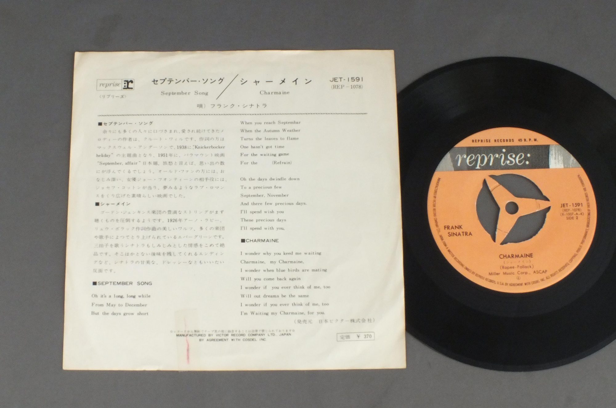 FRANK SINATRAフランク・シナトラ/SEPTEMBER SONGセプテンバー・ソング JET1591 製造国:日本盤 / Media:7inch外観:EX-盤の状態:EX 価格(税込):¥550(売約済) 送料 7inch:定形外郵便 360円~LP:定形外郵便 660円~送料は、注文の最終画面で確認頂けます。 > > FRANK SINATRA/SEPTEMBER SONG 外観 (EX-)特記事項:テープ補修有り外観EX-の共通説明:ダメージ軽度~多少。 中古品としては普通の状態。シミ、ヨゴレ、スレなど軽く~多少。 盤の状態 (EX)特記事項:薄いスリキズ・スレ軽くある感じ。軽微なものの様子です。盤EXの共通説明:盤面のスリキズが薄いものが少し~軽度 音に出そうなものは無いように見える(軽微なソフトティック音は除く)。 Tweet それぞれの画像をクリックすると、大きい写真が見られます こちらの商品もお勧めです 770円 SWINGLE SINGERSスイングル・シンガーズ / GOING BAROQUEジャズ・バロック・コーラス 770円 NANCY WILSONナンシー・ウィルスン / BUT BEAUTIFULバット・ビューティフル 440円 BING CROSBYビング・クロスビー / BING CROSBYビング・クロスビー 770円 YUKARI KANEKO金子由香利 / BEST COLLECTIONベスト・コレクション 770円 BUDDY GRECOバディ・グレコ / HERE`S BUDDY GRECOヒアーズ・バディ・グレコ 1,210円 CLEO LAINEクレオ・レーン / BORN ON A FRIDAY金曜日のクレオ 990円 SAMMY DAVIS JRサミー・デイビス・ジュニア / AT THE COCOANUT GROVE VOL2 60s ISSUE「サミー・デイビス・ジュニアを聴く夕べ」第2夜 ペラジャケ 440円 MARI NAKAMOTO中本マリ / APHORODITEアフロディーの祈り
