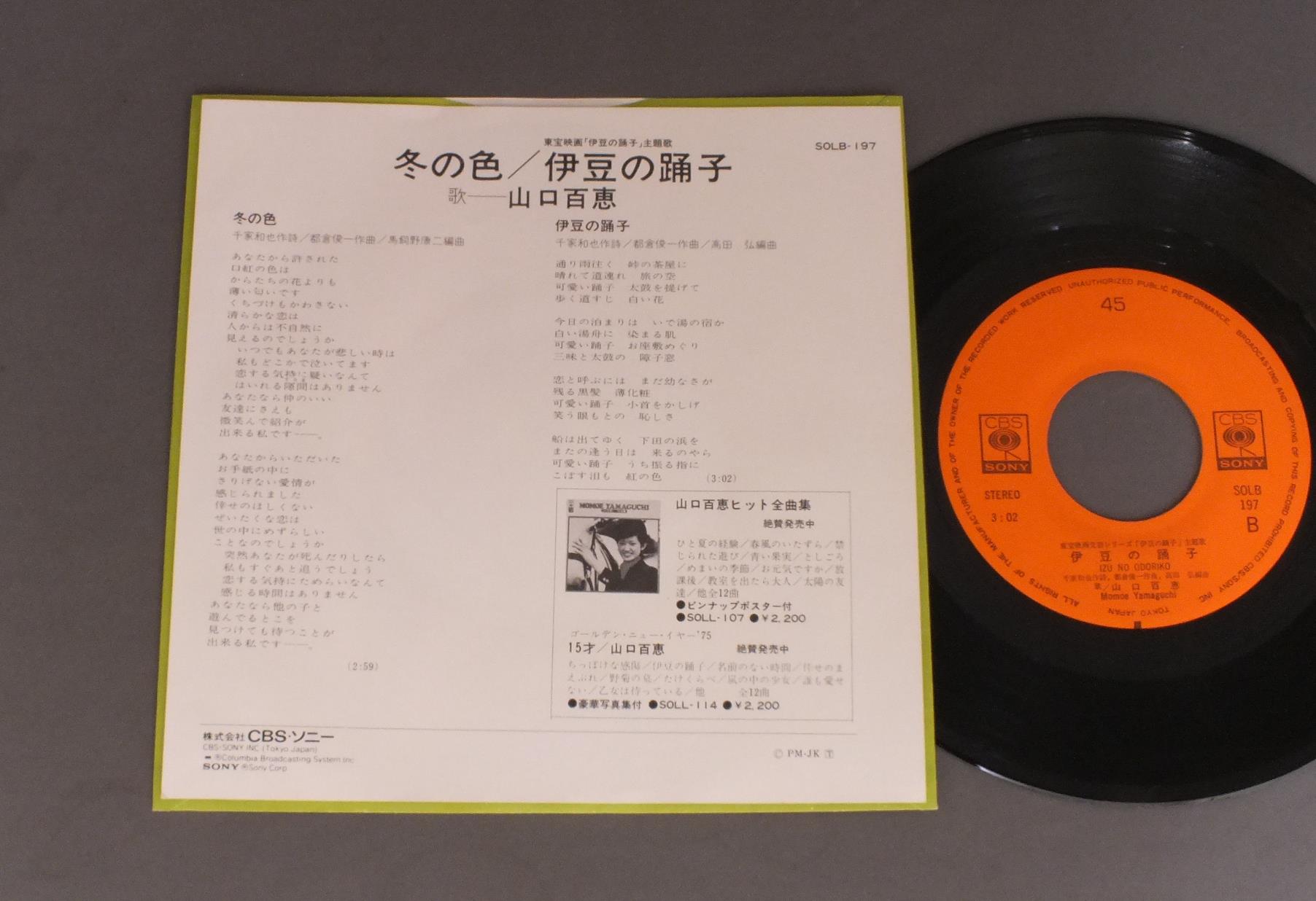 MOMOE YAMAGUCHI山口百恵/FUYU NO IRO冬の色 SOLB197 製造国:日本盤 / Media:7inch外観:EX+盤の状態:EX+ 価格(税込):¥440 送料 7inch:定形外郵便 360円~LP:定形外郵便 660円~送料は、注文の最終画面で確認頂けます。 > > MOMOE YAMAGUCHI/FUYU NO IRO 外観 (EX+)特記事項:特記事項無し。コンディションリストを参照。外観EX+の共通説明:中古としては美品、一見してきれいでダメージが軽微。シミ、ヨゴレ、スレ有っても僅か~少し。 盤の状態 (EX+)特記事項:極薄いスリキズ・スレ少し。一見してきれいな状態です。盤EX+の共通説明:盤面の極薄いスリキズ、スレ少し程度 音に出そうなものは無いように見える(極軽微なソフトティック音は除く)。 Tweet それぞれの画像をクリックすると、大きい写真が見られます こちらの商品もお勧めです 880円 MAKO ISHINO石野真子 / MAKO2 550円 ERI NITTA新田恵利 / E-AREA 1,320円 YOSHIMI IWASAKI岩崎良美 / RING-A-DING (1st ALBUM)リング・ア・ディング (1st ALBUM) 660円 MIYOKO ASADA浅田美代子 / TRAVELLING AROUND THE WORLD WITH MIYOKOしあわせの一番星-恋は真珠いろ -(美代子と世界の旅) 1,210円 ONYANNKO CLUBおニャン子クラブ / DREAM CATALOGUE夢カタログ 440円 YOU HAYAMI早見優 / MUSICミュージック 770円 YUKO ISHIKAWA石川優子 / YUKO TOKIMEKU-KORO優子ときめくころ 770円 ERI NITTA新田恵利 / E-AREA