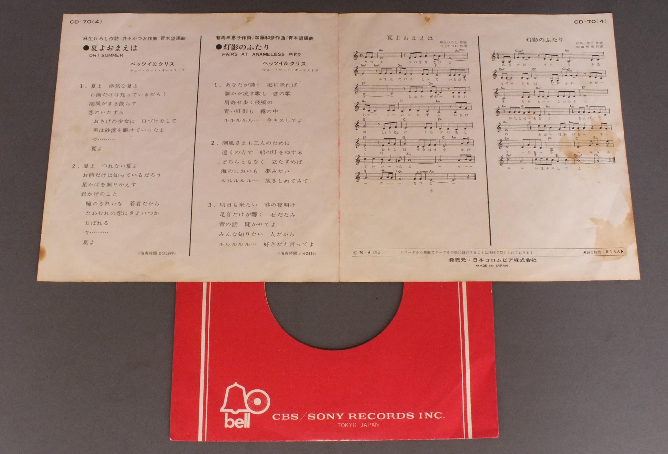BETSY & CHRISベッツイ&クリス/OH!SUMMER夏よおまえは CD70 製造国:日本盤 / Media:7inch外観:VG+盤の状態:EX 価格(税込):¥330(売約済) 送料 7inch:定形外郵便 360円~LP:定形外郵便 660円~送料は、注文の最終画面で確認頂けます。 > > BETSY & CHRIS/OH!SUMMER 外観 (VG+)特記事項:見開きや裏ジャケにシミ有り外観VG+の共通説明:ダメージやや有り。シミ、ヨゴレ、スレなど多少~やや多め。 盤の状態 (EX)特記事項:薄いスリキズ・スレ軽くある感じ。殆どが軽微なものの様子です。盤EXの共通説明:盤面のスリキズが薄いものが少し~軽度 音に出そうなものは無いように見える(軽微なソフトティック音は除く)。 Tweet それぞれの画像をクリックすると、大きい写真が見られます こちらの商品もお勧めです 1,760円 TAKASHI NISHIOKA西岡たかし / LIFEらいふ 1,980円 FRUIDO古井戸 / YESTERDAYSイエスタデイズ 1,980円 YUZO TOYAOTA豊田勇造 / LIVE拾得ライブ・走れアルマジロ 660円 RYOKO MORIYAMA森山良子 / RYOKO MORIYAMA SINGS LULLABY良子の子守唄 770円 IRUKAイルカ / WAGA KOKORNO TOMOHE我が心の友へ 1,650円 5 BALLOONS五つの赤い風船 / `75 880円 FURUIDO古井戸 / SKETCH OF ORANGE COLORオレンジ色のすけっち 770円 SHIGERU IZUMIYA泉谷しげる / GOLD RUSH黄金狂時代