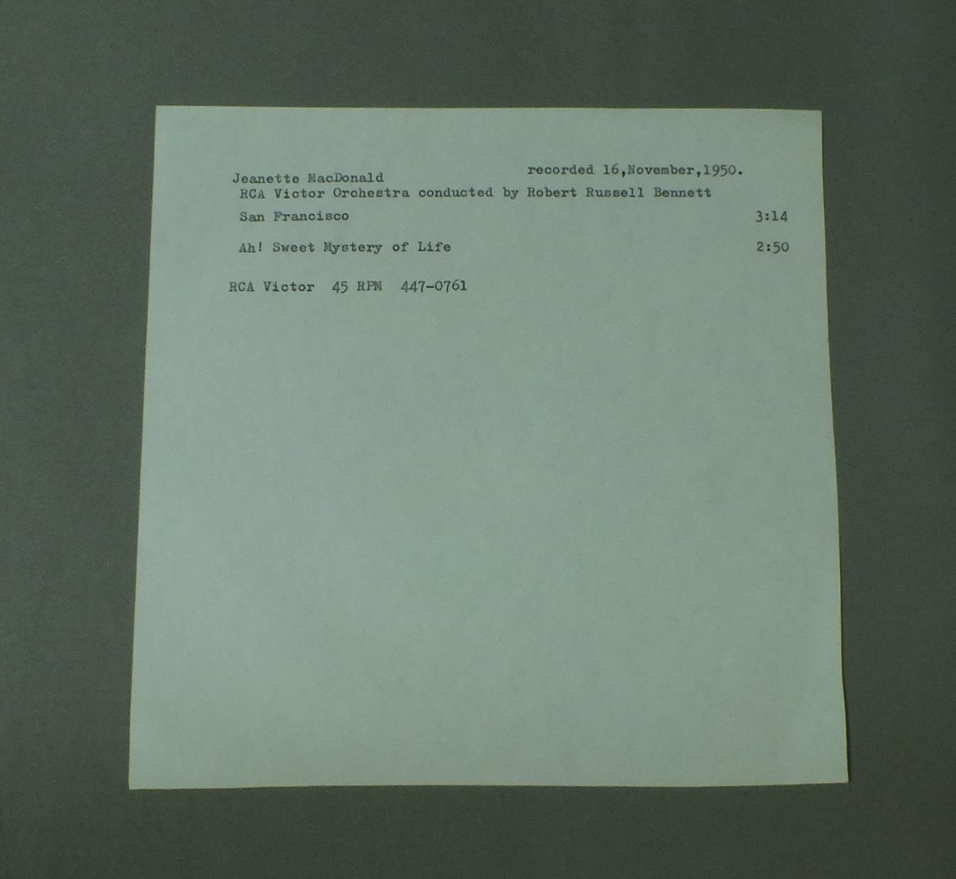 JEANETTE MACDONALD/SAN FRANCISCO 447 0761 製造国:米国盤 / Media:7inch盤の状態:EX- 価格(税込):¥440 送料 7inch:定形外郵便 360円~LP:定形外郵便 660円~送料は、注文の最終画面で確認頂けます。 > > JEANETTE MACDONALD/SAN FRANCISCO 盤の状態 (EX-)特記事項:薄いスリキズ・細かい表面スレ軽くある感じです。プチ出そうな所は少し。軽微なものが中心の様子です。盤EX-の共通説明:盤面のスリキズが多少有り。音に出そうなものは殆ど無いように見える~さほど気にならないぐらいの軽いプチ数カ所程度。 Tweet それぞれの画像をクリックすると、大きい写真が見られます こちらの商品もお勧めです 440円 DICK HAYMES / DICK HAYMES SINGS 1,210円 BOB CROSBYボブ・クロスビー / BOB CROSBY`S BOB CATSボブ・クロスビーのボブ・キャッツ 550円 JEANETTE MacDONALD & NELSON EDDY / FAVORITES 990円 LES BROWN AND HIS ORCHESTRA WITH DORIS DAY / SENTIMENTAL JOURNEY 1,210円 BING CROSBY / EASY TO REMEMBER 1931-36 1,980円 JONI JAMES / ITALIANISSIME 770円 SWINGLE SINGERS / GOING BAROQUE SWINGING HITS OF HANDEL 990円 CLEO LAINE / BORN ON A FRIDAY