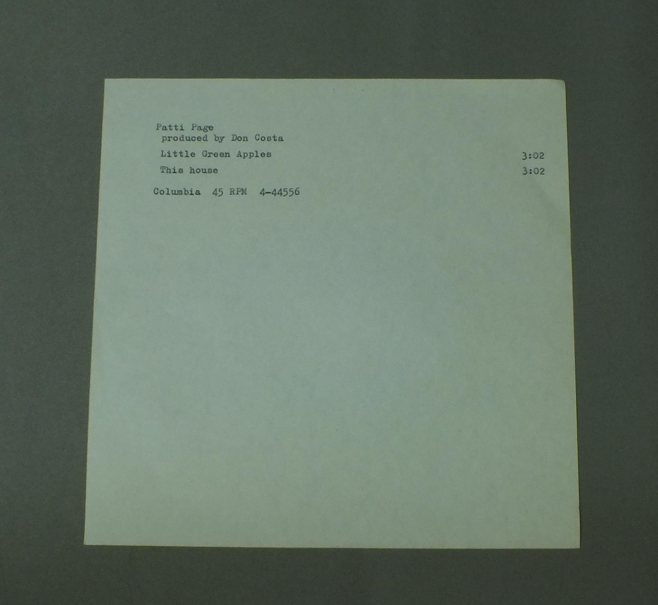 PATTI PAGE/LITTLE GREEN APPLES 4 44556 製造国:米国盤 / Media:7inch盤の状態:EX 価格(税込):¥440(売約済) 送料 7inch:定形外郵便 360円~LP:定形外郵便 660円~送料は、注文の最終画面で確認頂けます。 > > PATTI PAGE/LITTLE GREEN APPLES 盤の状態 (EX)特記事項:薄いスリキズ・スレ軽くある感じ。殆どが軽微なものの様子です。盤EXの共通説明:盤面のスリキズが薄いものが少し~軽度 音に出そうなものは無いように見える(軽微なソフトティック音は除く)。 Tweet それぞれの画像をクリックすると、大きい写真が見られます こちらの商品もお勧めです 1,100円 BELINDA CARLISLE / BELINDA CARLISLE STORY ( AIRDATE JULY 15 1988 ) 770円 BUFFY SAINTE-MARIE / I`M GONNA BE A COUNTRY GIRL AGAIN 1,980円 CONNIE FRANCIS / SINGS ITALIAN FAVORITE 770円 EMMYLOU HARRIS / CIMARRON 7,700円 SUSAN MAUGHAN / I WANNA BE BOBBY`S GIRL 990円 MILVA / UNVERKENNBAR 770円 LORETTA LYNN / WHEN THE TINGLE BECOMES A CHILL 1,100円 MIRIAM MAKEBA / FORBIDDEN GAMES