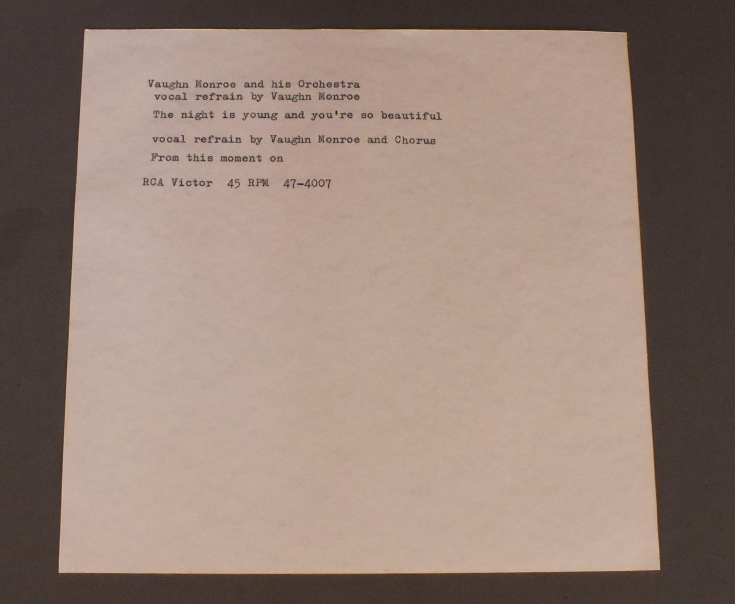 VAUGHN MONROE/NIGHT IS YOUNG AND YOU`RE SO BEAUTIFUL 47 4007 製造国:米国盤 / Media:7inch盤の状態:EX 価格(税込):¥330 送料 7inch:定形外郵便 360円~LP:定形外郵便 660円~送料は、注文の最終画面で確認頂けます。 > > VAUGHN MONROE/NIGHT IS YOUNG AND YOU`RE SO BEAUTIFUL 盤の状態 (EX)特記事項:薄いスリキズ・スレ軽くある感じ。軽微なものの様子です。盤EXの共通説明:盤面のスリキズが薄いものが少し~軽度 音に出そうなものは無いように見える(軽微なソフトティック音は除く)。 Tweet それぞれの画像をクリックすると、大きい写真が見られます こちらの商品もお勧めです 770円 HARRY JAMES AND HIS ORCHESTRA / KING PORTER STOMP 1,100円 BENNY GOODMAN / ESSENTIAL 1,100円 CLAUDE HOPKINS & HIS ORCHESTRA / 1932-1933 1940 550円 BUNNY BERIGAN & ORIGINAL DIXIELAND JAZZ BAND / SATURDAY NIGHT SWING CLUB 1936 770円 FRANKIE CARLE / FABULOUS FOUR HANDS 990円 AL HIRT / AL HIRT SWINGIN` DIXIE VOL 4 1,210円 WORLD`S GREATEST JAZZ BAND OF YANK LAWSON AND BOB HAGGART / LIVE AT THE ROOSEVELT GRILL(RALPH SUTTON AUTOGRAPHED)LIVE AT THE ROOSEVELT GRILL(RALPH SUTTONサイン付) 660円 LIONEL HAMPTON / ONE NIGHT STAND WITH LIONEL HAMPTON CULVER CITY 1944