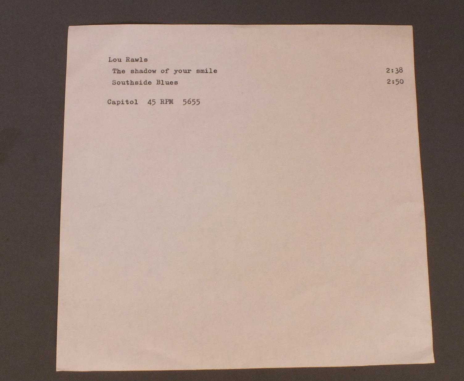 LOU RAWLS/SHADOW OF YOUR SMILE 5655 製造国:米国盤 / Media:7inch盤の状態:EX 価格(税込):¥440(売約済) 送料 7inch:定形外郵便 360円~LP:定形外郵便 660円~送料は、注文の最終画面で確認頂けます。 > > LOU RAWLS/SHADOW OF YOUR SMILE 盤の状態 (EX)特記事項:薄いスリキズ・スレ少しある感じ。一見してきれいな感じです。盤EXの共通説明:盤面のスリキズが薄いものが少し~軽度 音に出そうなものは無いように見える(軽微なソフトティック音は除く)。 Tweet それぞれの画像をクリックすると、大きい写真が見られます こちらの商品もお勧めです 660円 KATE SMITH / KATE SMITH`S GOLDEN YEARS OF BROADCASTING 1,210円 BOB CROSBYボブ・クロスビー / BOB CROSBY`S BOB CATSボブ・クロスビーのボブ・キャッツ 880円 MARIO LANZA / LANZA SINGS CARUSO 990円 LES BROWN AND HIS ORCHESTRA WITH DORIS DAY / SENTIMENTAL JOURNEY 550円 BING CROSBY / EARLY BING CROSBY PLUS THE BING CROSBY SHOW 1,210円 BING CROSBY / EASY TO REMEMBER 1931-36 1,320円 BING CROSBY / BING CROSBY 1,210円 BILLY ECKSTINE / SWINGING MR.B