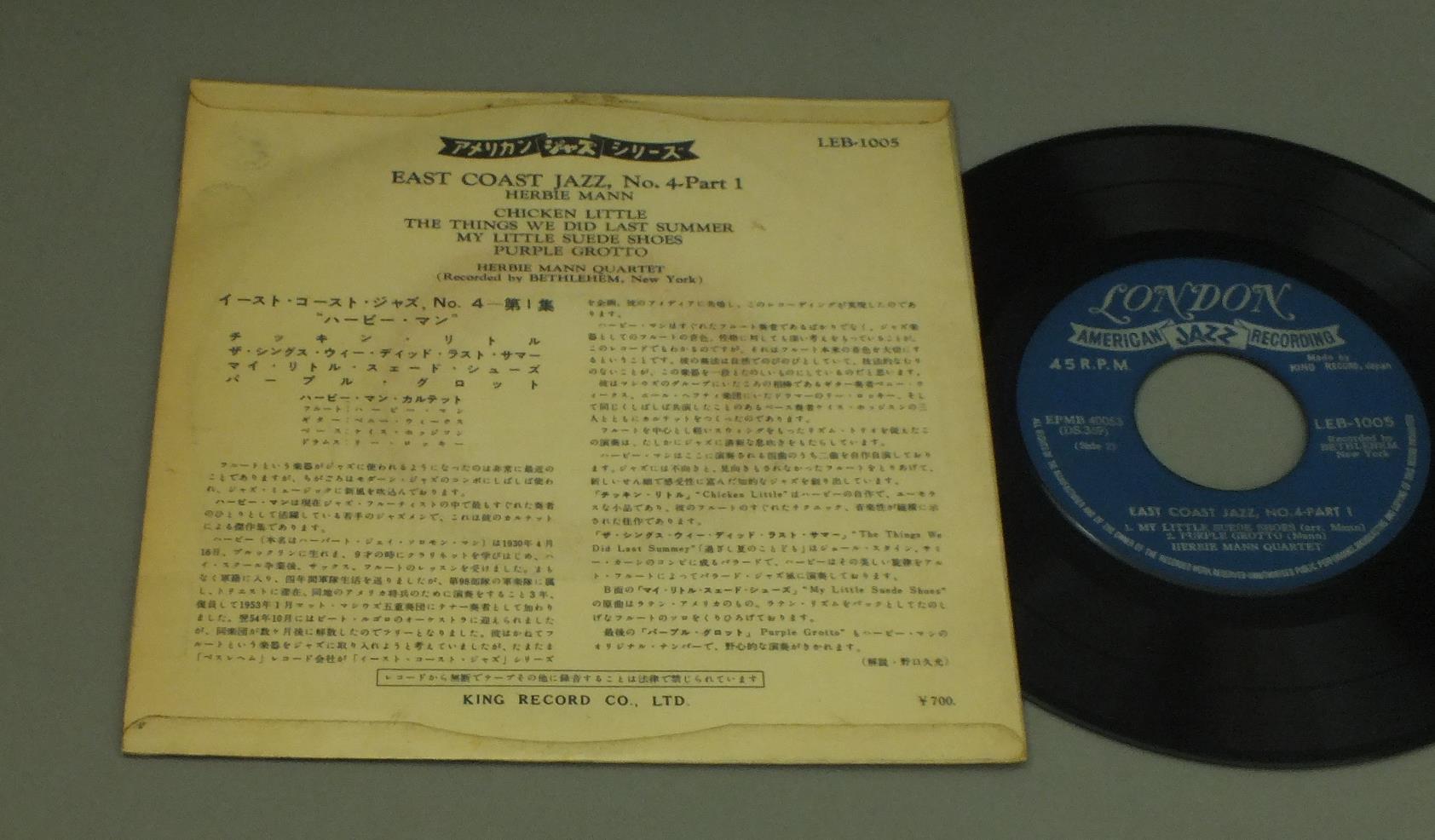 HERBIE MANN QUARTETハービー・マン・カルテット/EAST COAST JAZZ NO4-PART 1 LEB1005 製造国:日本盤 / Media:7inch外観:VG盤の状態:EX- 価格(税込):¥440(売約済) 送料 7inch:定形外郵便 360円~LP:定形外郵便 660円~送料は、注文の最終画面で確認頂けます。 > > HERBIE MANN QUARTET/EAST COAST JAZZ NO4-PART 1 外観 (VG)特記事項:日焼感や薄いヨゴレ。テープ跡。外観VGの共通説明:ダメージが見るからに多い。 盤の状態 (EX-)特記事項:薄いスリキズ・細かい表面スレ多少ある感じ。殆どが軽微なものの様子です。盤EX-の共通説明:盤面のスリキズが多少有り。音に出そうなものは殆ど無いように見える~さほど気にならないぐらいの軽いプチ数カ所程度。 Tweet それぞれの画像をクリックすると、大きい写真が見られます こちらの商品もお勧めです 990円 HOZAN YAMAMOTO山本邦山 / FYMN OF BUDDHA声明に挑む 1,210円 BINGO MIKI & INNER GALAXY ORCHESTRA三木敏悟&インナー・ギャラクシー・オーケストラ / EVE(EIGHT LETTERS)出航前夜-一通の手紙 1,210円 ERROLL GARNERエロール・ガーナー / CONCERT BY THE SEACONCERT BY THE SEA 1,320円 ART BLAKEY`S JAZZ MESSENGERSアート・ブレイキー / LES LIAISONS DANGEREUSES 1960危険な関係 1,210円 KARIN KROC & ARCHIE SHEPPカーリン・クローグ&アーチー・シェップ / HI-FLYハイ・フライ 1,320円 RICHIE COLEリッチー・コール / ALIVE !アライヴ ! 660円 SADAO WATANABE渡辺貞夫 / CALIFORNIA SHOWERカリフォルニア・シャワー 1,650円 MASARU IMADA今田勝 / MINT BREEZEミント・ブリーズ