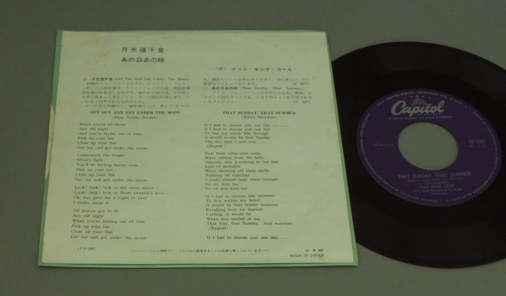 NAT KING COLEナット・キング・コール/GET OUT AND UNDER THE MOON月光価千金 7P292 製造国:日本盤 / Media:7inch外観:EX-盤の状態:EX- 価格(税込):¥330(売約済) 送料 7inch:定形外郵便 360円~LP:定形外郵便 660円~送料は、注文の最終画面で確認頂けます。 > > NAT KING COLE/GET OUT AND UNDER THE MOON 外観 (EX-)特記事項:ヨレやシミ。外観EX-の共通説明:ダメージ軽度~多少。 中古品としては普通の状態。シミ、ヨゴレ、スレなど軽く~多少。 盤の状態 (EX-)特記事項:薄いスリキズ・細かい表面スレ多少ある感じです。プチ出そうな所は少し。軽微なものが中心の様子です。盤EX-の共通説明:盤面のスリキズが多少有り。音に出そうなものは殆ど無いように見える~さほど気にならないぐらいの軽いプチ数カ所程度。 Tweet それぞれの画像をクリックすると、大きい写真が見られます こちらの商品もお勧めです 770円 MITCH MILLER AND THE GANGミッチ・ミラー合唱団 / HOME CHORUS PARTY VOL2 60s ISSUEホーム・コーラス・パーティ 第2集 ペラジャケ 1,320円 MATT DENNISマット・デニス / DENNIS ANYONE?デニス・エニワン 1,210円 SINGERS UNLIMITEDシンガーズ・アンリミテッド / A CAPELLA 3ア・カペラ? 1,320円 SAMMY DAVIS JR & CARMEN MCRAEサミー・ディヴィス・ジュニア & カーメン・マクレエ / BOY MEETS GIRLボーイ・ミーツ・ガール 1,320円 STEVE MARCH etcスティーブ・マーチ他 / SWINGスイング 1,210円 MATT DENNISマット・デニス・トリオ / MATT DENNIS PLAYS & SINGS MATT DENNISプレイズ・アンド・シングス 1,210円 MATT DENNISマット・デニス / PLAY MELANCHOLY BABYプレイ・メランコリー・ベイビー 1,320円 BUDDY GRECOバディ・グレコ / AT MISTER KELLY`Sアット・ミスター・ケリーズ