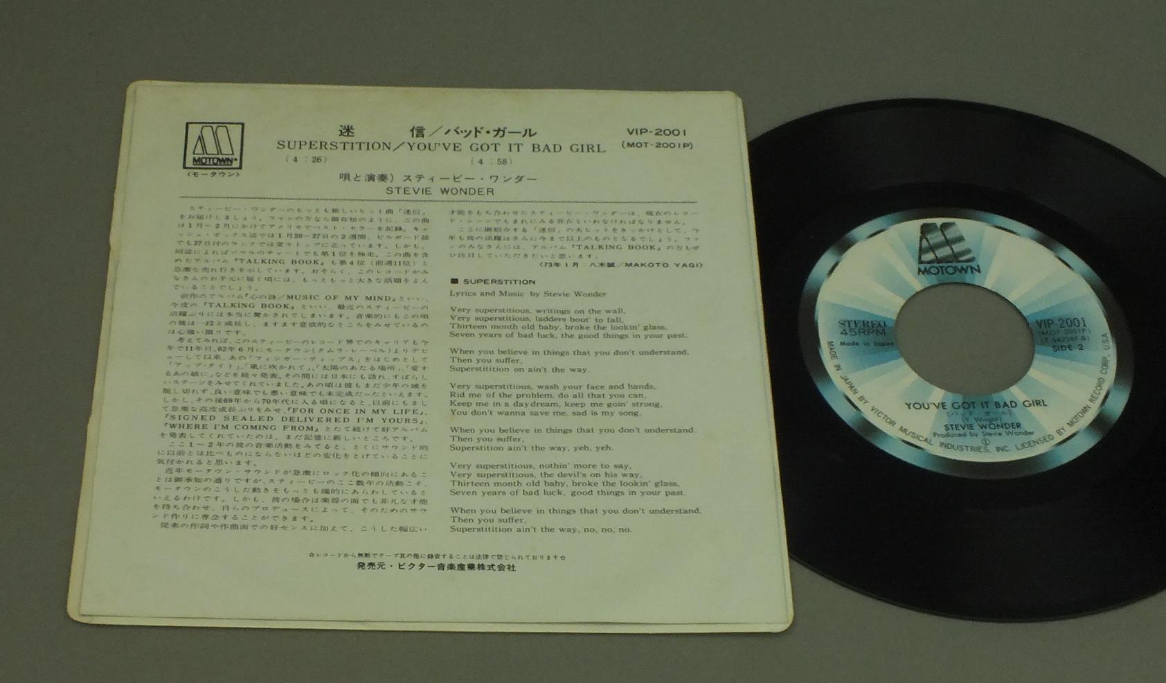 STEVIE WONDERスティービー・ワンダー/SUPERSTITION迷信 VIP2001 製造国:日本盤 / Media:7inch外観:EX盤の状態:EX+ 価格(税込):¥550(売約済) 送料 7inch:定形外郵便 360円~LP:定形外郵便 660円~送料は、注文の最終画面で確認頂けます。 > > STEVIE WONDER/SUPERSTITION 外観 (EX)特記事項:ヨレやシミ。外観EXの共通説明:ダメージが限定的。中古品としては保存状態がよい方。シミ、ヨゴレ、スレ 少し~軽度。 盤の状態 (EX+)特記事項:薄いスリキズ・スレ少し。一見してきれいな状態です。盤EX+の共通説明:盤面の極薄いスリキズ、スレ少し程度 音に出そうなものは無いように見える(極軽微なソフトティック音は除く)。 Tweet それぞれの画像をクリックすると、大きい写真が見られます こちらの商品もお勧めです 1,210円 TEMPTATIONSテンプテーションズ / SURFACE THRILLSサーフィス・スリル 1,210円 VAN McCOYバン・マッコイ / MY FEVORITE FANTASYマイ・フェバリット・ファンタジー 770円 RAY GOODMAN & BROWNレイ、グッドマン&ブラウン / OPEN UPこの愛に気づいたら 770円 DIANA ROSSダイアナ・ロス / WHY DO FOOLS FALL IN LOVEファースト・レディ 990円 SPINNERSスピナーズ / SPINNERS 8スピナーズ・エイト 660円 STEVIE WONDER / IN SQUARE CIRCLE 770円 WRITERS / WRITERSニュー・リズム・マシーン登場 1,210円 TAVARESタバレス / NEW DIRECTIONS二人だけのバラード