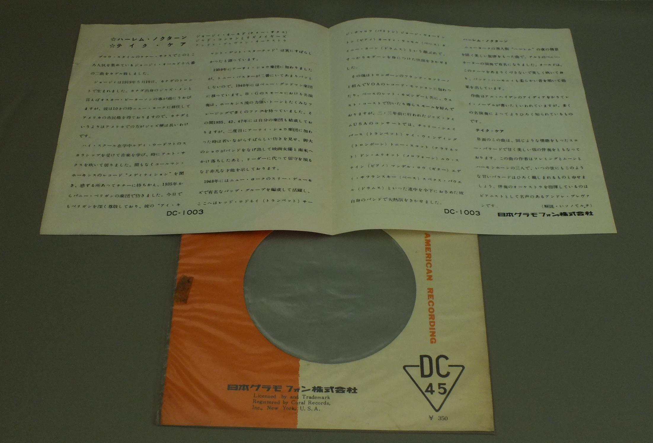 GEORGE AULDジョージィ・オールド/HARLEM NOCTURNEハーレム・ノクターン DC1003 製造国:日本盤 / Media:7inch外観:EX-盤の状態:VG+ 価格(税込):¥330(売約済) 送料 7inch:定形外郵便 360円~LP:定形外郵便 660円~送料は、注文の最終画面で確認頂けます。 > > GEORGE AULD/HARLEM NOCTURNE 外観 (EX-)特記事項:ヨレやシミ。見開き側にわずかに破れ有り。外観EX-の共通説明:ダメージ軽度~多少。 中古品としては普通の状態。シミ、ヨゴレ、スレなど軽く~多少。 盤の状態 (VG+)特記事項:薄いスリキズ・細かいスレ多少。プチ出そうな小キズ、線キズも有ります。少し聴いてみましたが、音自体はしっかりクリアーに鳴っているようでした。盤VG+の共通説明:盤面にスリキズが多少~やや有り、音に出そうなものも多少ある。 Tweet それぞれの画像をクリックすると、大きい写真が見られます こちらの商品もお勧めです 1,210円 DEREK SMITHディレク・スミス / NEW SOILニュー・ソワール 1,320円 SUNSET ALL STARSサンセット・オール・スターズ / JAMMIN` AT SUNSET VOL.2ジャミン・アット・サンセット 第2集 1,210円 HERBIE MANNハービー・マン / GLORY OF LOVEグローリー・オブ・ラヴ 990円 BILL HOLMANビル・ホルマン / BIG BAND IN A JAZZ ORBITビッグ・バンド・イン・ア・ジャズ・オービット 770円 BRUCE FORMANブルース・フォアマン / COAST TO COASTコースト・トゥ・コースト 990円 MEL POWELLメル・パウエル / OUT ON A LIMBアウト・オン・ア・リム 1,320円 SONNY CLARK TRIOソニー・クラーク・トリオ / SAME TITEL 1,320円 SUPER JAZZ TRIOスーパー・ジャズ・トリオ / THE STANDARDザ・スタンダード