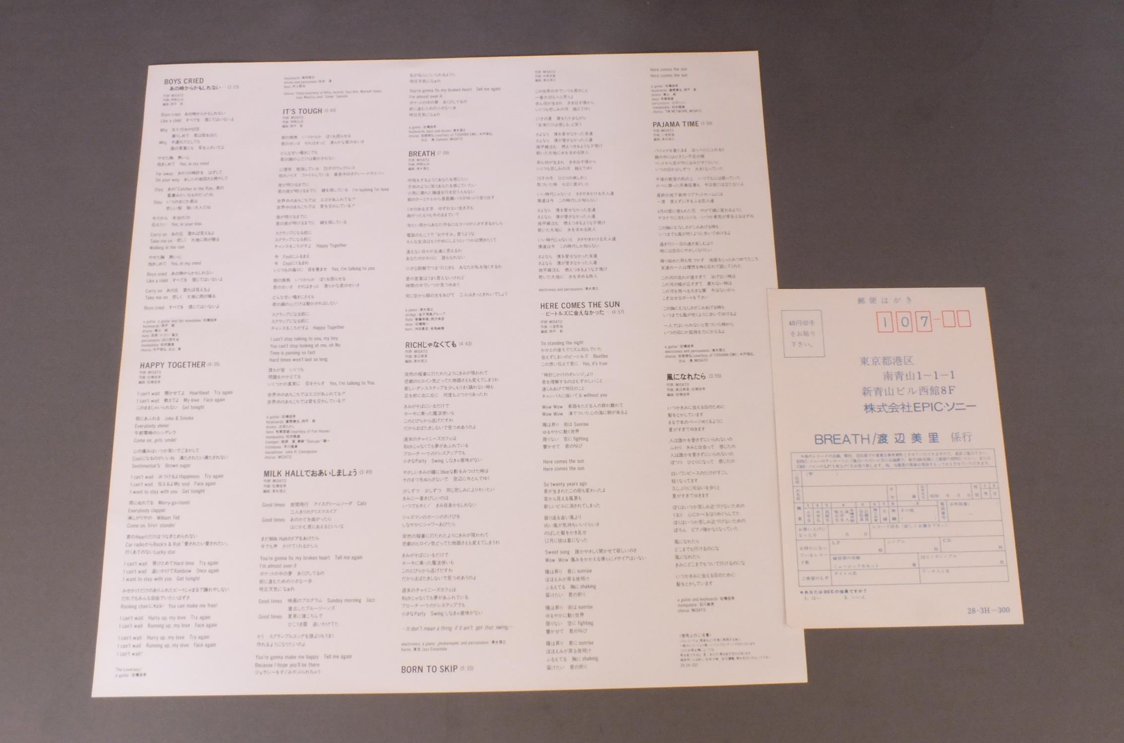 MISATO WATANABE渡辺美里/BREATH 28・3H300 製造国:日本盤 / Media:LP外観:EX+盤の状態:EX 価格(税込):¥1,848(売約済) 送料 7inch:定形外郵便 360円~LP:定形外郵便 660円~送料は、注文の最終画面で確認頂けます。 > > MISATO WATANABE/BREATH 外観 (EX+)特記事項:特記なし。外観EX+の共通説明:中古としては美品、一見してきれいでダメージが軽微。シミ、ヨゴレ、スレ有っても僅か~少し。 盤の状態 (EX)特記事項:薄いスリキズ・スレ軽くある感じ。殆どが軽微なものの様子です。盤EXの共通説明:盤面のスリキズが薄いものが少し~軽度 音に出そうなものは無いように見える(軽微なソフトティック音は除く)。 Tweet それぞれの画像をクリックすると、大きい写真が見られます こちらの商品もお勧めです 1,320円 CHA-CHAチャ・チャ / HITOMI NO-NAKA-NO TAKARAJIMA瞳の中の宝島 770円 TAKURO YOSHIDA吉田拓郎 / ONLY YOU-SINCE COMING FOR LIFEオンリー・ユー 440円 MASASHI SADAさだまさし / YUME NO WADACHI夢の轍 1,210円 SNAKEMAN SHOWスネークマン・ショー / 急いで口で吸え! 770円 GO OHGAMI大神剛 / SLEEPING THE TOWN 770円 YUMING松任谷由実 / RINCARNATIONリ・インカーネイション 990円 YOSHIMI IWASAKI岩崎良美 / KOKORO NO ATELIER心のアトリエ 770円 TAKURO YOSHIDAよしだたくろう / HELLO! I`M TAKURO YOSHIDA元気です。