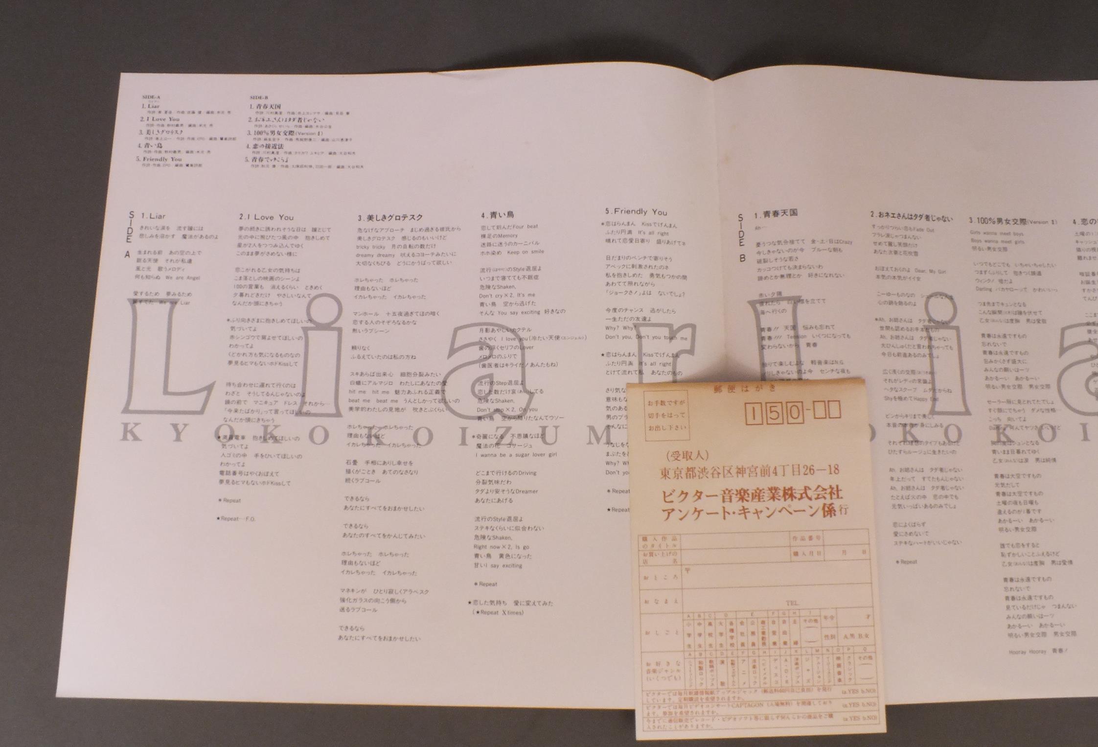 KYOKO KOIZUMI小泉今日子/LIARライアー SJX30300 製造国:日本盤 / Media:LP外観:EX+盤の状態:EX 価格(税込):¥770(売約済) 送料 7inch:定形外郵便 360円~LP:定形外郵便 660円~送料は、注文の最終画面で確認頂けます。 > > KYOKO KOIZUMI/LIAR 外観 (EX+)特記事項:特記なし。外観EX+の共通説明:中古としては美品、一見してきれいでダメージが軽微。シミ、ヨゴレ、スレ有っても僅か~少し。 盤の状態 (EX)特記事項:薄いスリキズ・スレ少しある感じ。一見してきれいな感じです。盤EXの共通説明:盤面のスリキズが薄いものが少し~軽度 音に出そうなものは無いように見える(軽微なソフトティック音は除く)。 Tweet それぞれの画像をクリックすると、大きい写真が見られます こちらの商品もお勧めです 770円 SEIKO MATSUDA松田聖子 / SEIKO TOWN 440円 ERI E-AREA新田恵利 / ERI E-AREA 550円 SONOKO KAWAI河合その子 / SONOKOその子 770円 YUKO ISHIKAWA石川優子 / YUKO TOKIMEKU-KORO優子ときめくころ 1,210円 PINK LADYピンク・レディー / AMERICA ! AMERICA ! AMERICA !アメリカ!アメリカ!アメリカ! 770円 YUKO ISHIKAWA石川優子 / REN`AI-KODOKU-JIN恋愛孤独人 770円 NAOKO KAWAI河合奈保子 / NAOKO IN CONCERT河合奈保子 カナリー・コンサート PART 2 770円 SHOKO SAWADA沢田聖子 / 1st ALBUM坂道の少女
