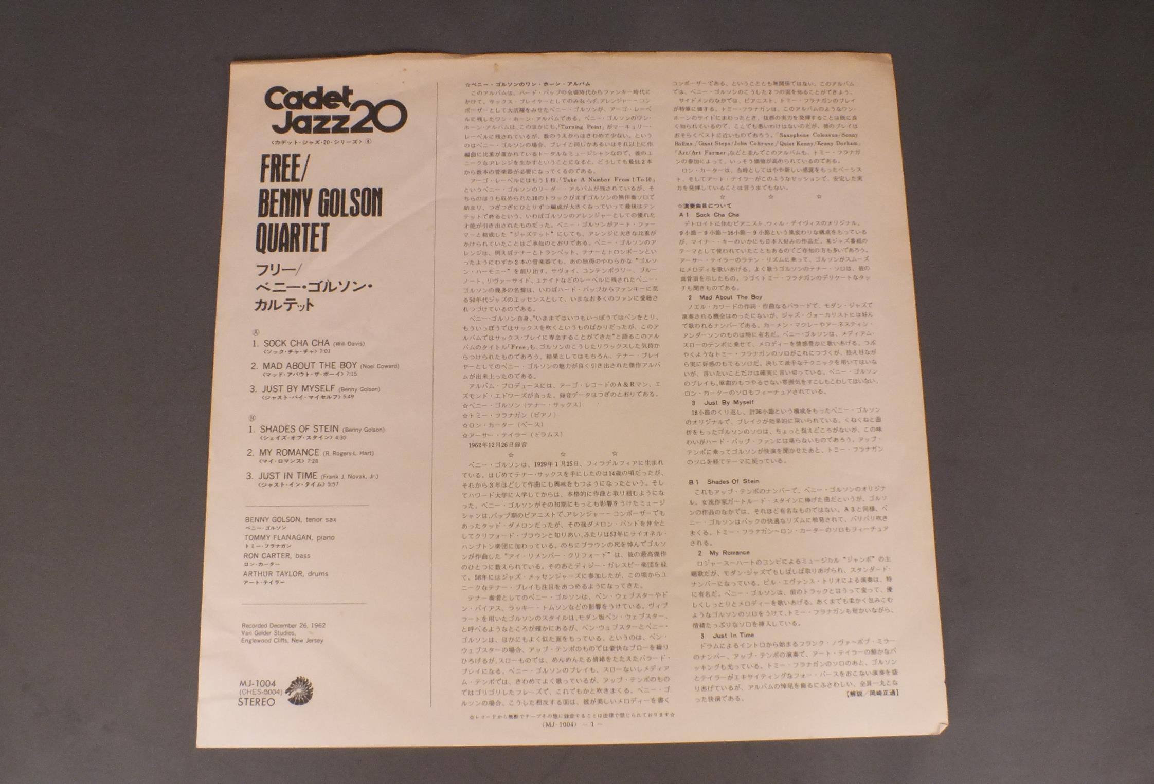 BENNY GOLSON QUARTETベニー・ゴルソン・カルテット/FREEフリー MJ1004 製造国:日本盤 / Media:LP外観:VG+盤の状態:EX-帯:EX- 価格(税込):¥990(売約済) 送料 7inch:定形外郵便 360円~LP:定形外郵便 660円~送料は、注文の最終画面で確認頂けます。 > > BENNY GOLSON QUARTET/FREE 外観 (VG+)特記事項:シミ有り外観VG+の共通説明:ダメージやや有り。シミ、ヨゴレ、スレなど多少~やや多め。 盤の状態 (EX-)特記事項:盤に薄いくもり、シミ有り。スクラッチ系のノイズは静かな所で有る様子。音はクリアーです。盤EX-の共通説明:盤面のスリキズが多少有り。音に出そうなものは殆ど無いように見える~さほど気にならないぐらいの軽いプチ数カ所程度。 帯の状態 (EX-):シミ有り Tweet それぞれの画像をクリックすると、大きい写真が見られます こちらの商品もお勧めです 440円 MOE KOFFMAN / GOES ELECTRIC 770円 CHICK COREAチック・コリア / PIANO IMPROVISATIONS VOL1チック・コリア・ソロ VOL1 990円 SHOJI SUZUKI & HIS RHYTHM ACES鈴木章治とリズム・エース / SUZUKAKE NO MICHI新・鈴懸の径 1,210円 BUCK CLAYTON SEPTETバック・クレイトン / BUCKIN` THE BLUESバッキン・ザ・ブルース 990円 ISAO SASAKIイサオ・ササキ / AUTUMN SERENADEオータム・セレナーデ 1,980円 EIJI KITAMURA北村英治 / APRIL DATE ( MASTER SOUND PRESSING )エイプリル・デイト (マスターサウンド盤) 770円 SONYA ROBINSONソニア・ロビンソン / SONYAソニア 990円 TERUMASA HINO日野皓正 / JOURNEY INTO MY MIND