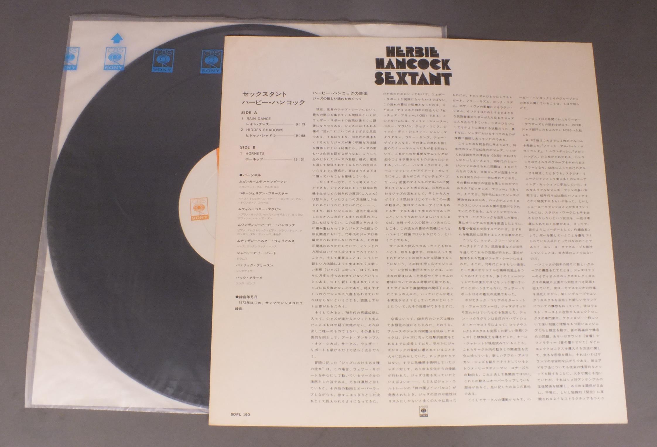 HERBIE HANCOCKハービー・ハンコック/SEXTANTセックスタント SOPL190 製造国:日本盤 / Media:LP外観:EX盤の状態:EX+ 価格(税込):¥2,586(売約済) 送料 7inch:定形外郵便 360円~LP:定形外郵便 660円~送料は、注文の最終画面で確認頂けます。 > > HERBIE HANCOCK/SEXTANT 外観 (EX)特記事項:特記なし。外観EXの共通説明:ダメージが限定的。中古品としては保存状態がよい方。シミ、ヨゴレ、スレ 少し~軽度。 盤の状態 (EX+)特記事項:極薄いスリキズ・スレ少し。一見してきれいな状態です。盤EX+の共通説明:盤面の極薄いスリキズ、スレ少し程度 音に出そうなものは無いように見える(極軽微なソフトティック音は除く)。 Tweet それぞれの画像をクリックすると、大きい写真が見られます こちらの商品もお勧めです 1,210円 EARL KLUGHアール・クルー / LOW RIDEロー・ライド 1,210円 CRUSADERSクルセイダーズ / GHETTO BLLASTERゲットー・プラスター 1,210円 ERNIE WATTSアーニー・ワッツ / CHARIOTS OF FIRE炎の走者 1,210円 WEATHER REPORTウェザー・リポート / TALE SPINNIN`幻祭夜話 440円 YUTAKA TOBE戸部豊 / TRUMPET 1,320円 STANLEY JORDANスタンリー・ジョーダン / FLYING HOMEフライング・ホーム 1,210円 MEZZOFORTEメゾフォルテ / CATCHING UP WITH MEZZOFORTEミッドナイト・エクスプレス 1,650円 TAKASHI KAKO加古隆 / TOSCANINI EDITIONAソロ・コンサート