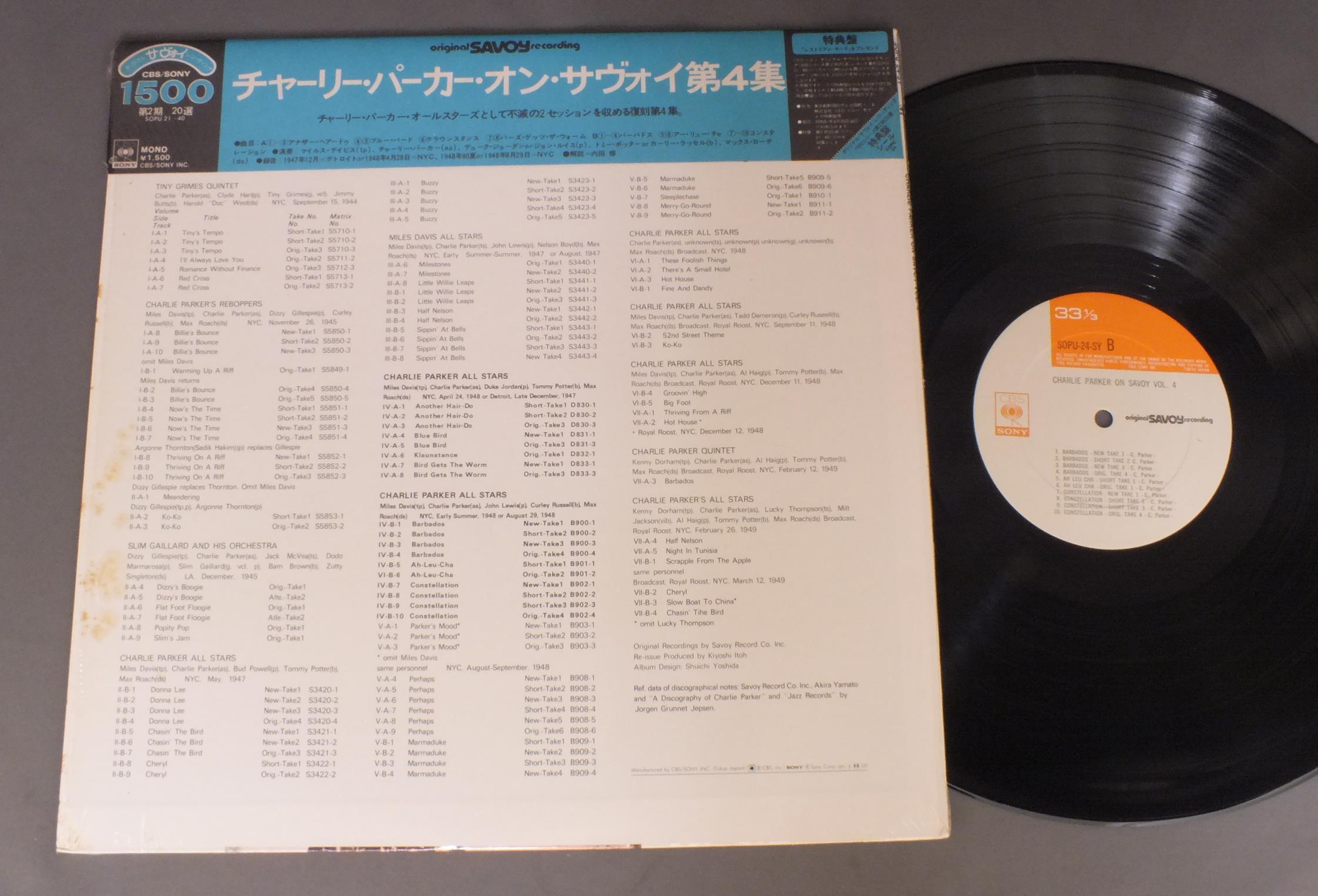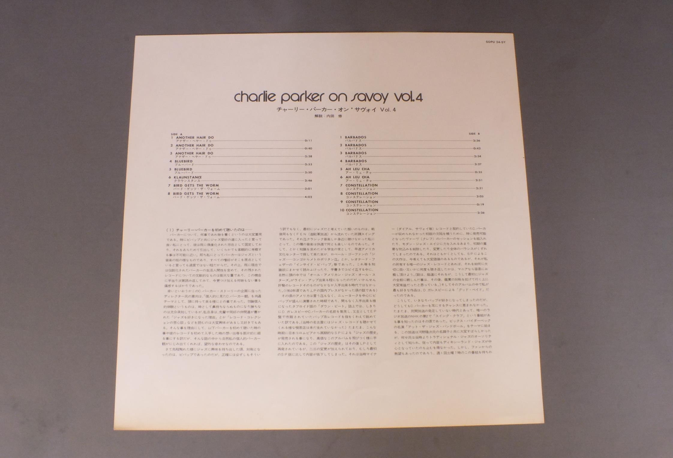 CHARLIE PARKERチャーリー・パーカー/CHARLIE PARKER ON SAVOY VOL4オン・サヴォイ第4集 SOPU24SY 製造国:日本盤 / Media:LP外観:VG+盤の状態:EX帯:EX 価格(税込):¥550(売約済) 送料 7inch:定形外郵便 360円~LP:定形外郵便 660円~送料は、注文の最終画面で確認頂けます。 > > CHARLIE PARKER/CHARLIE PARKER ON SAVOY VOL4 外観 (VG+)特記事項:シミ有り外観VG+の共通説明:ダメージやや有り。シミ、ヨゴレ、スレなど多少~やや多め。 盤の状態 (EX)特記事項:薄いスリキズ・スレ軽くある感じ。軽微なものの様子です。盤EXの共通説明:盤面のスリキズが薄いものが少し~軽度 音に出そうなものは無いように見える(軽微なソフトティック音は除く)。 帯の状態 (EX):特記なし。 Tweet それぞれの画像をクリックすると、大きい写真が見られます こちらの商品もお勧めです 1,210円 EARL HINESアール・ハインズ / SPONT ANEOUS EXPLORATIONSアール・ハインズ・ソロ・ピアノ 1,210円 CLIFORD BROWN ALL STARSクリフォード・ブラウン・オール・スターズ / CARAVAN AUTUMN IN NEW YORKキャラバン 1,320円 SADAO WATANABE & CHARLIE MARIANO渡辺貞夫&チャーリー・マリアーノ / IBERIAN WALTZイベリアン・ワルツ 770円 AIRTOアイアート・モレイラ / FREEフリー 2,640円 EDDIE CONDON ALL STARSエディ・コンドン・オール・スターズ / EDDIE CONDON ALL STARS 1945 5LP BOX SETエディ・コンドン・オール・スターズ1945 5枚組 1,650円 MODERN JAZZ QUARTETモダン・ジャズ・カルテット / CONCORDEコンコルド・デラックス 1,650円 MASABUMI KIKUCHI + GIL EVANS菊池雅章 / SAME TITLEWITH ギル・エヴァンス 1,210円 PHIL WOODS & GENE QUILL QUINTETフィル・アンド・クイル5重奏団 / PHIL & QUILL WITH PRESTIGEフィル・アンド・クイル