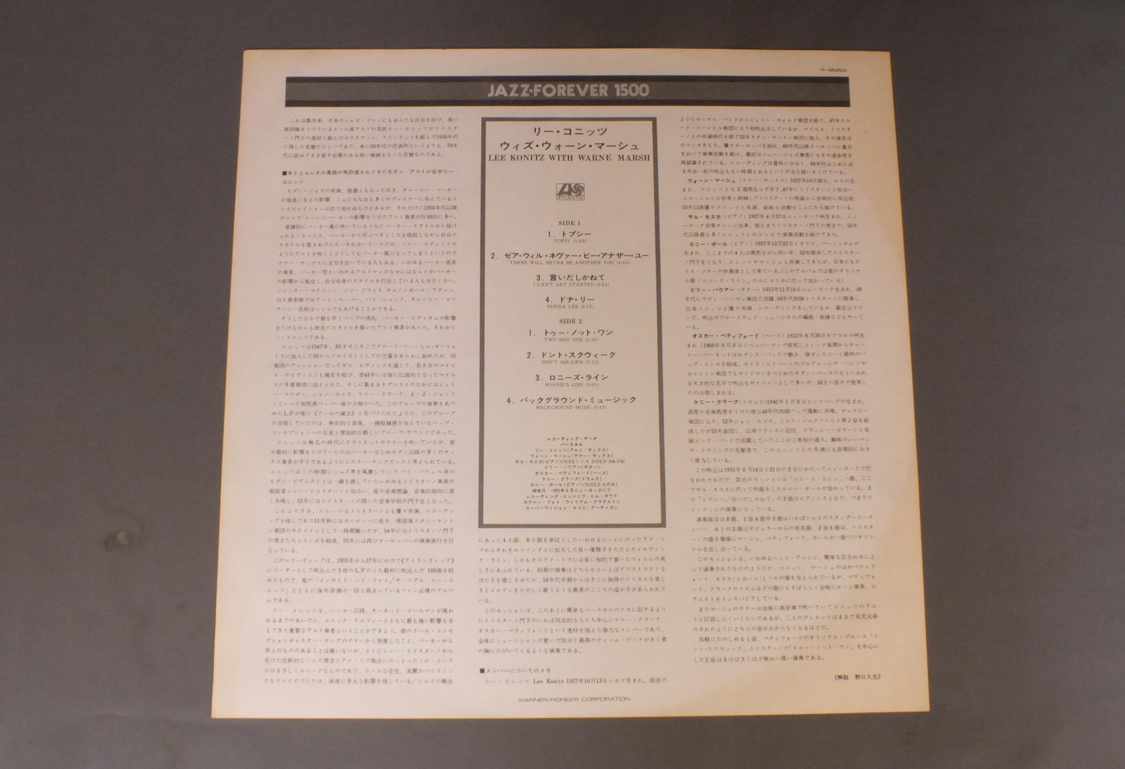 LEE KONITZ WITH WARNE MARSHリー・コニッツ・ウィズ・ウォーン・マーシュ/LEE KONITZ WITH WARNE MARSHリー・コニッツ・ウィズ・ウォーン・マーシュ P4549A 製造国:日本盤 / Media:LP外観:EX-盤の状態:EX 価格(税込):¥1,100(売約済) 送料 7inch:定形外郵便 360円~LP:定形外郵便 660円~送料は、注文の最終画面で確認頂けます。 > > LEE KONITZ WITH WARNE MARSH/LEE KONITZ WITH WARNE MARSH 外観 (EX-)特記事項:角やヘリのスレ有り。付属品を含めてシミ有り。外観EX-の共通説明:ダメージ軽度~多少。 中古品としては普通の状態。シミ、ヨゴレ、スレなど軽く~多少。 盤の状態 (EX)特記事項:薄いスリキズ・スレ軽くある感じ。軽微なものの様子です。盤EXの共通説明:盤面のスリキズが薄いものが少し~軽度 音に出そうなものは無いように見える(軽微なソフトティック音は除く)。 Tweet それぞれの画像をクリックすると、大きい写真が見られます こちらの商品もお勧めです 770円 BUDDY RICHバディ・リッチ / DIFFERENT DRUMMERディファレント・ドラマー 1,210円 WYNTON KELLYウイントン・ケリー / KELLY BLUEケリー・ブルー 1,320円 THE QUINTETパーカー - ガレスピー - パウエル - ローチ - ミンガス / JAZZ AT MASSEY HALLジャズ・アット・マッセイ・ホール 990円 ISAO SASAKIイサオ・ササキ / AUTUMN SERENADEオータム・セレナーデ 1,650円 McOY TYNERマッコイ・タイナー / SONG OF THE NEW WORLDソング・オブ・ザ・ニュー・ワールド 770円 AIRTOアイアート・モレイラ / FREEフリー 1,210円 BINGO MIKI & INNER GALAXY ORCHESTRA三木敏悟&インナー・ギャラクシー・オーケストラ / EVE(EIGHT LETTERS)出航前夜-一通の手紙 990円 HI-LO`Sハイ・ローズ / BACK AGAINバック・アゲイン