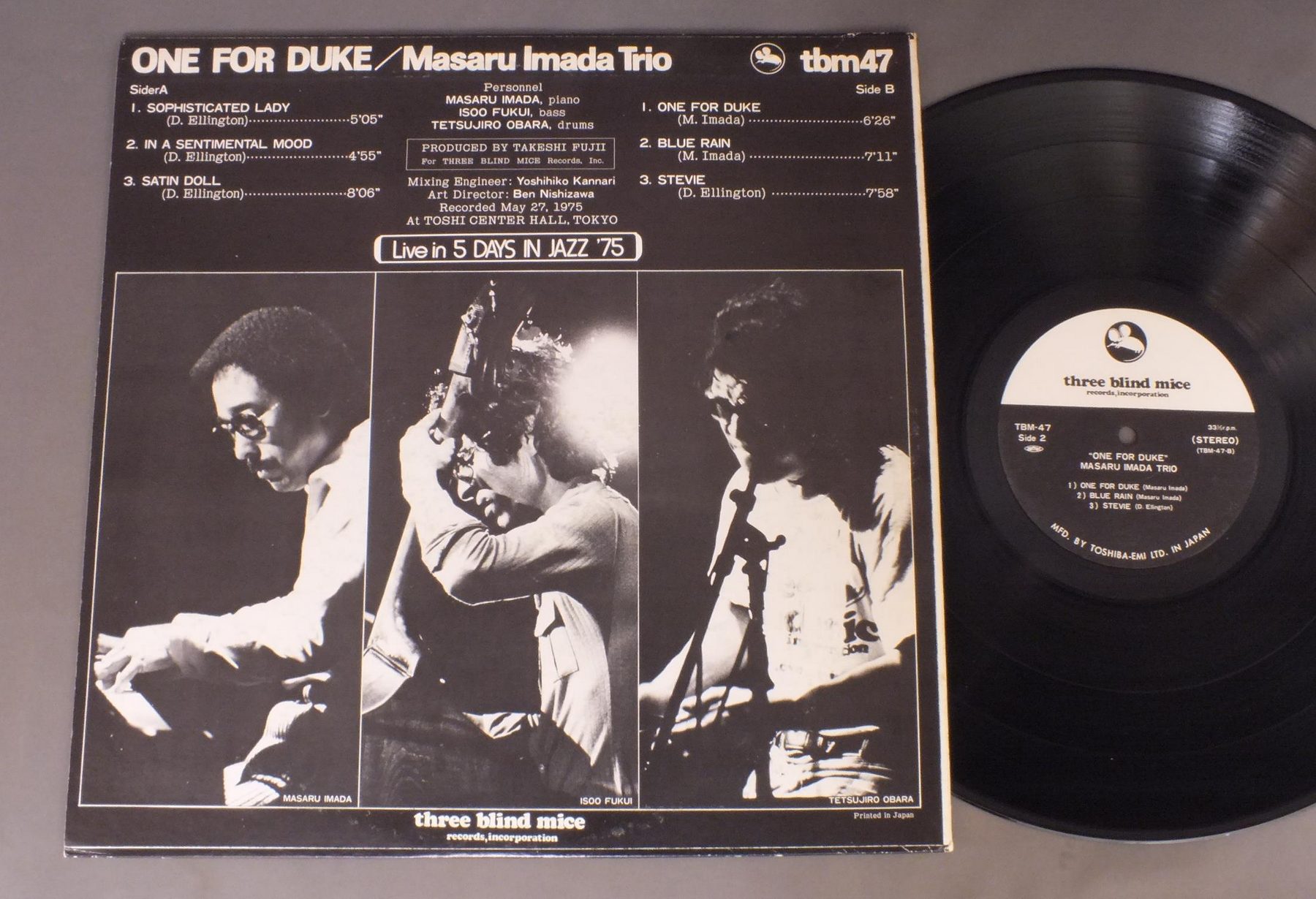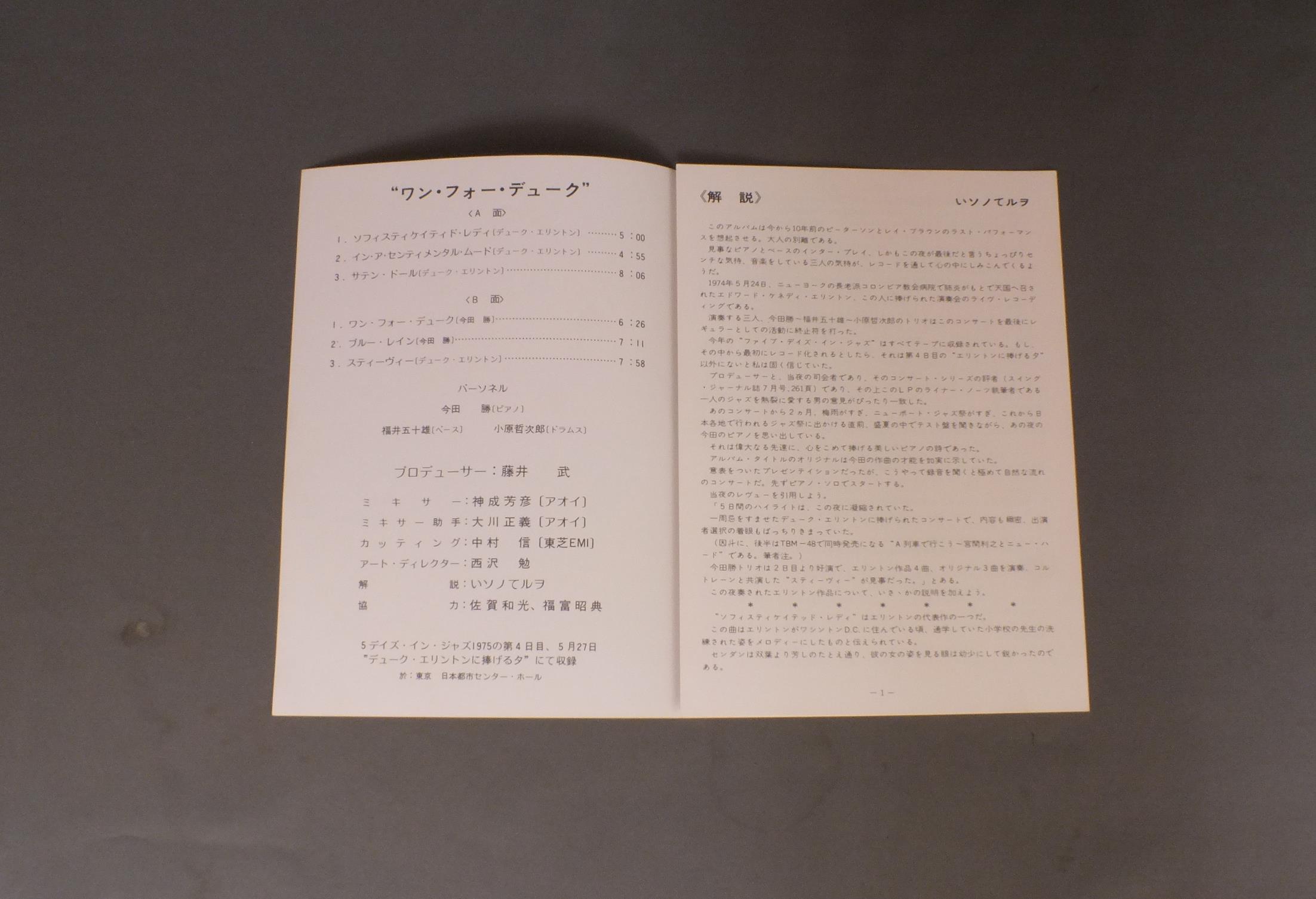 MASARU IMADA TRIO今田勝トリオ/ONE FOR DUKEワン・フォー・ヂューク TBM47 製造国:日本盤 / Media:LP外観:EX-盤の状態:EX 価格(税込):¥3,045(売約済) 送料 7inch:定形外郵便 360円~LP:定形外郵便 660円~送料は、注文の最終画面で確認頂けます。 > > MASARU IMADA TRIO/ONE FOR DUKE 外観 (EX-)特記事項:角やヘリのスレ有り。外観EX-の共通説明:ダメージ軽度~多少。 中古品としては普通の状態。シミ、ヨゴレ、スレなど軽く~多少。 盤の状態 (EX)特記事項:薄いスリキズ・スレ軽くある感じ。軽微なものの様子です。盤EXの共通説明:盤面のスリキズが薄いものが少し~軽度 音に出そうなものは無いように見える(軽微なソフトティック音は除く)。 Tweet それぞれの画像をクリックすると、大きい写真が見られます こちらの商品もお勧めです 770円 RON CARTERロン・カーター / RON CARTERロン・カーター 660円 KAZUMI BAND香津美バンド / TALK YOU ALL TIGHT頭狂好児唐眼 990円 HERBIE MANNハービー・マン / GLORY OF LOVEグローリー・オブ・ラヴ 1,320円 McCOY TYNERマッコイ・タイナー / ECHOES OF A FRIENDエコーズ・オブ・ア・フレンド 1,650円 NORIO MAEDA前田憲男 / SOUND IN VICTRONSOUND IN VICTRON 1,320円 EDDIE COSTA TRIOエディ・コスタ・トリオ / HOUSE OF BLUE LIGHTSハウス・オブ・ブルー・ライツ 1,210円 EUGEN CICEROオイゲン・キケロ・トリオ / ROKOKO-JAZZロココ・ジャズ 1,320円 MODERN JAZZ QUARTETMJQ / BASED ON BACH & THE BLUESバッハとブルースを基に