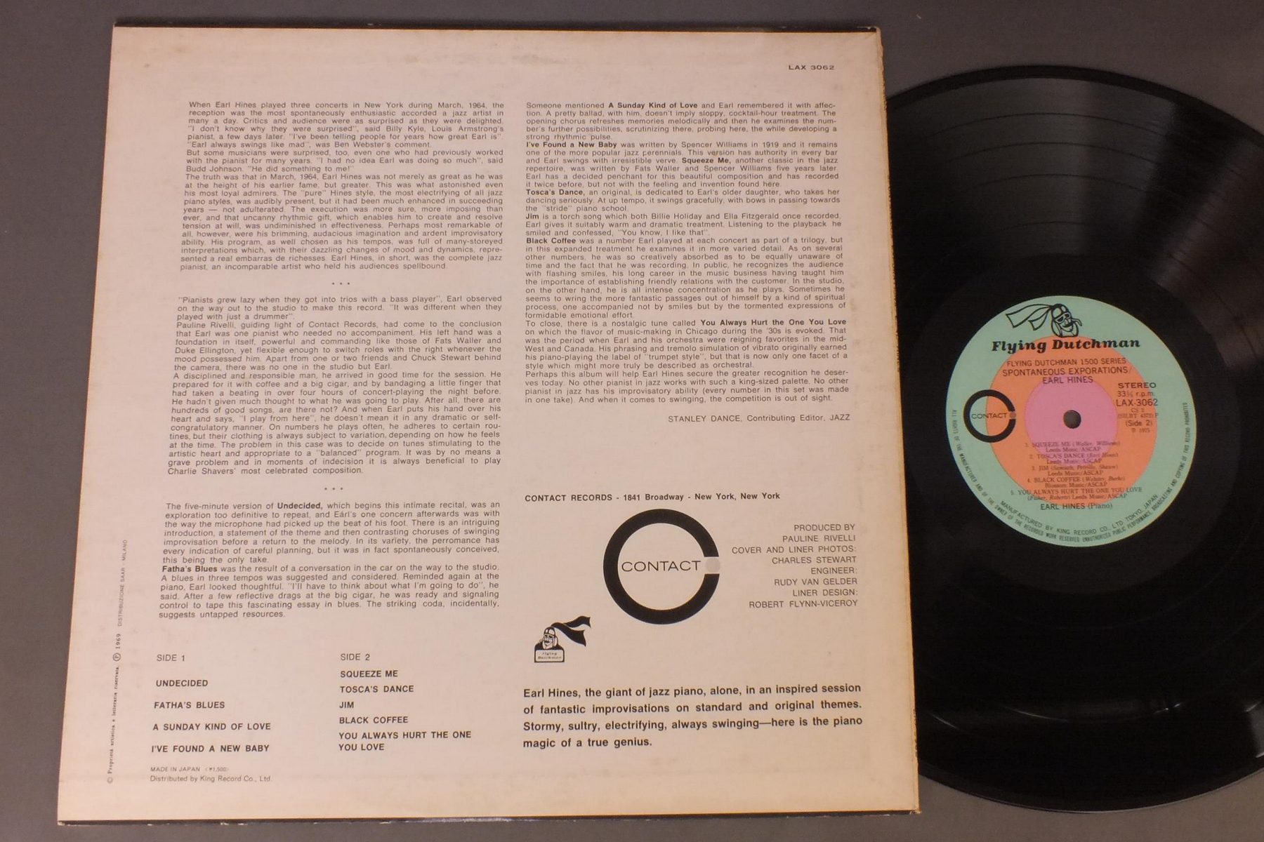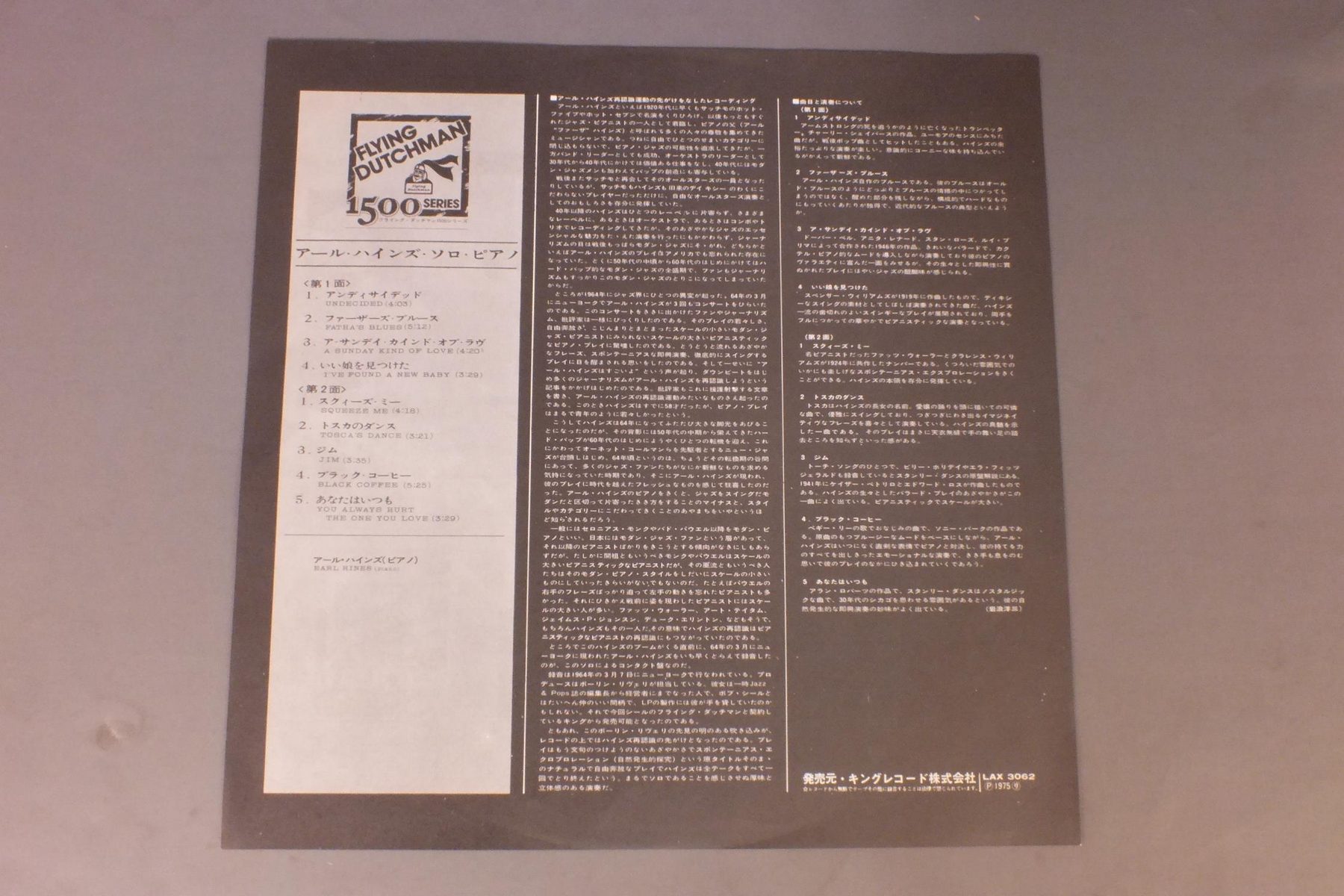 EARL HINESアール・ハインズ/SPONTANEOUS EXPLORATIONSアール・ハインズ・ソロ・ピアノ LAX3062 製造国:日本盤 / Media:LP外観:VG+盤の状態:EX+ 価格(税込):¥440(売約済) 送料 7inch:定形外郵便 360円~LP:定形外郵便 660円~送料は、注文の最終画面で確認頂けます。 > > EARL HINES/SPONTANEOUS EXPLORATIONS 外観 (VG+)特記事項:背や上下ヘリスレ有り。裏ジャケにスレよごれ。外観VG+の共通説明:ダメージやや有り。シミ、ヨゴレ、スレなど多少~やや多め。 盤の状態 (EX+)特記事項:薄いスリキズ・スレ少し。一見してきれいな状態です。盤EX+の共通説明:盤面の極薄いスリキズ、スレ少し程度 音に出そうなものは無いように見える(極軽微なソフトティック音は除く)。 Tweet それぞれの画像をクリックすると、大きい写真が見られます こちらの商品もお勧めです 1,210円 DUKE ELLINGTON WITH JIMMY JONESデューク・エリントン & ジミー・ジョーンズ / DUKE ELLINGTON`S MY PEOPLEマイ・ピープル 1,210円 MODERN JAZZ QUARTETMJQ / ART OF THE MODERN JAZZ QUARTETアート・オブ・MJQ 2,640円 EDDIE CONDON ALL STARSエディ・コンドン・オール・スターズ / EDDIE CONDON ALL STARS 1945 5LP BOX SETエディ・コンドン・オール・スターズ1945 5枚組 1,320円 LOUIS ARMSTRONG & HIS ALL-STARSルイ・アームストロング・オールスターズ / PLAYS W.C.HANDYプレイズ・W.C.ハンディ 990円 STANLEY JORDAN / MAGIC TOUCH 770円 GEORGE LEWISジョージ・ルイス / AT CLUB HANGOVER VOL1アット・クラブ・ハングオーヴァー VOL1 1,210円 EDDIE CONDONエディ・コンドン楽団 / ERA OF CONDON JAZZ栄光のコンドン・ジャズ 990円 TAKEHIKO HONDA本田竹彦 / JODO浄土