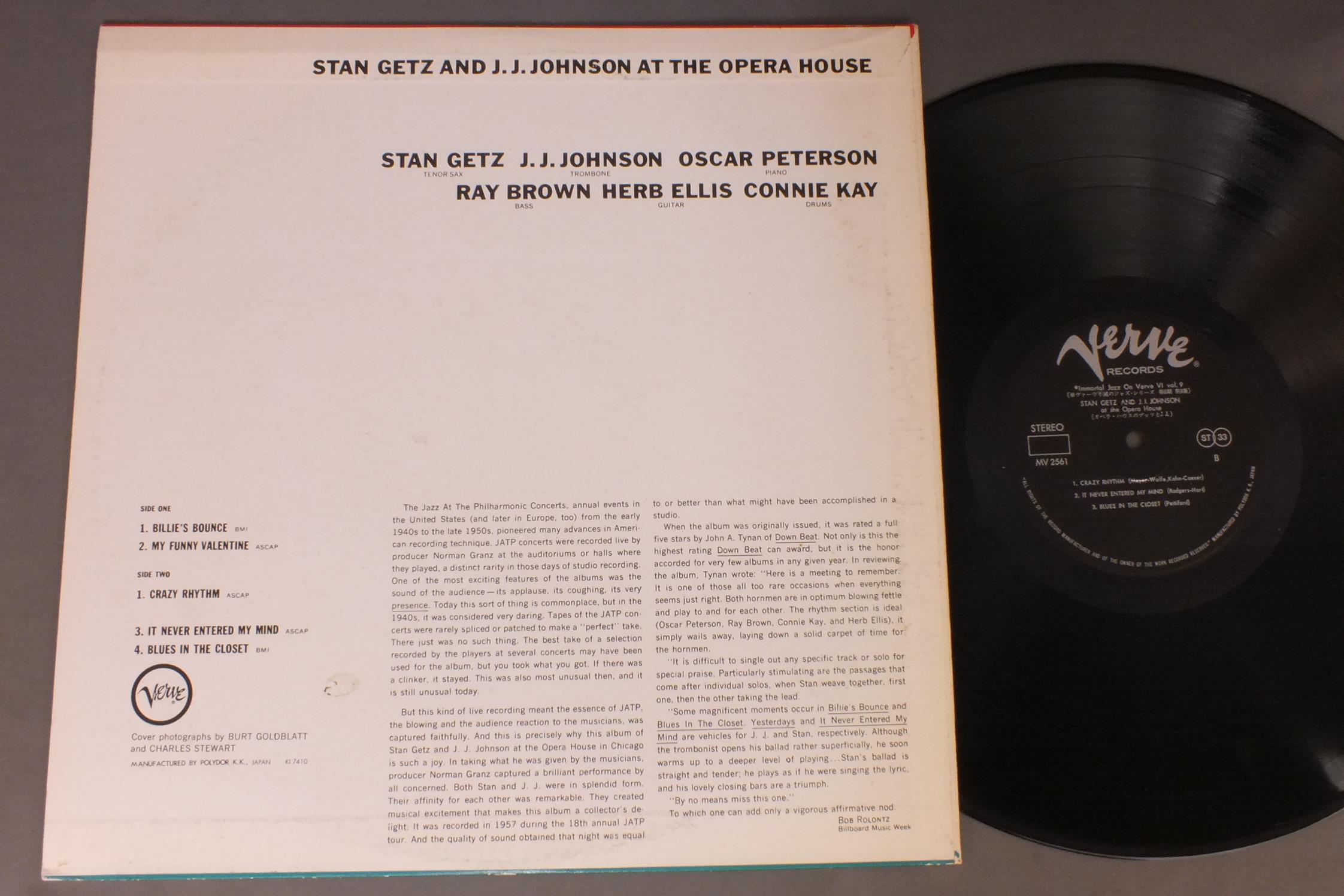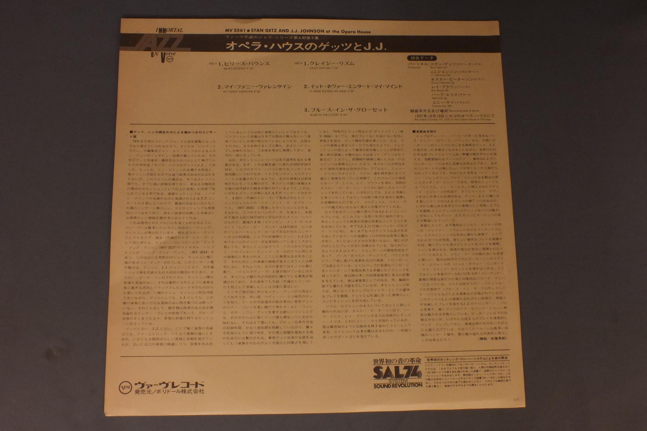 STAN GETZ - J.J.JOHNSON etcスタン・ゲッツ - J.J.ジョンソン他/STAN GETZ AND J.J.JOHNSON AT THE OPERA HOUSEオペラハウスのゲッツとJ.J. MV2561 製造国:日本盤 / Media:LP外観:EX-盤の状態:EX 価格(税込):¥2,333(売約済) 送料 7inch:定形外郵便 360円~LP:定形外郵便 660円~送料は、注文の最終画面で確認頂けます。 > > STAN GETZ - J.J.JOHNSON etc/STAN GETZ AND J.J.JOHNSON AT THE OPERA HOUSE 外観 (EX-)特記事項:背や上ヘリにスレ。裏ジャケにシミ有り。外観EX-の共通説明:ダメージ軽度~多少。 中古品としては普通の状態。シミ、ヨゴレ、スレなど軽く~多少。 盤の状態 (EX)特記事項:薄いスリキズ・スレ少しある感じ。一見してきれいな感じです。盤EXの共通説明:盤面のスリキズが薄いものが少し~軽度 音に出そうなものは無いように見える(軽微なソフトティック音は除く)。 Tweet それぞれの画像をクリックすると、大きい写真が見られます こちらの商品もお勧めです 1,320円 DOLLAR BRANDダラー・ブランド / AFRICAN PIANOアフリカン・ピアノ 1,210円 SONNY ROLLINS / PLAYS 770円 HAL McKUSICKハル・マジック / JAZZ WORKSHOPジャズ・ワークショップ 990円 DAVE GRUSINデイヴ・グルーシン / ONE OF A KINDデイヴ・グルーシン・ジェントル・サウンド 1,980円 MIROSLAV VITOUSミロスラフ・ヴィトウス / INFINITE SEARCH限りなき探究 990円 BILL HOLMANビル・ホルマン / BIG BAND IN A JAZZ ORBITビッグ・バンド・イン・ア・ジャズ・オービット 770円 THAD JONES & MEL LEWISサド・ジョーンズ & メル・ルイス / LIVE IN TOKYOライブ・イン・東京 1,210円 ESQUIRE ALL STARS etc / FLYIN` ON A V-DISC (V-DISC ALL STAR JAZZ SESSIONS VOL2)フライン・オン・ア・Vディスク (Vディスク・オールスターズ第2集)