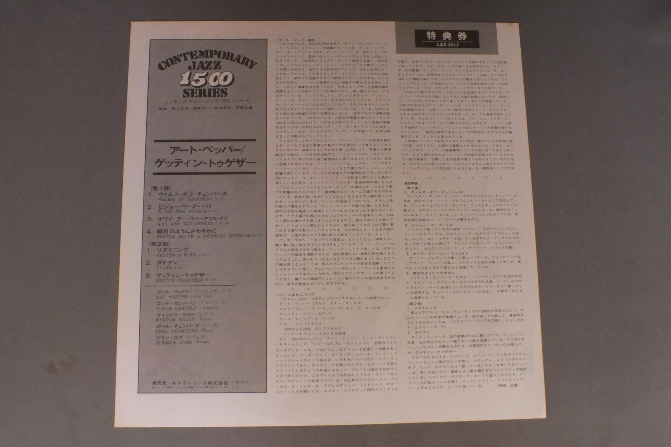 ART PEPPERアート・ペッパー/GETTING` TOGETHER !ゲッティン・トゥゲザー LAX3017 製造国:日本盤 / Media:LP外観:EX盤の状態:EX+ 価格(税込):¥1,100(売約済) 送料 7inch:定形外郵便 360円~LP:定形外郵便 660円~送料は、注文の最終画面で確認頂けます。 > > ART PEPPER/GETTING` TOGETHER ! 外観 (EX)特記事項:裏ジャケにスレよごれやシミ。外観EXの共通説明:ダメージが限定的。中古品としては保存状態がよい方。シミ、ヨゴレ、スレ 少し~軽度。 盤の状態 (EX+)特記事項:極薄いスリキズ・スレ少し。一見してきれいな状態です。盤EX+の共通説明:盤面の極薄いスリキズ、スレ少し程度 音に出そうなものは無いように見える(極軽微なソフトティック音は除く)。 Tweet それぞれの画像をクリックすると、大きい写真が見られます こちらの商品もお勧めです 1,210円 SONY CLARK TRIOソニー・クラーク・トリオ / SAME TITLEソニー・クラーク・トリオ 770円 TEDDY WILSONテディ・ウィルソン / THE TEDDY WILLSON 880円 WILTON FELDERウイルトン・フェルダー / WE ALL HAVE A STAR星の伝説 1,210円 ERIC DOLPHYエリック・ドルフィー / AT THE FIVE SPOTアット・ザ・5・スポットVOL2 770円 NORIO MAEDA前田憲男 / FEELINGSフィーリング 3,300円 EDDIE CONDON ALL STARSエディ・コンドン・オール・スターズ / EDDIE CONDON ALL STARS 1945 5LP BOX SETエディ・コンドン・オール・スターズ1945 5枚組 770円 TERUMASA HINO日野皓正 / DOUBLE RAINBOWダブル・レインボー 1,210円 CLIFORD BROWN ALL STARSクリフォード・ブラウン・オール・スターズ / CARAVAN AUTUMN IN NEW YORKキャラバン