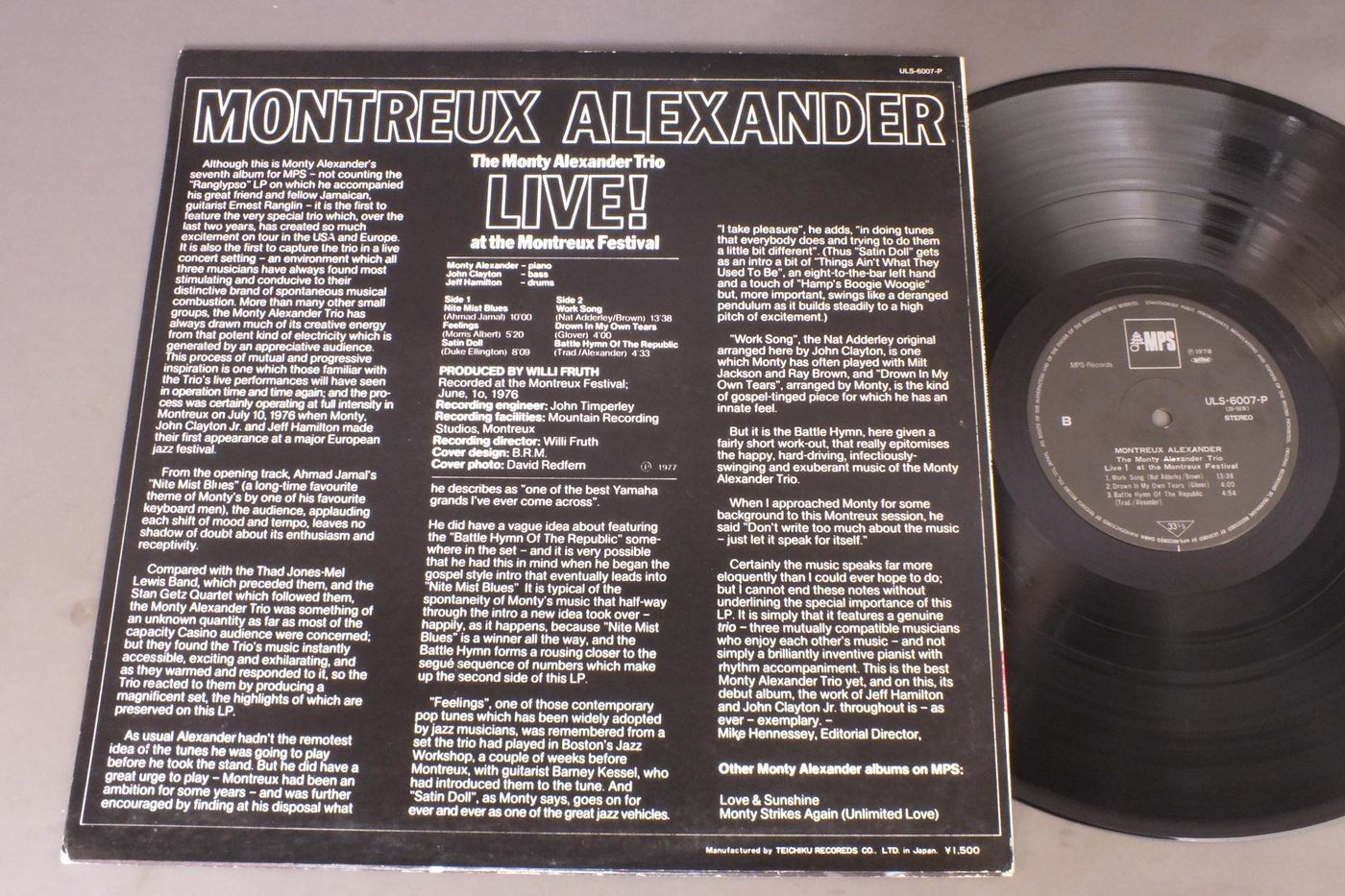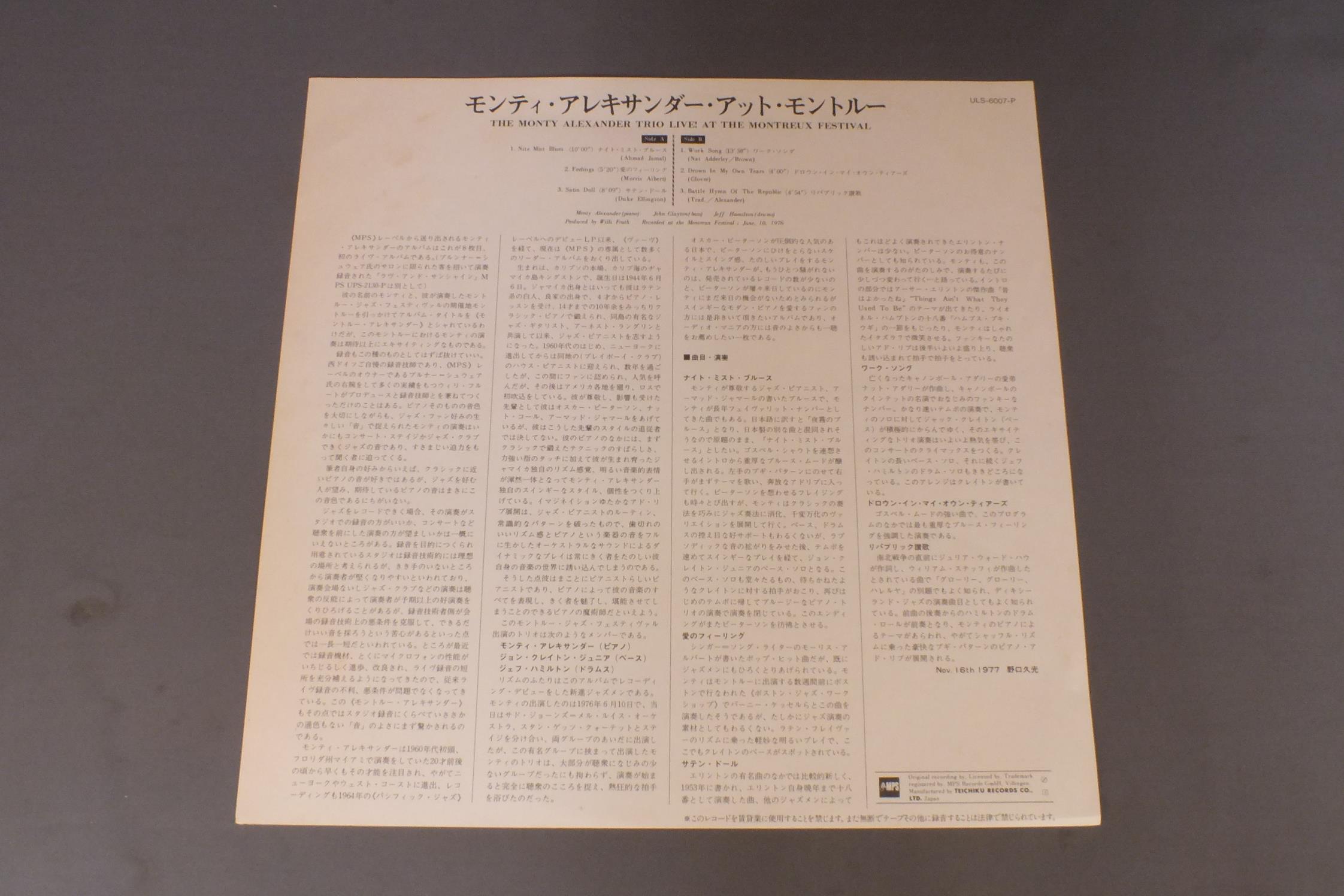 MONTY ALEXANDERモンティ・アレキサンダー/MONTY ALEXANDER TRIO LIVE! AT THE MONTREUX FESTIVALモンティ・アレキサンダー・アット・モントルー ULS6007P 製造国:日本盤 / Media:LP外観:EX-盤の状態:EX+ 価格(税込):¥1,100(売約済) 送料 7inch:定形外郵便 360円~LP:定形外郵便 660円~送料は、注文の最終画面で確認頂けます。 > > MONTY ALEXANDER/MONTY ALEXANDER TRIO LIVE! AT THE MONTREUX FESTIVAL 外観 (EX-)特記事項:背やヘリにスレ有り。外観EX-の共通説明:ダメージ軽度~多少。 中古品としては普通の状態。シミ、ヨゴレ、スレなど軽く~多少。 盤の状態 (EX+)特記事項:極薄いスリキズ・スレ少し。一見してきれいな状態です。盤EX+の共通説明:盤面の極薄いスリキズ、スレ少し程度 音に出そうなものは無いように見える(極軽微なソフトティック音は除く)。 Tweet それぞれの画像をクリックすると、大きい写真が見られます こちらの商品もお勧めです 1,210円 KARIN KROC & ARCHIE SHEPPカーリン・クローグ&アーチー・シェップ / HI-FLYハイ・フライ 1,210円 RANDY WESTON SEXTETランディー・ウエストン 六重奏団 / LITTLE NILESリトル・ナイルス - ランディー・ウエストンの芸術 990円 CHARLIE PARKERチャーリー・パーカー / CHARLIE PARKER ON SAVOY VOL6チャーリー・パーカー・オン・サヴォイVOL6 990円 BILL HOLMANビル・ホルマン / BIG BAND IN A JAZZ ORBITビッグ・バンド・イン・ア・ジャズ・オービット 1,210円 ERIC DOLPHYエリック・ドルフィー / LAST DATEラスト・レコーディング 880円 WILTON FELDERウイルトン・フェルダー / WE ALL HAVE A STAR星の伝説 440円 GARY BURTON - SONNY ROLLINS - CLARK TERRYG.バートン - S.ロリンズ - C.テリー / 3 IN JAZZスリー・イン・ジャズ 770円 HERBIE MANNハービー・マン / HOLD ON. I`M COMIN`ホールド・オン