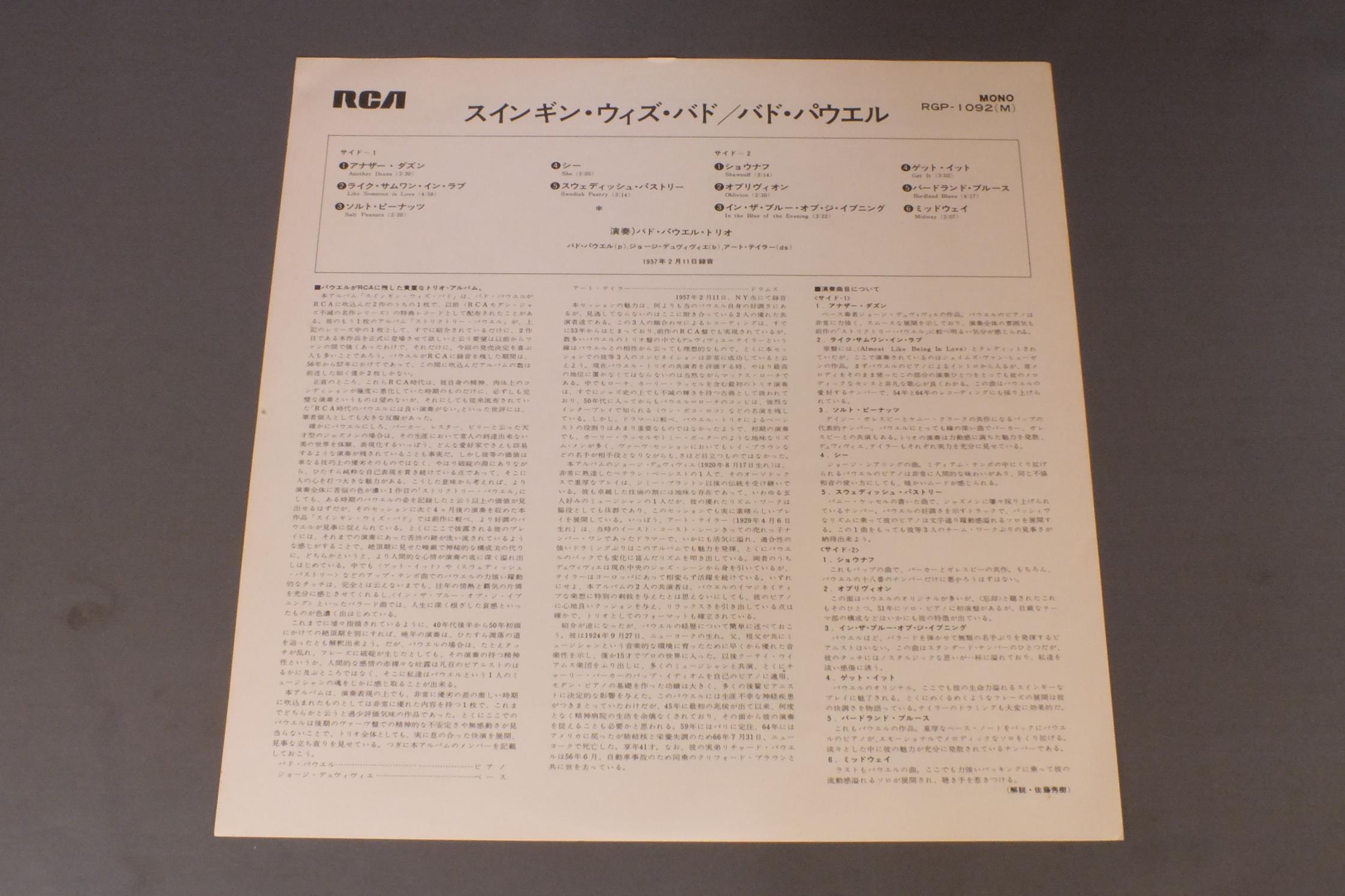 BUD POWELLバド・パウエル/SWINGIN` WITH BUDスインギン・ウィズ・バド RGP1092 製造国:日本盤 / Media:LP外観:EX-盤の状態:EX 価格(税込):¥1,100(売約済) 送料 7inch:定形外郵便 360円~LP:定形外郵便 660円~送料は、注文の最終画面で確認頂けます。 > > BUD POWELL/SWINGIN` WITH BUD 外観 (EX-)特記事項:裏ジャケにシミ有り。外観EX-の共通説明:ダメージ軽度~多少。 中古品としては普通の状態。シミ、ヨゴレ、スレなど軽く~多少。 盤の状態 (EX)特記事項:薄いスリキズ・スレ軽くある感じ。軽微なものの様子です。盤EXの共通説明:盤面のスリキズが薄いものが少し~軽度 音に出そうなものは無いように見える(軽微なソフトティック音は除く)。 Tweet それぞれの画像をクリックすると、大きい写真が見られます こちらの商品もお勧めです 990円 HERBIE MANNハービー・マン / HERBIE MANN VOL12ハービー・マン VOL12 770円 BRUBECK & LAVERNE TRIO / SEE HOW IT FEELS想いのままに 1,210円 DEREK SMITHディレク・スミス / NEW SOILニュー・ソワール 990円 TAL FARLOWタル・ファーロウ / SWINGINNG GUITARスウィンギング・ギター 770円 GEORGE LEWISジョージ・ルイス / ON PARADEオン・パレード 440円 GARY BURTON - SONNY ROLLINS - CLARK TERRYG.バートン - S.ロリンズ - C.テリー / 3 IN JAZZスリー・イン・ジャズ 880円 GROVER WASHINGTON JR.グローヴァー・ワシントンJR. / COME MORNINGカム・モーニング 770円 JACQUES LOUSSIER TRIO - ROYAL PHIL. ORCH.ジャック・ルーシェ・トリオ - ロイヤル・フィルハーモニー管弦楽団 / BACH - BRANDENBURG NO5バッハ - ブランデンブルグ協奏曲第5番