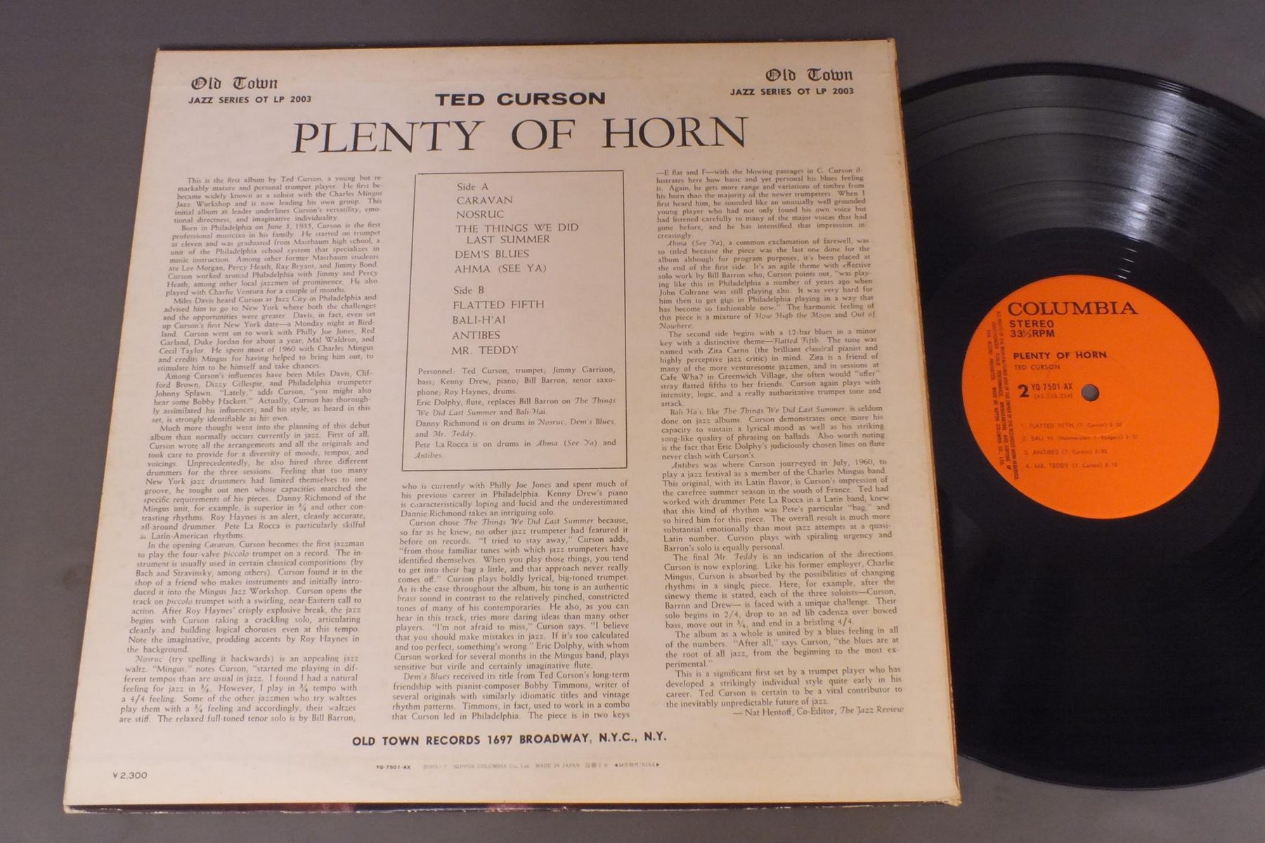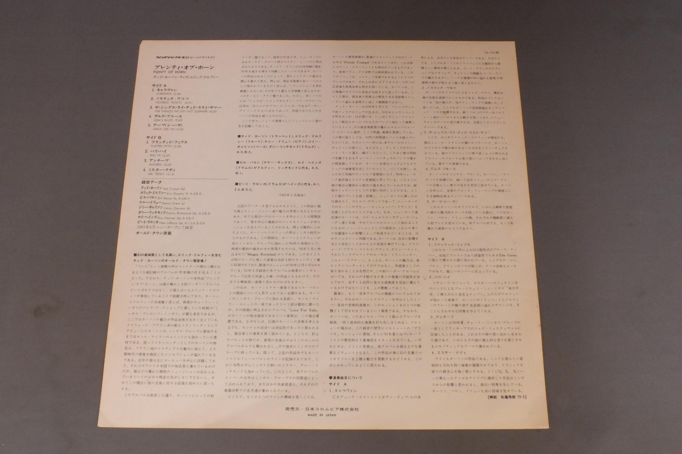 TED CURSONテッド・カーソン/PLENTY OF HORNプレンティ・オブ・ホーン YQ7501AX 製造国:日本盤 / Media:LP外観:VG+盤の状態:EX 価格(税込):¥440(売約済) 送料 7inch:定形外郵便 360円~LP:定形外郵便 660円~送料は、注文の最終画面で確認頂けます。 > > TED CURSON/PLENTY OF HORN 外観 (VG+)特記事項:スレ有り。付属品を含めてシミ有り。外観VG+の共通説明:ダメージやや有り。シミ、ヨゴレ、スレなど多少~やや多め。 盤の状態 (EX)特記事項:薄いスリキズ・スレ少しある感じ。一見してきれいな感じです。盤EXの共通説明:盤面のスリキズが薄いものが少し~軽度 音に出そうなものは無いように見える(軽微なソフトティック音は除く)。 Tweet それぞれの画像をクリックすると、大きい写真が見られます こちらの商品もお勧めです 1,320円 GATO BARBIERIガトー・バルビエリ / TROPICOトロピコ 770円 HAL McKUSICKハル・マジック / JAZZ WORKSHOPジャズ・ワークショップ 660円 KAZUMI BAND香津美バンド / TALK YOU ALL TIGHT頭狂好児唐眼 1,210円 BUCK CLAYTONバック・クレイトン・オールスターズ / HUCKLE-BUCK AND ROBBINS` NEST A BUCK CLAYTON JAM SESSIONバック・クレイトン・ジャム・セッション 990円 CHARLIE PARKERチャーリー・パーカー / CHARLIE PARKER ON SAVOY VOL6チャーリー・パーカー・オン・サヴォイVOL6 770円 GEORGE LEWISジョージ・ルイス / AT CLUB HANGOVER VOL1アット・クラブ・ハングオーヴァー VOL1 990円 FRANCES FAYEフランセス・フェイ / CAUGHT IN THE ACTコート・イン・ジ・アクト 990円 JAY HOGGARDジェイ・ホガード / LOVE SURVIVESラヴ・サーヴァイブズ