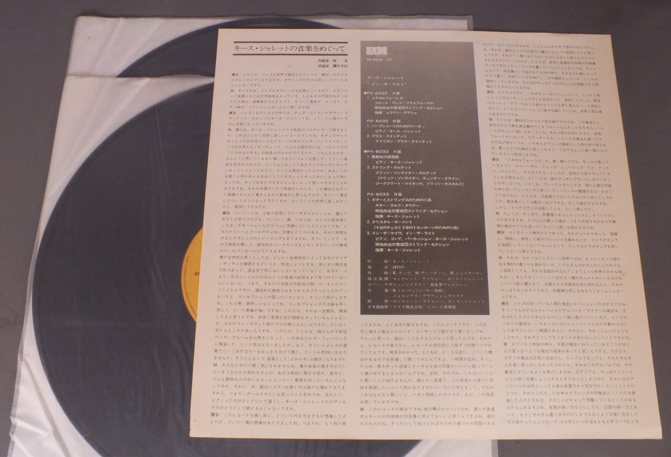 KEITH JARRETTキース・ジャレット/IN THE LIGHTイン・ザ・ライト PA6032-33 製造国:日本盤 / Media:LP外観:EX-盤の状態:EX+ 価格(税込):¥1,100(売約済) 送料 7inch:定形外郵便 360円~LP:定形外郵便 660円~送料は、注文の最終画面で確認頂けます。 > > KEITH JARRETT/IN THE LIGHT 外観 (EX-)特記事項:ヘリスレ有り。見開きにシミ有り。外観EX-の共通説明:ダメージ軽度~多少。 中古品としては普通の状態。シミ、ヨゴレ、スレなど軽く~多少。 盤の状態 (EX+)特記事項:極薄いスリキズ・スレ少し。一見してきれいな状態です。盤EX+の共通説明:盤面の極薄いスリキズ、スレ少し程度 音に出そうなものは無いように見える(極軽微なソフトティック音は除く)。 Tweet それぞれの画像をクリックすると、大きい写真が見られます こちらの商品もお勧めです 1,210円 SONNY ROLLINS / PLAYS 1,320円 THE JOHN BUNCH QUINTETジョン・バンチ / JONE`S OTHER BUNCHジョンズ・アザー・バンチ 770円 COZY COLE - RED NORVO etcコジー・コール - レッド・ノーヴォ他 / ALL STAR SESSIONSオール・スター・セッション 770円 NEW ORLEANS RASCALSニューオリンズ・ラスカルズ / 20th ANNIVERSARY CONCERT20th アニバーサリー・コンサート 880円 SADAO WATANABE渡辺貞夫 / MY DEAR LIFEマイ・ディア・ライフ 1,210円 RANDY WESTON SEXTETランディー・ウエストン 六重奏団 / LITTLE NILESリトル・ナイルス - ランディー・ウエストンの芸術 1,210円 MODERN JAZZ QUARTETMJQ / ART OF THE MODERN JAZZ QUARTETアート・オブ・MJQ 1,210円 JOHN KLEMMERジョン・クレマー / MAGNIFICENT MADNESSマグニフィセント・マッドネス