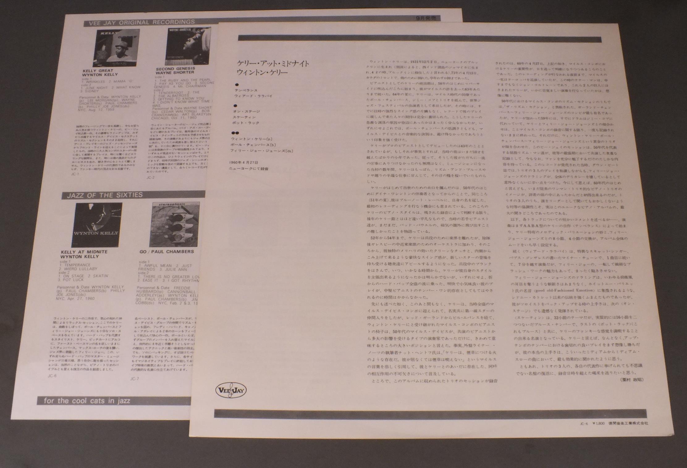 WYNTON KELLYウィントン・ケリー/KELLY AT MIDNITEケリー・アット・ミドナイト JC6 製造国:日本盤 / Media:LP外観:EX-盤の状態:EX 価格(税込):¥990(売約済) 送料 7inch:定形外郵便 360円~LP:定形外郵便 660円~送料は、注文の最終画面で確認頂けます。 > > WYNTON KELLY/KELLY AT MIDNITE 外観 (EX-)特記事項:上ヘリにスレ。表ジャケ左上隅にステッカー跡。外観EX-の共通説明:ダメージ軽度~多少。 中古品としては普通の状態。シミ、ヨゴレ、スレなど軽く~多少。 盤の状態 (EX)特記事項:薄いスリキズ・スレ軽くある感じ。殆どが軽微なものの様子です。盤EXの共通説明:盤面のスリキズが薄いものが少し~軽度 音に出そうなものは無いように見える(軽微なソフトティック音は除く)。 Tweet それぞれの画像をクリックすると、大きい写真が見られます こちらの商品もお勧めです 1,210円 STAN KENTONスタン・ケントン / PORTRAITS ON STANDARDSポートレイツ・オン・スタンダーズ 1,210円 SONNY ROLLINSソニー・ロリンズ / THE WAY I FEELザ・ウェイ・アイ・フィール 770円 BUDDY GRECOバディ・グレコ / BIG BAND&BALLADSビッグ・バンド・アンド・バラード 770円 JOHN KLEMMERジョン・クレマー / FINESSEフィネス 990円 JOHN LEWISジョン・ルイス / EUROPEAN WINDOWSヨーロッパの窓 1,320円 GATO BARBIERIガトー・バルビエリ / UNDER FIREアンダー・ファイア 770円 CHARLIE PARKERチャーリー・パーカー / CHARLIE PARKER ON SAVOY VOL7チャーリー・パーカー・オン・サヴォイVOL7 1,320円 LOUIS ARMSTRONG & HIS ALL-STARSルイ・アームストロング・オールスターズ / PLAYS W.C.HANDYプレイズ・W.C.ハンディ