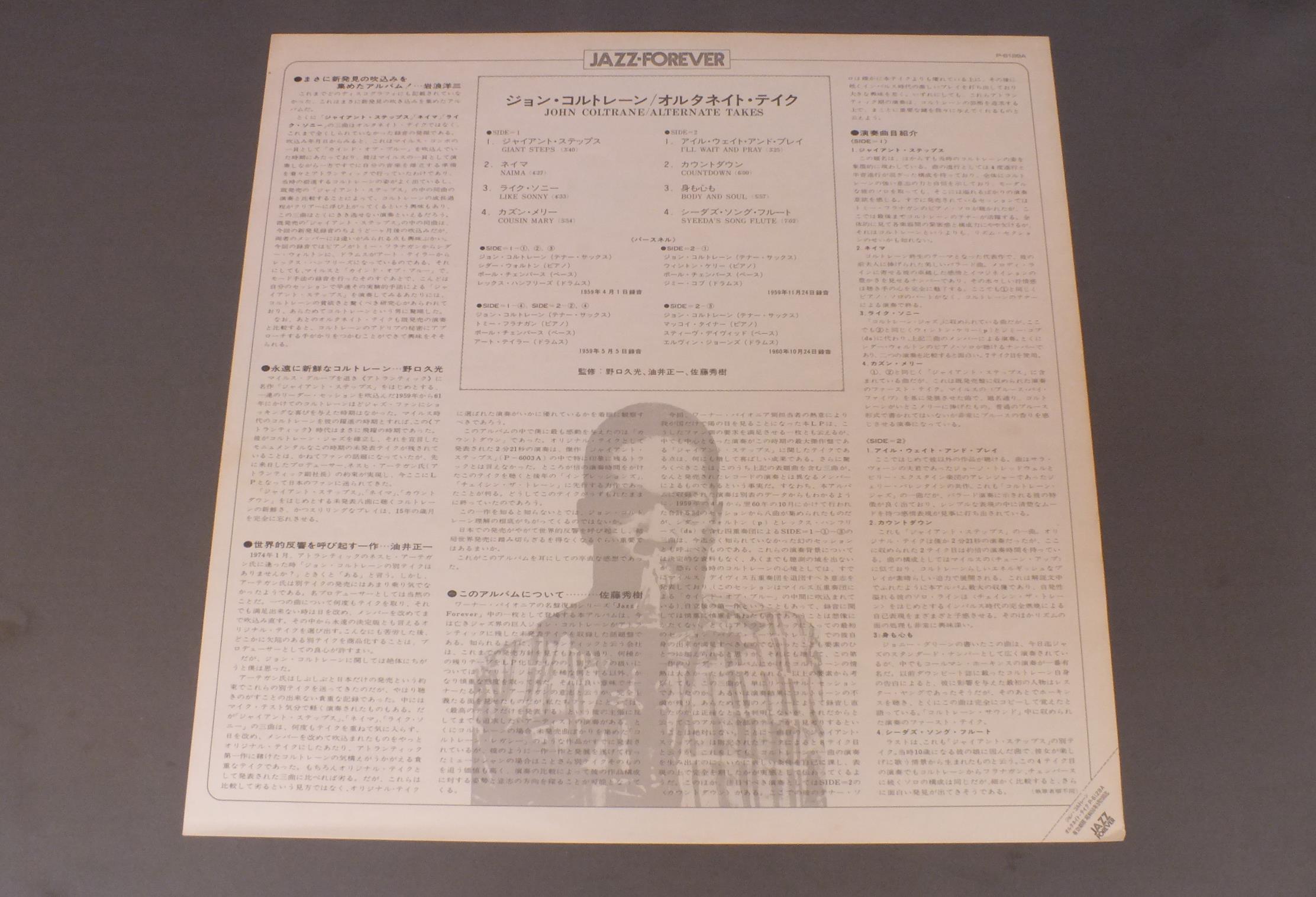 JOHN COLTRANEジョン・コルトレーン/ALTERNATE TAKESオルタネイト・テイク P6128A 製造国:日本盤 / Media:LP外観:EX-盤の状態:EX 価格(税込):¥990(売約済) 送料 7inch:定形外郵便 360円~LP:定形外郵便 660円~送料は、注文の最終画面で確認頂けます。 > > JOHN COLTRANE/ALTERNATE TAKES 外観 (EX-)特記事項:上ヘリにスレ。外観EX-の共通説明:ダメージ軽度~多少。 中古品としては普通の状態。シミ、ヨゴレ、スレなど軽く~多少。 盤の状態 (EX)特記事項:薄いスリキズ・スレ軽くある感じ。軽微なものの様子です。盤EXの共通説明:盤面のスリキズが薄いものが少し~軽度 音に出そうなものは無いように見える(軽微なソフトティック音は除く)。 Tweet それぞれの画像をクリックすると、大きい写真が見られます こちらの商品もお勧めです 1,980円 YASUTAKA TSUTSUI + YOSUKE YAMASHITA etc筒井康隆 + 山下洋輔他 / INNER SPACE OF YASUTAKA TSUTSUI筒井康隆全集プレゼント INNER SPACE OF YASUTAKA TSUTSUI 1,320円 MONTY ALEXANDER TRIOモンティ・アレキサンダー / MONTREUX ALEXANDERアット・モントルー 1,320円 DOLLAR BRANDダラー・ブランド / AFRICAN PIANOアフリカン・ピアノ 1,320円 RAMSEY LEWIS -BOB JAMES etcラムゼイ・ルイス - ボブ・ジェームス他 / ONE-NIGHT STAND A KEYBOARD EVENTワンナイト・スタンド-キーボード・イベント 880円 GROVER WASHINGTON JR.グローヴァー・ワシントンJR. / COME MORNINGカム・モーニング 1,210円 WILLIE SMITH - JESS STACY - JOE SULLIVANジェス・ステイシー - ウィリイ・スミス - ジョー・サリバン / CHAIRMEN OF THE BOARD VOL2ピアノ・ジャズの競演 第2集 990円 STANLEY JORDAN / MAGIC TOUCH 1,320円 JOHN COLTRANE & WILBURN HARDENジョン・コルトレーン&ウィルバー・ハーディン / MAINSTREAM 1958メインストリーム1958
