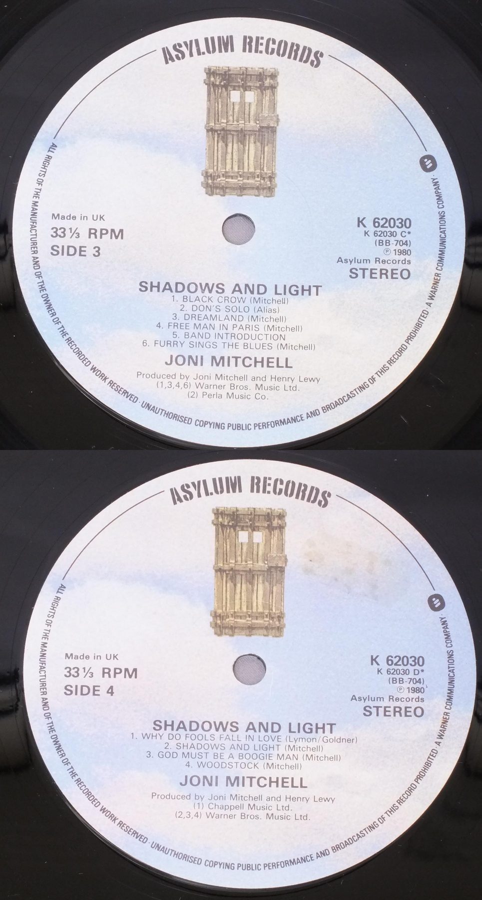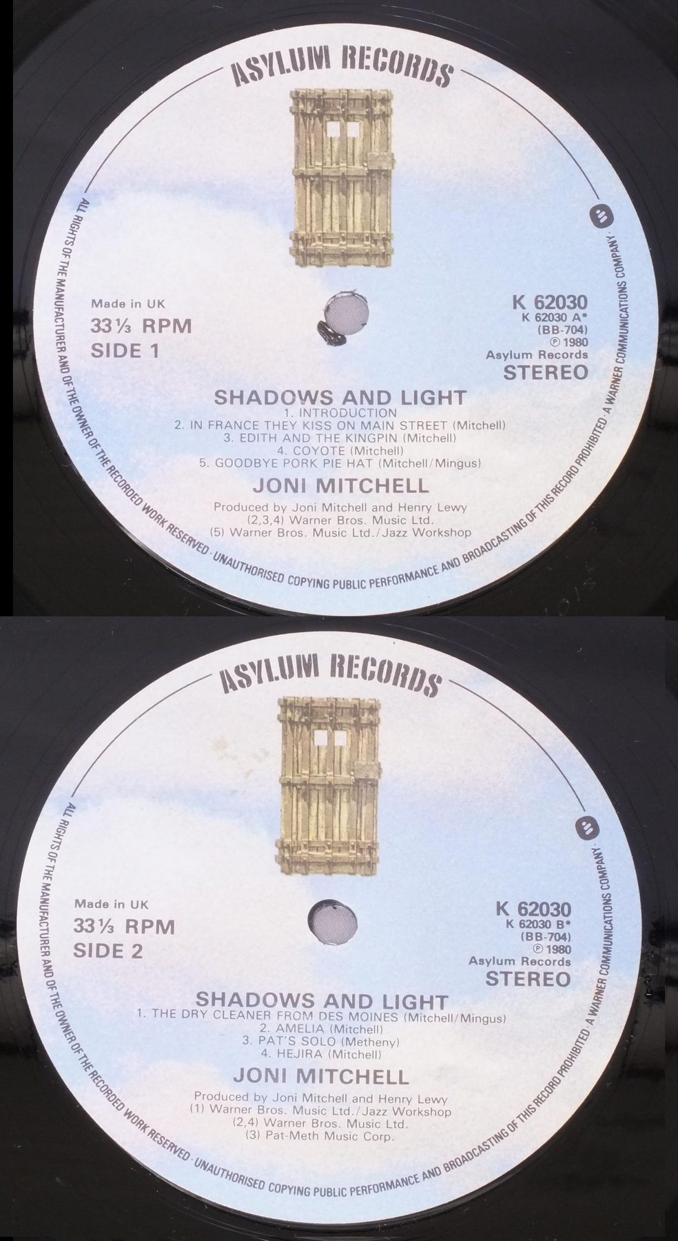 JONI MITCHELL/SHADOWS AND LIGHT K62030 製造国:英国盤 / Media:LPMatrix:A2 B1 C1 D1外観:EX盤の状態:EX 価格(税込):¥3,300(売約済) 送料 7inch:定形外郵便 360円~LP:定形外郵便 660円~送料は、注文の最終画面で確認頂けます。 > > JONI MITCHELL/SHADOWS AND LIGHT 外観 (EX)特記事項:表ジャケは下の方にレコードリングスレが少し。黒が基調のジャケですので多少スリキズ等は見えますが、全体的にスレやスリキズ、よごれ等は薄い印象。オリジナルのインナーは付属ありません。外観EXの共通説明:ダメージが限定的。中古品としては保存状態がよい方。シミ、ヨゴレ、スレ 少し~軽度。 盤の状態 (EX)特記事項:薄いスリキズ・スレ少しある程度。音に出そうなものもなく一見してきれいな状態です。曲間など、静かなところを中心に聴いて見ましたが、チリノイズ少ないきれいな再生具合でした。盤EXの共通説明:盤面のスリキズが薄いものが少し~軽度 音に出そうなものは無いように見える(軽微なソフトティック音は除く)。 Tweet それぞれの画像をクリックすると、大きい写真が見られます こちらの商品もお勧めです 7,700円 SUSAN MAUGHAN / I WANNA BE BOBBY`S GIRL 4,400円 JONI MITCHELL / DOG EAT DOG 3,850円 NICO / THE END 5,060円 JONI MITCHELL / CHALK MARK IN A RAIN STORM 4,950円 JONI MITCHELL / DOG EAT DOG 4,950円 SANDY DENNY / RENDEZVOUS