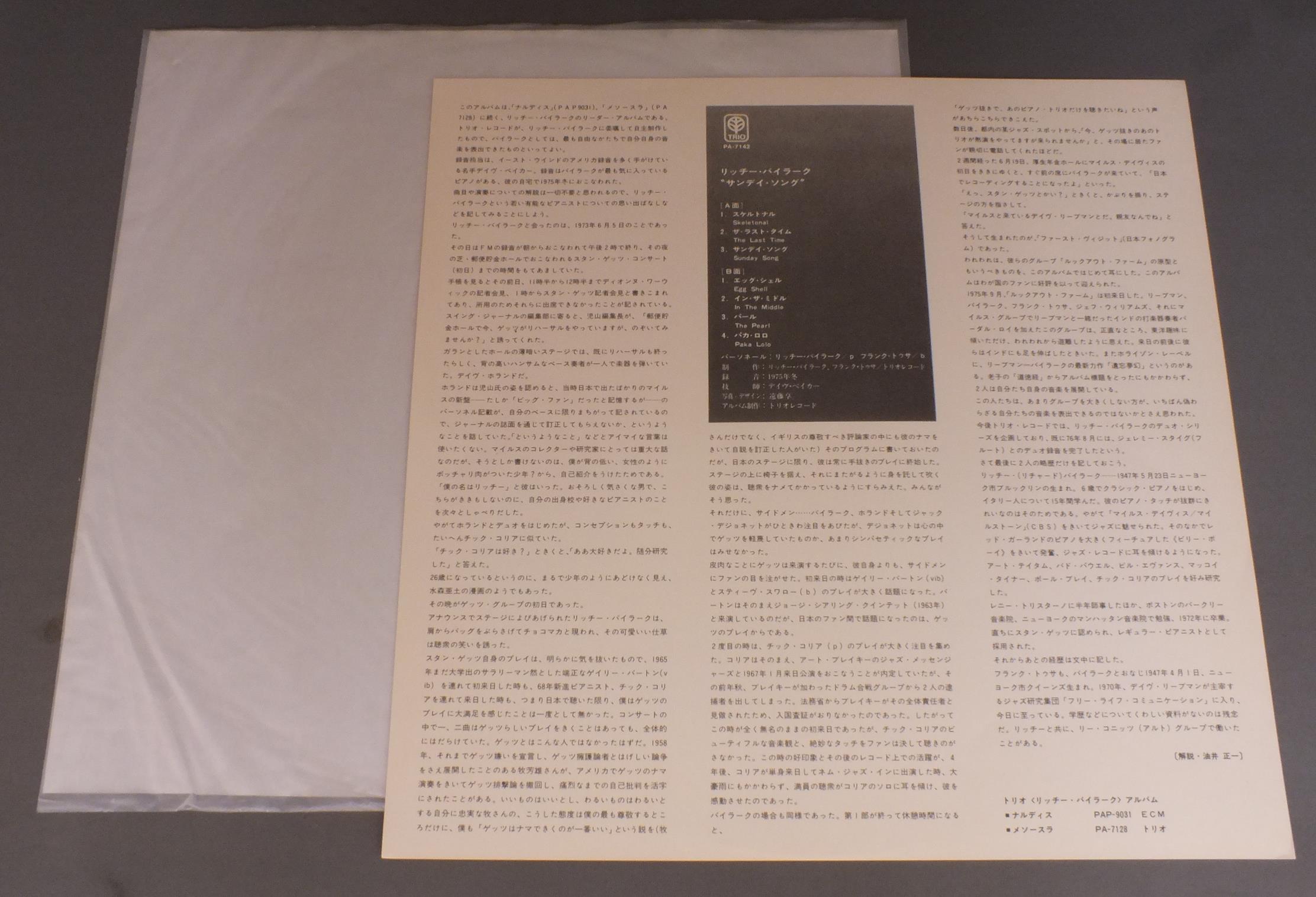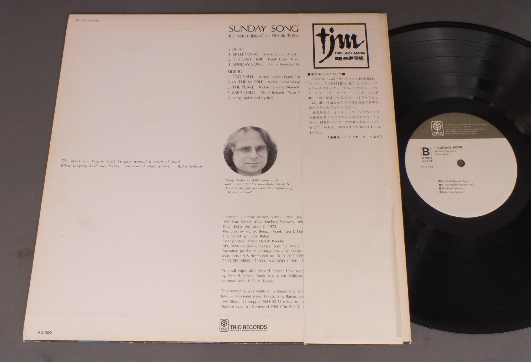RICHARD BEIRACH - FRANK TUSAリッチー・バイラーク - フランク・トゥサ/SUNDAY SONGサンデイ・ソング PA7142 製造国:日本盤 / Media:LP外観:EX-盤の状態:EX+帯:EX- 価格(税込):¥1,650(売約済) 送料 7inch:定形外郵便 360円~LP:定形外郵便 660円~送料は、注文の最終画面で確認頂けます。 > > RICHARD BEIRACH - FRANK TUSA/SUNDAY SONG 外観 (EX-)特記事項:背やヘリにスレやよごれ。外観EX-の共通説明:ダメージ軽度~多少。 中古品としては普通の状態。シミ、ヨゴレ、スレなど軽く~多少。 盤の状態 (EX+)特記事項:極薄いスリキズ・スレ少し。一見してきれいな状態です。盤EX+の共通説明:盤面の極薄いスリキズ、スレ少し程度 音に出そうなものは無いように見える(極軽微なソフトティック音は除く)。 帯の状態 (EX-):折れ跡や破れ小有り。 Tweet それぞれの画像をクリックすると、大きい写真が見られます こちらの商品もお勧めです 660円 KAZUMI BAND香津美バンド / TALK YOU ALL TIGHT頭狂好児唐眼 1,650円 MASABUMI KIKUCHI + GIL EVANS菊池雅章 / SAME TITLEWITH ギル・エヴァンス 1,210円 MODERN JAZZ QUARTETMJQ / ART OF THE MODERN JAZZ QUARTETアート・オブ・MJQ 990円 JOHN LEWISジョン・ルイス / EUROPEAN WINDOWSヨーロッパの窓 1,210円 RANDY WESTON SEXTETランディー・ウエストン 六重奏団 / LITTLE NILESリトル・ナイルス - ランディー・ウエストンの芸術 1,650円 ALBERT AYLERアルバート・アイラー / VOLUME 1ラスト・レコーディング VOL1 440円 ROGER KELLAWAYロジャー・ケラウェイ / CENTER OF THE CIRCLE核 1,650円 KEITH JARRETTキース・ジャレット / FACING YOUフェイシング・ユー