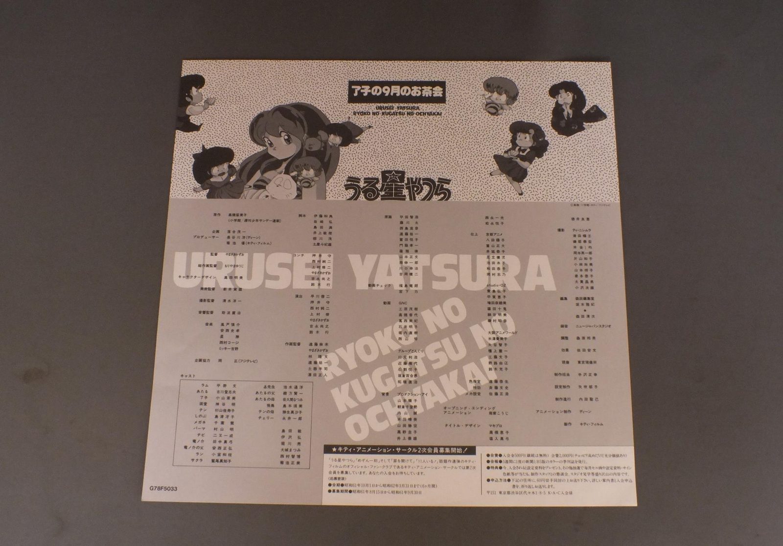 ANIME URUSEI YATSURA 高橋留美子/RYOKO NO KUGATSU NO OCHYAKAIアニメうる星やつら了子の9月のお茶会 G78F5033 製造国:日本盤 / Media:LD外観:EX+盤の状態:EX+ 価格(税込):¥550 送料 7inch:定形外郵便 360円~LP:定形外郵便 660円~送料は、注文の最終画面で確認頂けます。 レコード検索 > FOLK > ANIME URUSEI YATSURA /RYOKO NO KUGATSU NO OCHYAKAI 外観 (EX+)特記事項:特記なし。外観EX+の共通説明:中古としては美品、一見してきれいでダメージが軽微。シミ、ヨゴレ、スレ有っても僅か~少し。 盤の状態 (EX+)特記事項:薄いスリキズ・スレ少し。一見してきれいな状態です。盤EX+の共通説明:盤面の極薄いスリキズ、スレ少し程度 音に出そうなものは無いように見える(極軽微なソフトティック音は除く)。 Tweet それぞれの画像をクリックすると、大きい写真が見られます こちらの商品もお勧めです
