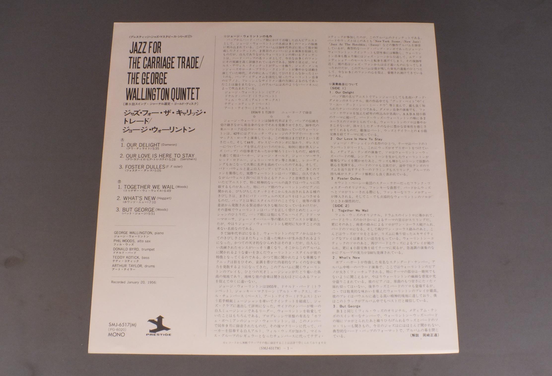 GEORGE WALLINGTON QUINTETジョージ・ウォーリントン/JAZZ FOR THE CARRIAGE TRADEジャズ・フォー・ザ・キャリッジ・トレード SMJ6517 製造国:日本盤 / Media:LP外観:EX-盤の状態:EX 価格(税込):¥880(売約済) 送料 7inch:定形外郵便 360円~LP:定形外郵便 660円~送料は、注文の最終画面で確認頂けます。 > > GEORGE WALLINGTON QUINTET/JAZZ FOR THE CARRIAGE TRADE 外観 (EX-)特記事項:シミ有り外観EX-の共通説明:ダメージ軽度~多少。 中古品としては普通の状態。シミ、ヨゴレ、スレなど軽く~多少。 盤の状態 (EX)特記事項:薄いスリキズ・スレ軽くある感じ。軽微なものの様子です。盤EXの共通説明:盤面のスリキズが薄いものが少し~軽度 音に出そうなものは無いように見える(軽微なソフトティック音は除く)。 Tweet それぞれの画像をクリックすると、大きい写真が見られます こちらの商品もお勧めです 770円 BRUCE FORMANブルース・フォアマン / COAST TO COASTコースト・トゥ・コースト 1,320円 SONNY CLARK TRIOソニー・クラーク・トリオ / SAME TITEL 1,320円 JOHN COLTRANE & WILBURN HARDENジョン・コルトレーン&ウィルバー・ハーディン / MAINSTREAM 1958メインストリーム1958 1,650円 MASARU IMADA今田勝 / MINT BREEZEミント・ブリーズ 770円 COZY COLE - RED NORVO etcコジー・コール - レッド・ノーヴォ他 / ALL STAR SESSIONSオール・スター・セッション 1,210円 CLIFORD BROWN ALL STARSクリフォード・ブラウン・オール・スターズ / CARAVAN AUTUMN IN NEW YORKキャラバン 660円 JACQUES LOUSSIERジャック・ルーシエ・トリオ / PLAY BACH VOL.4プレイ・バッハ 第4集 990円 MODERN JAZZ QUARTETモダン・ジャズ・クワルテット / IN MEMORIAMイン・メモリアル