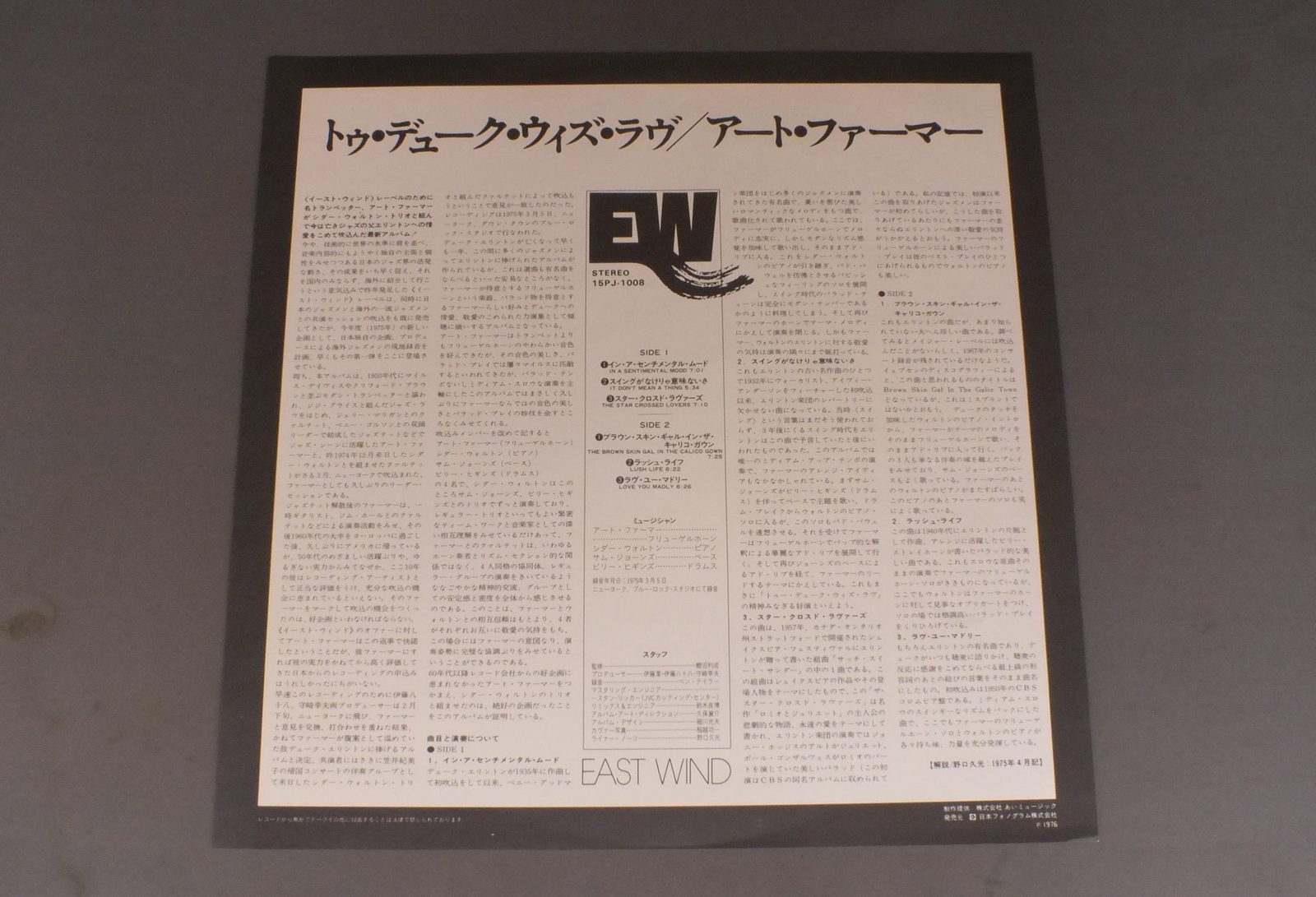 ART FARMERアート・ファーマー/TO DUKE WITH LOVEトゥ・デューク・ウィズ・ラヴ 15PJ1008 製造国:日本盤 / Media:LP外観:EX-盤の状態:EX+ 価格(税込):¥990(売約済) 送料 7inch:定形外郵便 360円~LP:定形外郵便 660円~送料は、注文の最終画面で確認頂けます。 > > ART FARMER/TO DUKE WITH LOVE 外観 (EX-)特記事項:表ジャケにシミ外観EX-の共通説明:ダメージ軽度~多少。 中古品としては普通の状態。シミ、ヨゴレ、スレなど軽く~多少。 盤の状態 (EX+)特記事項:極薄いスリキズ・スレ少し。一見してきれいな状態です。盤EX+の共通説明:盤面の極薄いスリキズ、スレ少し程度 音に出そうなものは無いように見える(極軽微なソフトティック音は除く)。 Tweet それぞれの画像をクリックすると、大きい写真が見られます こちらの商品もお勧めです 1,210円 ERIC DOLPHYエリック・ドルフィー / LAST DATEラスト・レコーディング 880円 V-DISC ALL-STAR JAM SESSIONSVディスク・オールスター・ジャムセッション / V-DISC ALL-STAR JAM SESSIONSVディスク・オールスター・ジャムセッション VOL.5 1,320円 MONTY ALEXANDER TRIOモンティ・アレキサンダー / MONTREUX ALEXANDERアット・モントルー 1,210円 SONNY STITT WITH QUINCY JONES ORCHETRAソニー・スティット・クインシージョーンズ オーケストラ / SAME TITLE 440円 HERB ALPERT & TIJUANA BRASS / BRASS ARE COMIN` 1,210円 WYNTON KELLYウイントン・ケリー / KELLY BLUEケリー・ブルー 1,650円 MASARU IMADA今田勝 / CARNIVAL哀愁のカーニヴァル 1,210円 WILLIE SMITH - JESS STACY - JOE SULLIVANジェス・ステイシー - ウィリイ・スミス - ジョー・サリバン / CHAIRMEN OF THE BOARD VOL2ピアノ・ジャズの競演 第2集