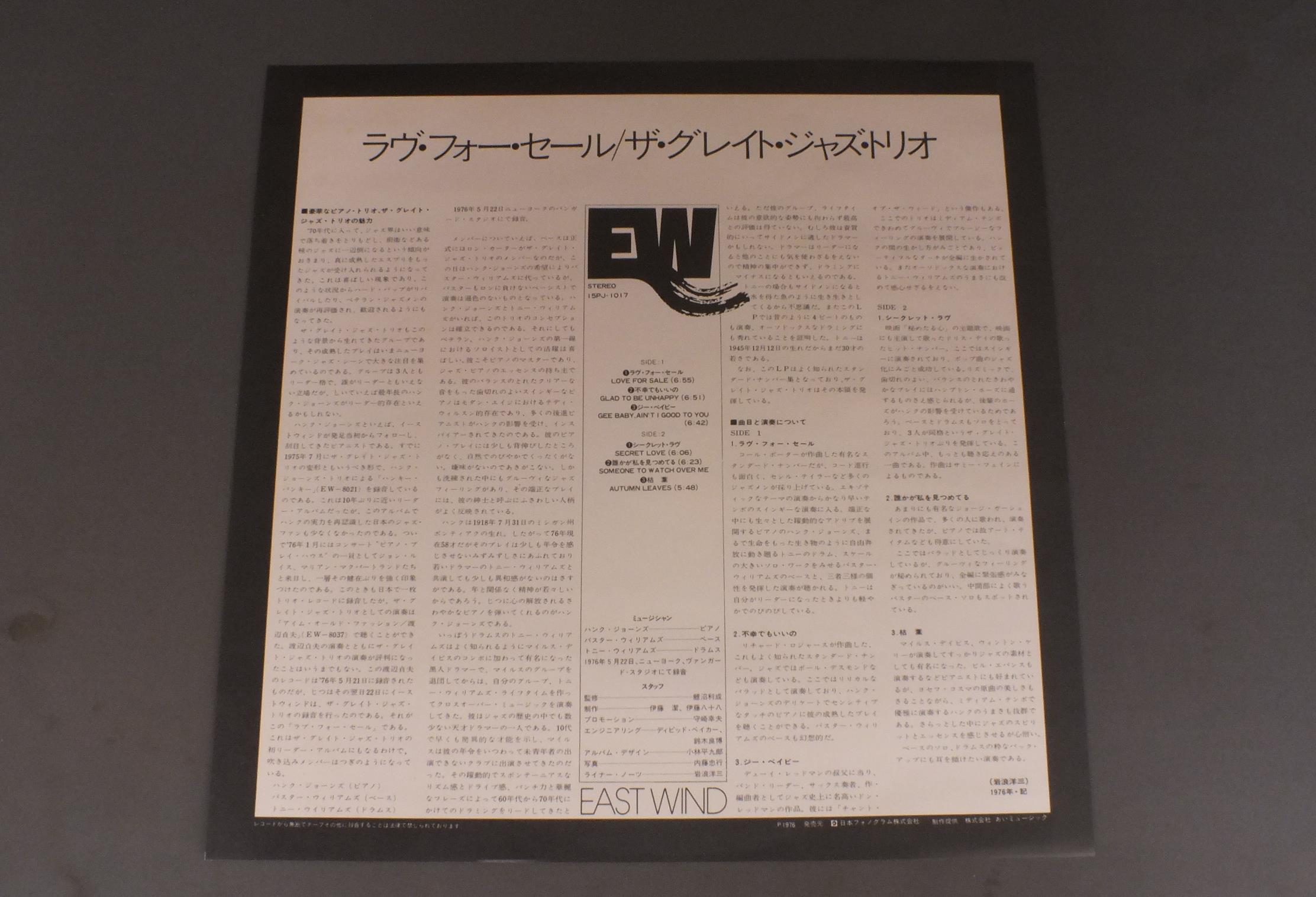 GREAT JAZZ TRIOグレイト・ジャズ・トリオ/LOVE FOR SALEラヴ・フォー・セール 15PJ1017 製造国:日本盤 / Media:LP外観:EX盤の状態:EX+ 価格(税込):¥1,100(売約済) 送料 7inch:定形外郵便 360円~LP:定形外郵便 660円~送料は、注文の最終画面で確認頂けます。 > > GREAT JAZZ TRIO/LOVE FOR SALE 外観 (EX)特記事項:特記なし。外観EXの共通説明:ダメージが限定的。中古品としては保存状態がよい方。シミ、ヨゴレ、スレ 少し~軽度。 盤の状態 (EX+)特記事項:薄いスリキズ・スレ少し。一見してきれいな状態です。盤EX+の共通説明:盤面の極薄いスリキズ、スレ少し程度 音に出そうなものは無いように見える(極軽微なソフトティック音は除く)。 Tweet それぞれの画像をクリックすると、大きい写真が見られます こちらの商品もお勧めです 1,210円 CLARKE BOLAND BIG BAND / SAME TITEL 990円 CHARLIE PARKERチャーリー・パーカー / CHARLIE PARKER ON SAVOY VOL4チャーリー・パーカー・オン・サヴォイVOL4 3,300円 EDDIE CONDON ALL STARSエディ・コンドン・オール・スターズ / EDDIE CONDON ALL STARS 1945 5LP BOX SETエディ・コンドン・オール・スターズ1945 5枚組 2,640円 EDDIE CONDON ALL STARSエディ・コンドン・オール・スターズ / EDDIE CONDON ALL STARS 1945 5LP BOX SETエディ・コンドン・オール・スターズ1945 5枚組 1,210円 EDDIE CONDONエディ・コンドン楽団 / ERA OF CONDON JAZZ栄光のコンドン・ジャズ 990円 DAVE GRUSINデイヴ・グルーシン / ONE OF A KINDデイヴ・グルーシン・ジェントル・サウンド 1,210円 OUT OF THE BLUEアウト・オブ・ザ・ブルー / OUT OF THE BLUEアウト・オブ・ザ・ブルー 1,320円 RICHIE COLEリッチー・コール / ALIVE !アライヴ !