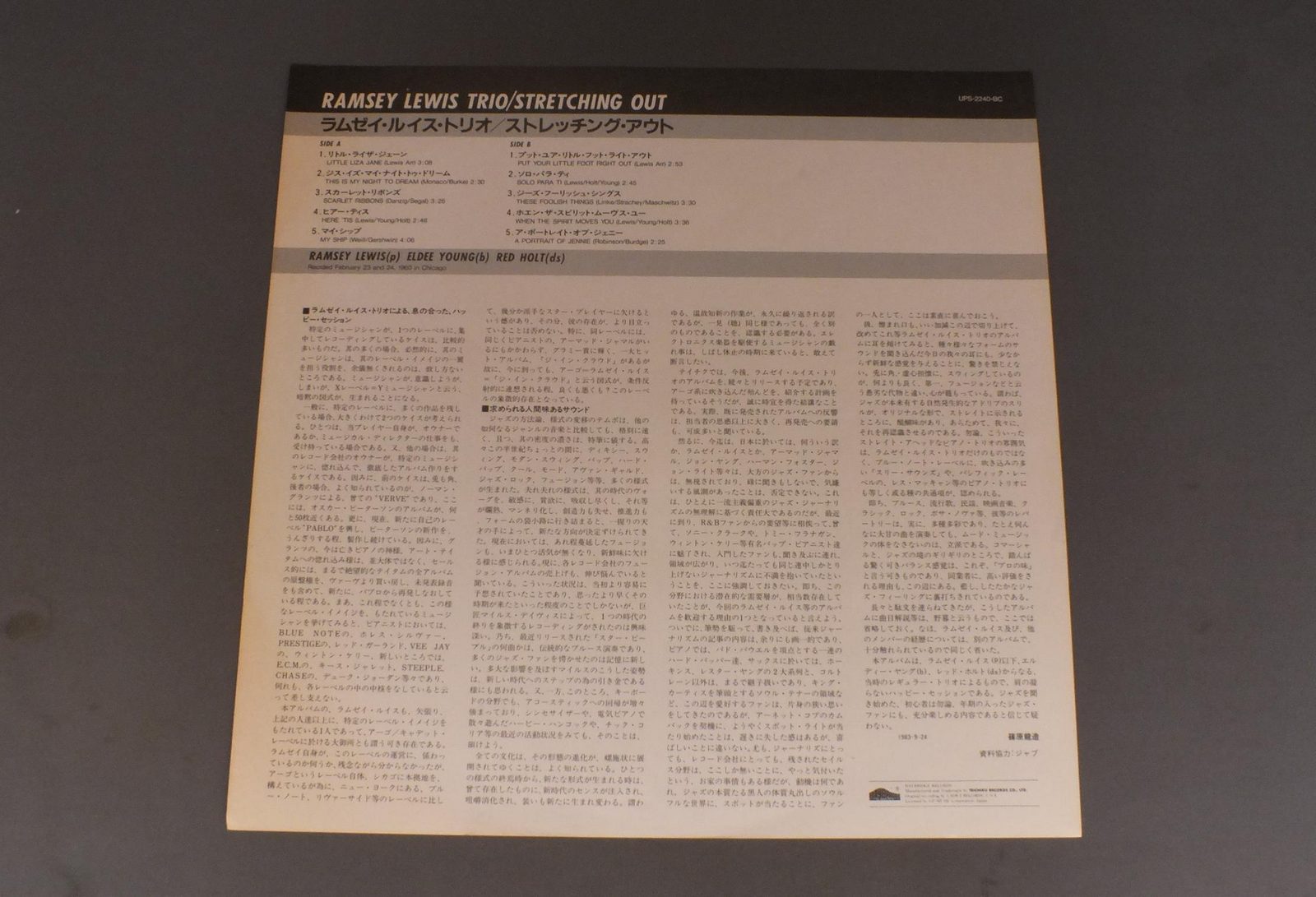 RAMSEY LEWIS TRIOラムゼイ・ルイス・トリオ/STRETCHING OUTストレッチング・アウト UPS2240BC 製造国:日本盤 / Media:LP外観:EX盤の状態:EX+ 価格(税込):¥660(売約済) 送料 7inch:定形外郵便 360円~LP:定形外郵便 660円~送料は、注文の最終画面で確認頂けます。 > > RAMSEY LEWIS TRIO/STRETCHING OUT 外観 (EX)特記事項:特記なし。外観EXの共通説明:ダメージが限定的。中古品としては保存状態がよい方。シミ、ヨゴレ、スレ 少し~軽度。 盤の状態 (EX+)特記事項:薄いスリキズ・スレ少し。一見してきれいな状態です。盤EX+の共通説明:盤面の極薄いスリキズ、スレ少し程度 音に出そうなものは無いように見える(極軽微なソフトティック音は除く)。 Tweet それぞれの画像をクリックすると、大きい写真が見られます こちらの商品もお勧めです 2,640円 EDDIE CONDON ALL STARSエディ・コンドン・オール・スターズ / EDDIE CONDON ALL STARS 1945 5LP BOX SETエディ・コンドン・オール・スターズ1945 5枚組 770円 JACQUES LOUSSIER TRIOジャック・ルーシェ・トリオ / PLAY BACH VOL4プレイ・バッハ第4集 770円 TERUMASA HINO日野皓正 / DOUBLE RAINBOWダブル・レインボー 1,210円 WOODY HERMANウディ・ハーマン / SECOND HERDセカンド・ハード 770円 KAI WINDING & J.J.JOHNSONケイ・ウィンディング5重奏団 + J.J.ジョンソン / AFTERNOON AT BIRDLANDバードランドのJ & K 1,210円 BUD POWELL TRIOバド・パウエル・トリオ / ROOST SESSION BEST 6-VOL.1バド・パウエルの芸術 3,300円 EDDIE CONDON ALL STARSエディ・コンドン・オール・スターズ / EDDIE CONDON ALL STARS 1945 5LP BOX SETエディ・コンドン・オール・スターズ1945 5枚組 2,200円 TADAO HAYASHI林忠男 / LYRAリラ