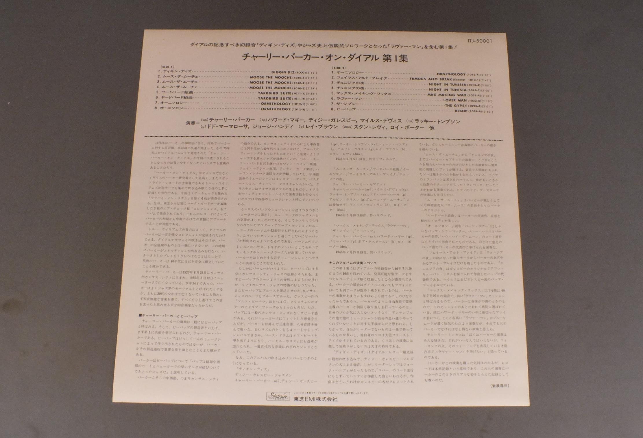 CHARLIE PARKER etcチャーリー・パーカー他/CHARLIE PARKER ON DIAL VOL1チャーリー・パーカー・オン・ダイアル第1集 ITJ50001 製造国:日本盤 / Media:LP外観:EX-盤の状態:EX+ 価格(税込):¥990(売約済) 送料 7inch:定形外郵便 360円~LP:定形外郵便 660円~送料は、注文の最終画面で確認頂けます。 > > CHARLIE PARKER etc/CHARLIE PARKER ON DIAL VOL1 外観 (EX-)特記事項:ジャケによごれ有り外観EX-の共通説明:ダメージ軽度~多少。 中古品としては普通の状態。シミ、ヨゴレ、スレなど軽く~多少。 盤の状態 (EX+)特記事項:薄いスリキズ・スレ少し。一見してきれいな状態です。盤EX+の共通説明:盤面の極薄いスリキズ、スレ少し程度 音に出そうなものは無いように見える(極軽微なソフトティック音は除く)。 Tweet それぞれの画像をクリックすると、大きい写真が見られます こちらの商品もお勧めです 990円 SIDNEY DEPARIS etc / COMMODORE SHOW CASEコモドア・ショーケース 990円 MEL POWELLメル・パウエル / OUT ON A LIMBアウト・オン・ア・リム 1,210円 DUKE ELLINGTON WITH JIMMY JONESデューク・エリントン & ジミー・ジョーンズ / DUKE ELLINGTON`S MY PEOPLEマイ・ピープル 1,320円 MONTY ALEXANDER TRIOモンティ・アレキサンダー / MONTREUX ALEXANDERアット・モントルー 990円 YOSHIAKI MASUO増尾好秋 / SAILING WONDERセイリング・ワンダー 1,980円 YASUTAKA TSUTSUI + YOSUKE YAMASHITA etc筒井康隆 + 山下洋輔他 / INNER SPACE OF YASUTAKA TSUTSUI筒井康隆全集プレゼント INNER SPACE OF YASUTAKA TSUTSUI 1,320円 THE QUINTETパーカー - ガレスピー - パウエル - ローチ - ミンガス / JAZZ AT MASSEY HALLジャズ・アット・マッセイ・ホール 1,320円 SUNSET ALL STARSサンセット・オール・スターズ / JAMMIN` AT SUNSET VOL.2ジャミン・アット・サンセット 第2集