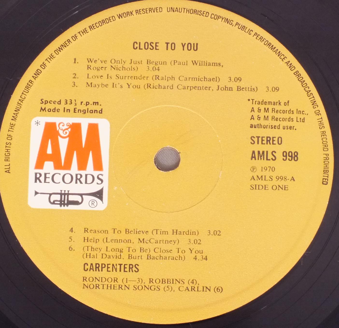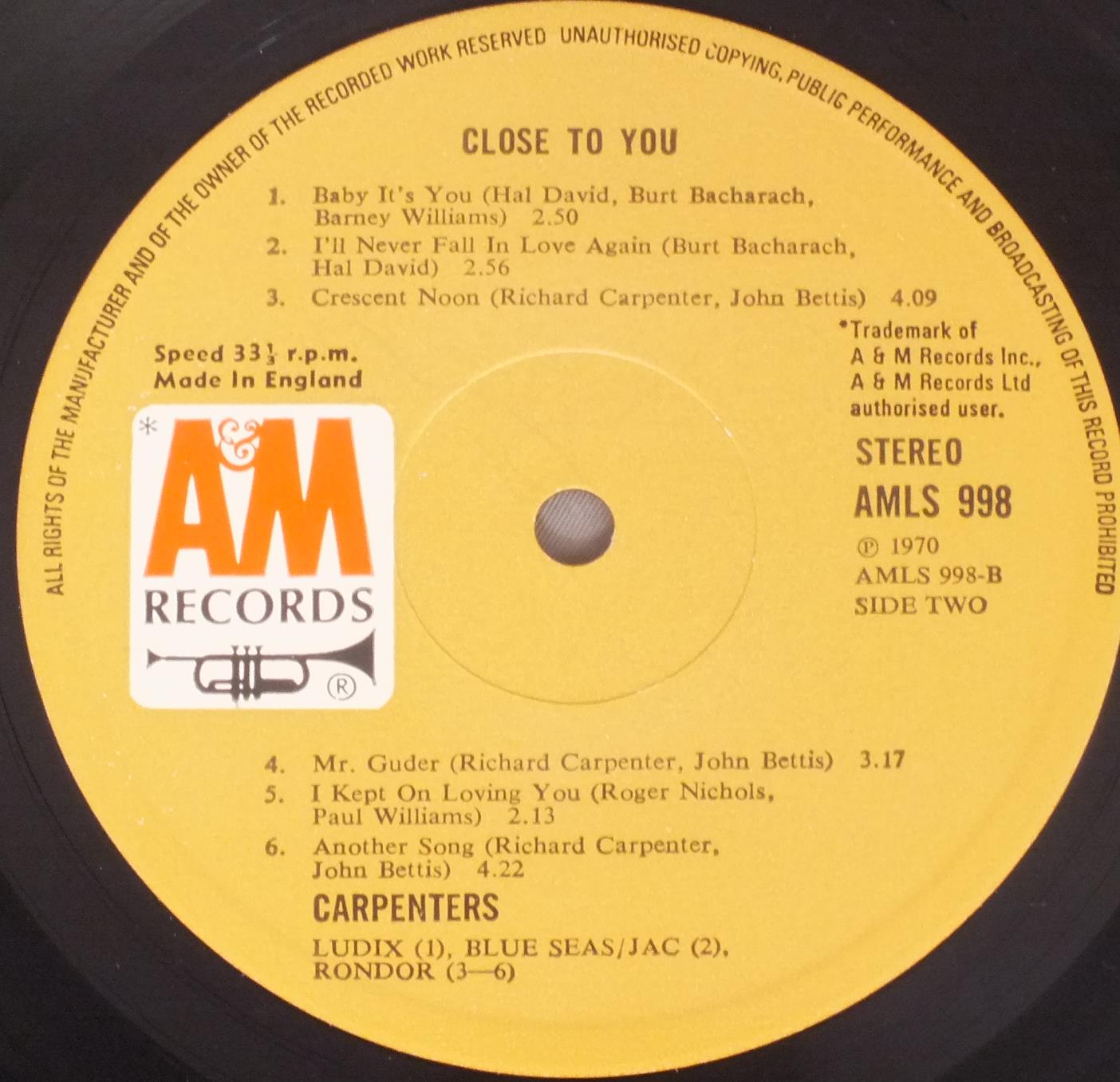 CARPENTERS/CLOSE TO YOU AMLS998 製造国:英国盤 / Media:LPMatrix:A-2*T B-1*T外観:EX盤の状態:EX 価格(税込):¥4,950(売約済) 送料 7inch:定形外郵便 360円~LP:定形外郵便 660円~送料は、注文の最終画面で確認頂けます。 > > CARPENTERS/CLOSE TO YOU 外観 (EX)特記事項:表裏ジャケ共に厚手のコーティング仕様。表裏ジャケ共に背に沿ってコーティングの浮き有りますが、ジャケ表面は全体的にコーティングのヨレシワも少なく、スレやスリキズ等もあまり無い感じ。外観EXの共通説明:ダメージが限定的。中古品としては保存状態がよい方。シミ、ヨゴレ、スレ 少し~軽度。 盤の状態 (EX)特記事項:薄いスリキズ・スレ軽く有る感じ。殆どが軽微なものの様子で、きれいな印象。曲間など、静かなところを中心に聴いて見ましたが、チリノイズ少ないきれいな再生具合でした。盤EXの共通説明:盤面のスリキズが薄いものが少し~軽度 音に出そうなものは無いように見える(軽微なソフトティック音は除く)。 その他:英国盤ではファーストアルバムになります。 Tweet それぞれの画像をクリックすると、大きい写真が見られます こちらの商品もお勧めです 5,060円 JONI MITCHELL / CHALK MARK IN A RAIN STORM 4,400円 JONI MITCHELL / DOG EAT DOG 7,700円 SUSAN MAUGHAN / I WANNA BE BOBBY`S GIRL 4,950円 SANDY DENNY / RENDEZVOUS 3,850円 NICO / THE END 4,950円 JONI MITCHELL / DOG EAT DOG
