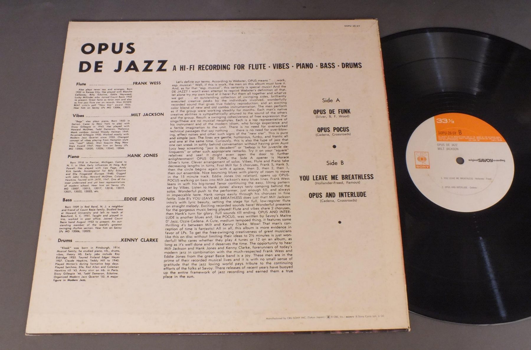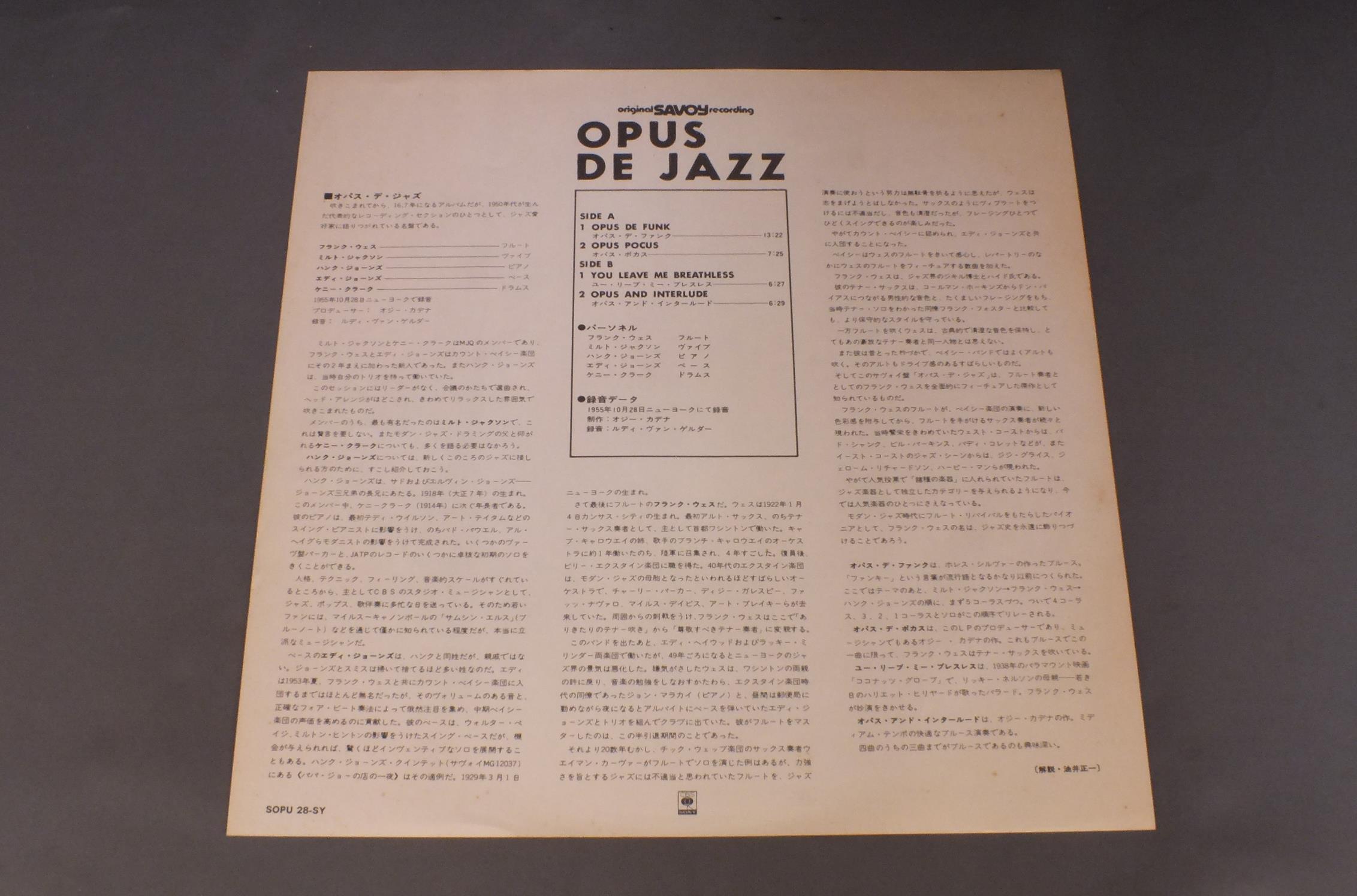 MILT JACKSONミルト・ジャクソン/OPUS DE JAZZオパス・デ・ジャズ SOPU28SY 製造国:日本盤 / Media:LP外観:VG+盤の状態:EX- 価格(税込):¥770(売約済) 送料 7inch:定形外郵便 360円~LP:定形外郵便 660円~送料は、注文の最終画面で確認頂けます。 レコード検索 > CLASSIC ORCH. > MILT JACKSON/OPUS DE JAZZ 外観 (VG+)特記事項:ヘリスレ有り。背やジャケにシミやよごれ。外観VG+の共通説明:ダメージやや有り。シミ、ヨゴレ、スレなど多少~やや多め。 盤の状態 (EX-)特記事項:薄いスリキズ・細かい表面スレ軽くある感じです。プチ出そうな所は少し。軽微なものが中心の様子です。盤EX-の共通説明:盤面のスリキズが多少有り。音に出そうなものは殆ど無いように見える~さほど気にならないぐらいの軽いプチ数カ所程度。 Tweet それぞれの画像をクリックすると、大きい写真が見られます こちらの商品もお勧めです 1,210円 ERROLL GARNERエロール・ガーナー / SERENADE TO LAURAセレナード・トゥ・ローラ 1,210円 STAN KENTONスタン・ケントン / PORTRAITS ON STANDARDSポートレイツ・オン・スタンダーズ 770円 LIONEL HAMPTONライオネル・ハンプトン楽団 / LIONEL HAMPTON ON TOURニュー・コンサート 770円 CHARLIE PARKERチャーリー・パーカー / CHARLIE PARKER ON SAVOY VOL7チャーリー・パーカー・オン・サヴォイVOL7 1,210円 JIMMY SMITHジミー・スミス / PORTUGUESE SOULポルトガル・ソウル 1,210円 EDDIE CONDON & OTHERSエディ・コンドン・アンド・アザーズ / CHICAGO&ALL THAT JAZZ!シカゴ・アンド・オール・ザット・ジャズ! 1,320円 JOHN COLTRANE & WILBURN HARDENジョン・コルトレーン&ウィルバー・ハーディン / MAINSTREAM 1958メインストリーム1958 2,200円 CANNONBALL ADDERLEYキャノンボール・アダレイ / CANNONBALL IN STEREO 60s ISSUEキャノンボール・イン・ステレオ ぺラジャケ