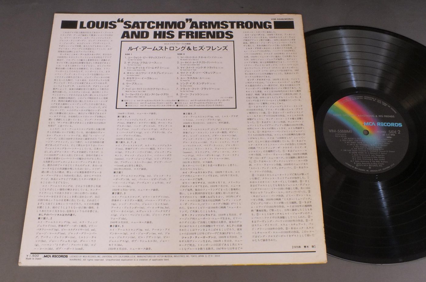 LOUIS ARMSTRONGルイ・アームストロング/LOUIS SATCHMO ARMSTRONGアンド・ヒズ・フレンズ VIM5588 製造国:日本盤 / Media:LP外観:EX-盤の状態:EX+ 価格(税込):¥770(売約済) 送料 7inch:定形外郵便 360円~LP:定形外郵便 660円~送料は、注文の最終画面で確認頂けます。 > > LOUIS ARMSTRONG/LOUIS SATCHMO ARMSTRONG 外観 (EX-)特記事項:裏ジャケにシミ外観EX-の共通説明:ダメージ軽度~多少。 中古品としては普通の状態。シミ、ヨゴレ、スレなど軽く~多少。 盤の状態 (EX+)特記事項:薄いスリキズ・スレ少し。一見してきれいな状態です。盤EX+の共通説明:盤面の極薄いスリキズ、スレ少し程度 音に出そうなものは無いように見える(極軽微なソフトティック音は除く)。 Tweet それぞれの画像をクリックすると、大きい写真が見られます こちらの商品もお勧めです 770円 NANCY WILSONナンシー・ウィルソン / I`LL BE A SONGアイル・ビー・ア・ソング 660円 WOODY HERMAN AND HIS ORCHESTRAウディ・ハーマン・オーケストラ / BLUE FLAMEブルー・フレーム 770円 BUDDY GRECOバディ・グレコ / HERE`S BUDDY GRECOヒアーズ・バディ・グレコ 1,320円 AL JARREAUアル・ジャロウ / L IS FOR LOVERL・イズ・フォー・ラヴァー 1,650円 SHORTY ROGERSショーティ・ロジャース・アンド・ヒズ・ジャイアンツ / BIG SHORTY ROGERS EXPRESSビッグ・ショーティ・エクスプレス 990円 BILLIE HOLIDAYビリー・ホリデイ / BILLIE HOLIDAYビリー・ホリデイの魂 770円 MARI NAKAMOTO中本マリ / APHRODITEアフロディーテの祈り 880円 YASUKO AGAWA阿川泰子 / FINE !