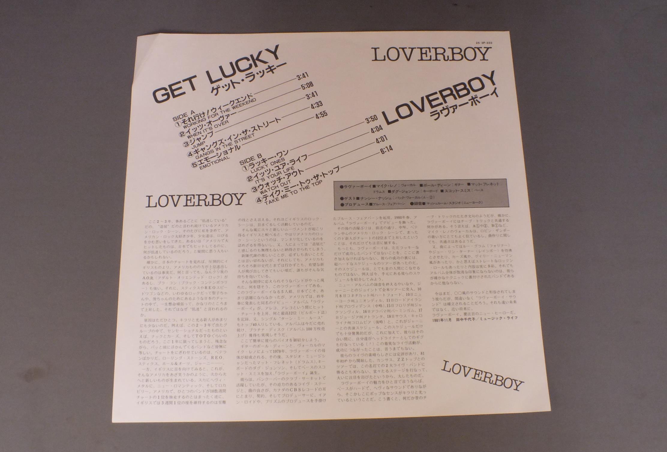 LOVERBOYラヴァーボーイ/GET LUCKYゲット・ラッキー 25・3P333 製造国:日本盤 / Media:LP外観:EX+盤の状態:EX+帯:EX+ 価格(税込):¥330(売約済) 送料 7inch:定形外郵便 360円~LP:定形外郵便 660円~送料は、注文の最終画面で確認頂けます。 > > LOVERBOY/GET LUCKY 外観 (EX+)特記事項:特記なし。外観EX+の共通説明:中古としては美品、一見してきれいでダメージが軽微。シミ、ヨゴレ、スレ有っても僅か~少し。 盤の状態 (EX+)特記事項:極薄いスリキズ・スレ少し。一見してきれいな状態です。盤EX+の共通説明:盤面の極薄いスリキズ、スレ少し程度 音に出そうなものは無いように見える(極軽微なソフトティック音は除く)。 帯の状態 (EX+):特記なし。 Tweet それぞれの画像をクリックすると、大きい写真が見られます こちらの商品もお勧めです 770円 MEN AT WORKメン・アット・ワーク / BUSINESS AS USUALワーク・ソングズ 440円 BELLE STARSベル・スターズ / BELLE STARSベル・スターズ 550円 HUNG CHUNGワン・チャン / HUNG CHUNGダンス・ホール・デイズ 550円 CORBIN HANNER BANDコーバン・ハナー・バンド / SON OF AMERICAサン・オブ・アメリカ 440円 SCREAMING BLUE MESSIAHSスクリーミング・ブルー・メサイアズ / BIKINI REDビキニ・レッド 440円 TAXXIタクシー / STATES OF EMERGENCY緊急発進 ! 770円 CULTURE CLUBカルチャー・クラブ / WAR SONG戦争のうた 770円 CHEAP TRICKチープ・トリック / AT BUDOKANAT 武道館