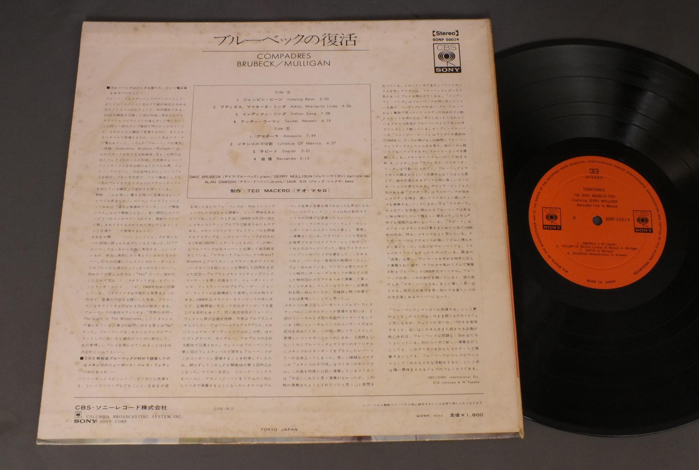 DAVE BRUBECK TRIO + GERRY MULLIGANデイブ・ブルーベック -・トリオ + ジェリー・マリガン/COMPADRESブルーベックの復活 SONP50024 製造国:日本盤 / Media:LP外観:VG+盤の状態:EX- 価格(税込):¥550(売約済) 送料 7inch:定形外郵便 360円~LP:定形外郵便 660円~送料は、注文の最終画面で確認頂けます。 > > DAVE BRUBECK TRIO + GERRY MULLIGAN/COMPADRES 外観 (VG+)特記事項:ジャケ表面にシミ。背スレ有り。底抜け有り。外観VG+の共通説明:ダメージやや有り。シミ、ヨゴレ、スレなど多少~やや多め。 盤の状態 (EX-)特記事項:薄いスリキズ・細かい表面スレ軽くある感じです。プチ出そうな所は少し。軽微なものが中心の様子です。盤EX-の共通説明:盤面のスリキズが多少有り。音に出そうなものは殆ど無いように見える~さほど気にならないぐらいの軽いプチ数カ所程度。 Tweet それぞれの画像をクリックすると、大きい写真が見られます こちらの商品もお勧めです 440円 MOE KOFFMAN / GOES ELECTRIC 770円 JOHN KLEMMERジョン・クレマー / LIFESTYLEライフスタイル 1,210円 ERROLL GARNERエロール・ガーナー / SERENADE TO LAURAセレナード・トゥ・ローラ 1,980円 GEORGE LEWIS` RAGTIME JAZZ BANDジョージ・ルイス・ラグタイム・バンド / JASS AT OHIO UNION (LIVE 1954) 2LP BOXSETオハイオ・ユニオン (1954年実況録音) 2枚組BOX 1,650円 MASABUMI KIKUCHI + GIL EVANS菊池雅章 / SAME TITLEWITH ギル・エヴァンス 1,540円 TEDDY WILSONテデイ・ウイルソン / THE TEDDY WILSONザ・テデイ・ウイルソン 990円 SIDNEY DEPARIS etc / COMMODORE SHOW CASEコモドア・ショーケース 880円 NEWPORT ALL STARSニューポート・オールスターズ / TRIBUTE TO DUKE ( LIVE IN BASEL SWISS 1969 OCT )デューク・エリントンに捧ぐ
