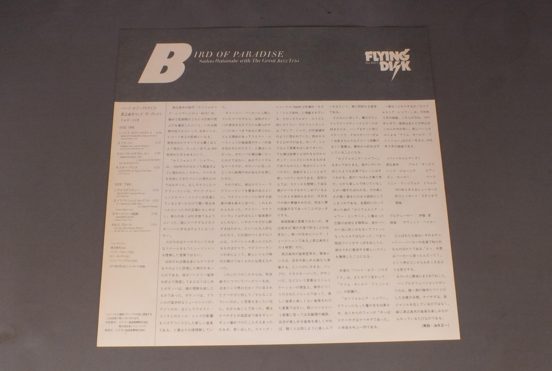 SADAO WATANABE WITH THE GREAT JAZZ TRIO渡辺貞夫ウィズ・ザ・グレイト・ジャズ・トリオ/BIRD OF PARADISEバード・オブ・パラダイス VIJ6017 製造国:日本盤 / Media:LP外観:EX盤の状態:EX+ 価格(税込):¥880(売約済) 送料 7inch:定形外郵便 360円~LP:定形外郵便 660円~送料は、注文の最終画面で確認頂けます。 > > SADAO WATANABE WITH THE GREAT JAZZ TRIO/BIRD OF PARADISE 外観 (EX)特記事項:背側に日焼け少し。外観EXの共通説明:ダメージが限定的。中古品としては保存状態がよい方。シミ、ヨゴレ、スレ 少し~軽度。 盤の状態 (EX+)特記事項:極薄いスリキズ・スレ少し。一見してきれいな状態です。盤EX+の共通説明:盤面の極薄いスリキズ、スレ少し程度 音に出そうなものは無いように見える(極軽微なソフトティック音は除く)。 Tweet それぞれの画像をクリックすると、大きい写真が見られます こちらの商品もお勧めです 1,210円 BUCK CLAYTONバック・クレイトン / PASSORT TO PARADISEスポート・トゥ・パラダイス 1,320円 SONNY CLARK TRIOソニー・クラーク・トリオ / SAME TITEL 770円 CHARLIE PARKERチャーリー・パーカー / CHARLIE PARKER ON SAVOY VOL7チャーリー・パーカー・オン・サヴォイVOL7 1,210円 ERIC DOLPHYエリック・ドルフィー / LAST DATEラスト・レコーディング 770円 JACQUES LOUSSIER TRIOジャック・ルーシェ・トリオ / PLAY BACH VOL4プレイ・バッハ第4集 440円 ROGER KELLAWAYロジャー・ケラウェイ / CENTER OF THE CIRCLE核 1,320円 BOB CROSBY`S BOB CATSボブ・クロスビーのボブ・キャッツ / BOB CROSBY`S BOB CATSボブ・クロスビーのボブ・キャッツ 660円 SADAO WATANABE渡辺貞夫 / CALIFORNIA SHOWERカリフォルニア・シャワー