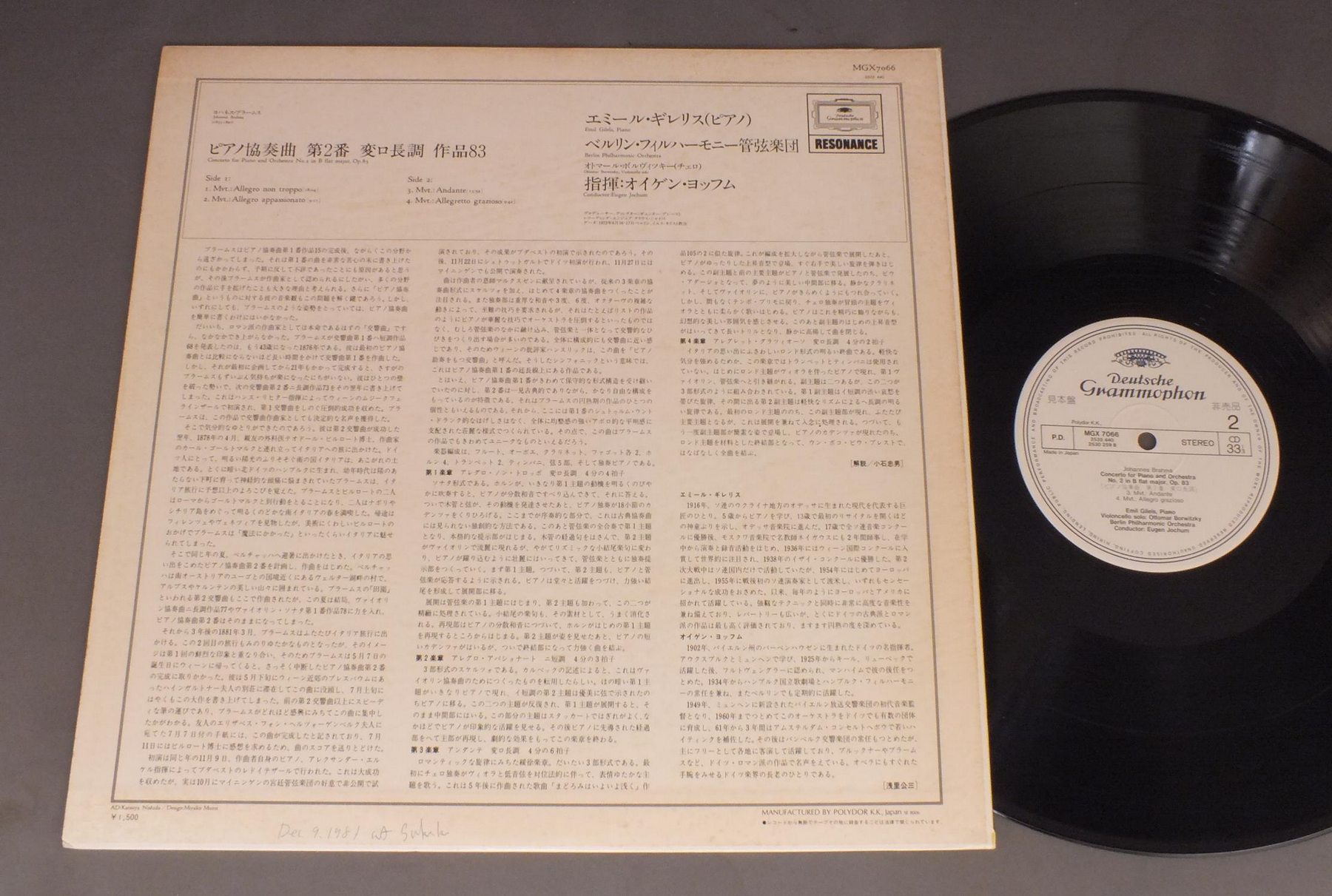 GILELS - JOCHUMギレリス - ヨッフム/BRAHMS - PIANO CONC. NO2ブラームス - ピアノ協奏曲第2番 MGX7066 製造国:日本盤 / Media:LP外観:VG+盤の状態:EX 価格(税込):¥550(売約済) 送料 7inch:定形外郵便 360円~LP:定形外郵便 660円~送料は、注文の最終画面で確認頂けます。 > > GILELS - JOCHUM/BRAHMS - PIANO CONC. NO2 外観 (VG+)特記事項:シミ有り外観VG+の共通説明:ダメージやや有り。シミ、ヨゴレ、スレなど多少~やや多め。 盤の状態 (EX)特記事項:薄いスリキズ・スレ軽くある感じ。軽微なものの様子です。盤EXの共通説明:盤面のスリキズが薄いものが少し~軽度 音に出そうなものは無いように見える(軽微なソフトティック音は除く)。 Tweet それぞれの画像をクリックすると、大きい写真が見られます こちらの商品もお勧めです 990円 KARAJANカラヤン / PRELUDES-HUNGARIAN RHAOSODY NO2-OVERTTURE`1812`-FINLANDIA管弦楽名曲集 990円 KAREL ANCERLカレル・アンチェル / STRAVINSKY-SACRE DU PRINTEMPSストラヴィンスキー-春の祭典 1,430円 SZELL - CLEVELAND ORCH.セル - クリーヴランド管弦楽団 / BEETHOVEN - SYMPHONY No9ベートーヴェン交響曲第9番合唱 770円 KLEMPERER - PHIL. ORCH.クレンペラー - フィルハーモニア管弦楽団 / BRAHMS - SYM. NO4ブラームス - 交響曲第4番 990円 RAMPAL - LASKINE - LANCELOTランパル - ラスキーヌ - ランスロ - パイヤール室内管弦楽団 他 / MOZART - FLUTE & HARP CONC. & CLARINET CONC.モーツァルト - フルートとハープのための協奏曲 & クラリネット協奏曲 1,320円 ANSERMET - L`ORCHESTRE DE LA SUISSE ROMANDEアンセルメ - スイス・ロマンド管弦楽団 / MA MER L`OYEマ・メール・ロワ 1,210円 KARAJAN - BERLINER PHIL.カラヤン - ベルリン・フィル / BEETHOVEN - SYM. NO5ベートーヴェン - 交響曲第5番 990円 DEODATOデオダート / PRELUDEツァラトゥストラはかく語りき
