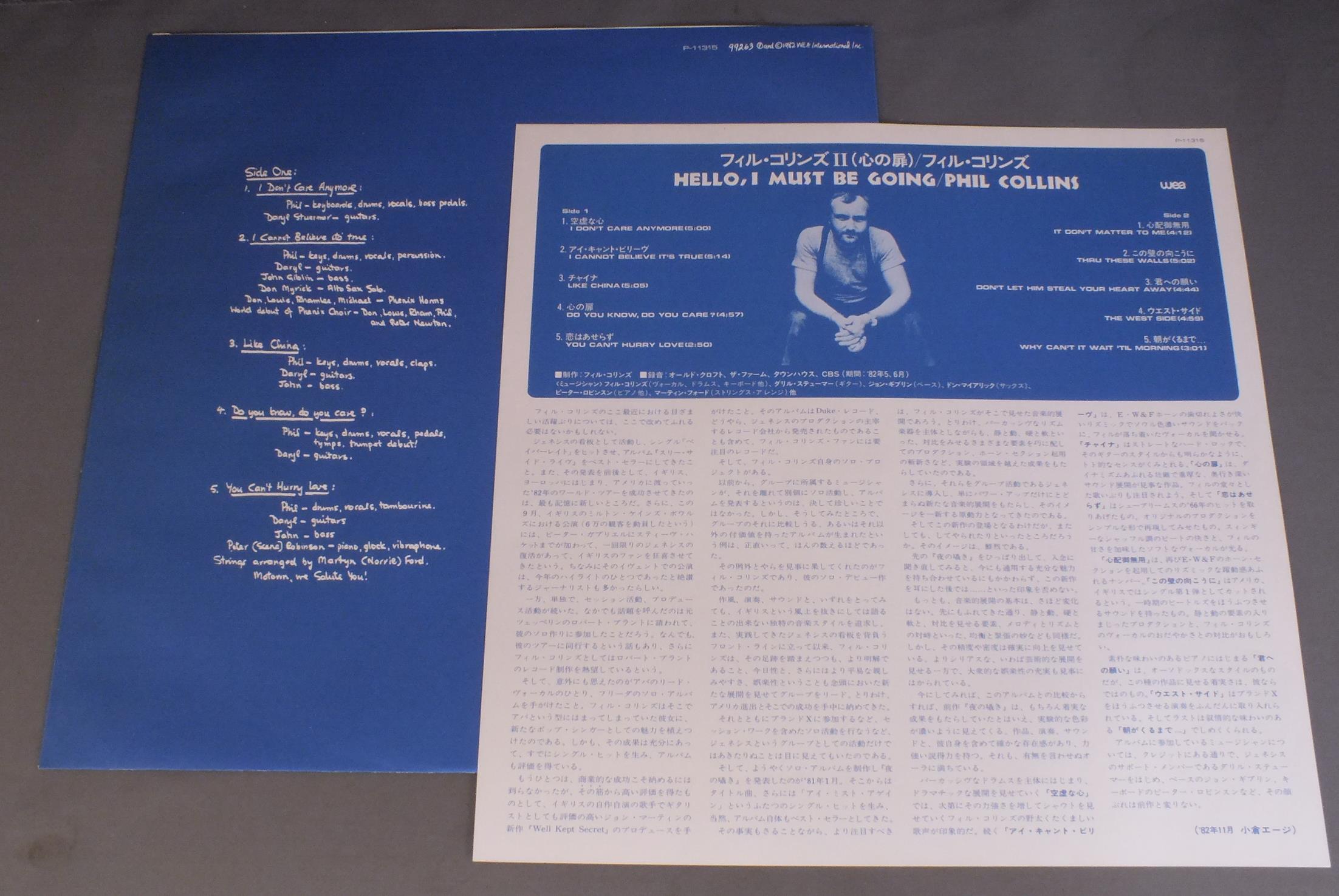 PHIL COLLINSフィル・コリンズ/HELLO. I MUST BE SOING !フィル・コリンズ 2(心の扉) P11315 製造国:日本盤 / Media:LP外観:EX+盤の状態:EX 価格(税込):¥2,187(売約済) 送料 7inch:定形外郵便 360円~LP:定形外郵便 660円~送料は、注文の最終画面で確認頂けます。 > > PHIL COLLINS/HELLO. I MUST BE SOING ! 外観 (EX+)特記事項:特記なし。外観EX+の共通説明:中古としては美品、一見してきれいでダメージが軽微。シミ、ヨゴレ、スレ有っても僅か~少し。 盤の状態 (EX)特記事項:薄いスリキズ・スレ軽くある感じ。軽微なものの様子です。盤EXの共通説明:盤面のスリキズが薄いものが少し~軽度 音に出そうなものは無いように見える(軽微なソフトティック音は除く)。 Tweet それぞれの画像をクリックすると、大きい写真が見られます こちらの商品もお勧めです 1,210円 TOMMY SHAWトミー・ショウ / GIRLS WITH GUNSガール・ウィズ・ガン 1,210円 SPIKE JONESスパイク・ジョーンズ / IN HI-FI西洋怪談傑作集 660円 RODNEY CROWELLロドニー・クロウェル / BUT WHAT WILL THE NEIGHBORS THINKアメリカン・ヒーロー 770円 DAVE MASONデイヴ・メイスン / DAVE MASONデイヴ・メイスン 770円 JOHN DENVERジョン・デンバー / DREAMLAND EXPRESSドリームランド・エクスプレス 440円 YOICHI SUGAWARA & ALFRED HAUSE菅原洋一 &アルフレッド・ハウゼ楽団 / YOICHI SUGAWARA WITH ALFRED HAUSE菅原洋一.ハウゼと歌う 1,210円 SIMON & GARFUNKELサイモンとガーファンクル / WEDNESDAY MORNING 3AM水曜日の朝午前3時 1,210円 DON HENLEYドン・ヘンリー / I CAN`T STAND STILLアイ・キャント・スタンド・スティル