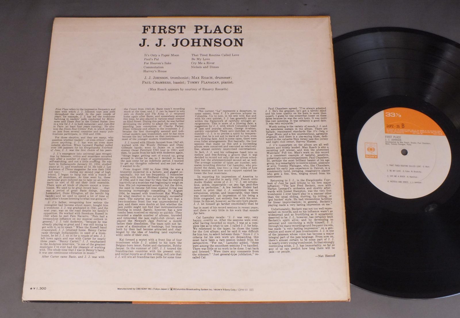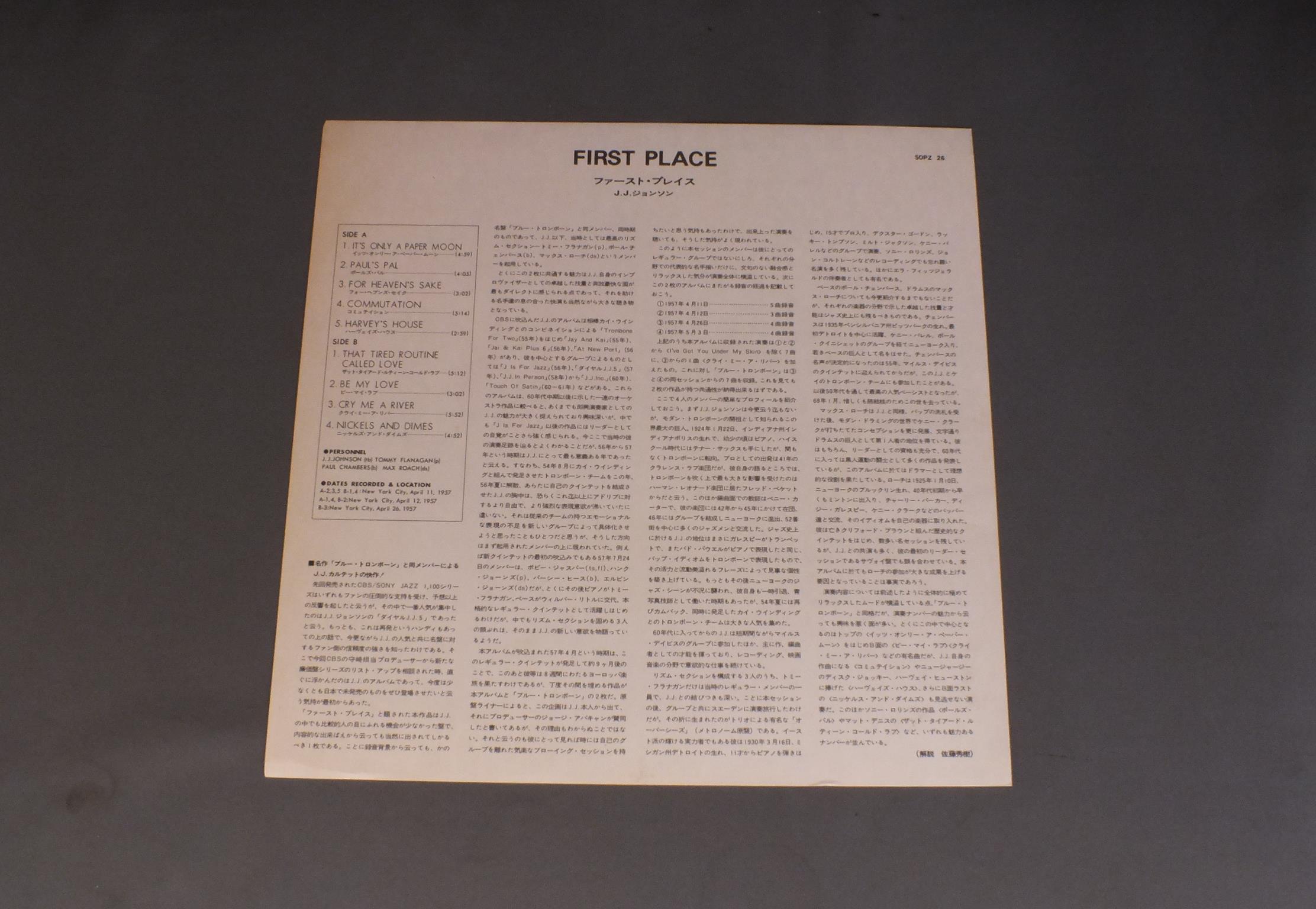 J.J.JOHNSONJ.J.ジョンソン/FIRST PLACEファースト・プレイス SOPZ26 製造国:日本盤 / Media:LP外観:EX-盤の状態:EX- 価格(税込):¥770(売約済) 送料 7inch:定形外郵便 360円~LP:定形外郵便 660円~送料は、注文の最終画面で確認頂けます。 > > J.J.JOHNSON/FIRST PLACE 外観 (EX-)特記事項:ヘリスレやリングスレ有り。裏ジャケにシミ。外観EX-の共通説明:ダメージ軽度~多少。 中古品としては普通の状態。シミ、ヨゴレ、スレなど軽く~多少。 盤の状態 (EX-)特記事項:薄いスリキズ・細かい表面スレ軽くある感じです。プチ出そうな所は少し。軽微なものが中心の様子です。盤EX-の共通説明:盤面のスリキズが多少有り。音に出そうなものは殆ど無いように見える~さほど気にならないぐらいの軽いプチ数カ所程度。 Tweet それぞれの画像をクリックすると、大きい写真が見られます こちらの商品もお勧めです 1,210円 BUCK CLAYTON SEPTETバック・クレイトン / BUCKIN`THE BLUESバッキン・ザ・ブルース 1,320円 GERY PEACOCKゲーリー・ピーコック / TALES OF ANOTHERTALES OF ANOTHER 1,210円 TERUMASA HINO日野皓正 / PYRAMIDピラミット 1,210円 JIMMY SMITHジミー・スミス / PORTUGUESE SOULポルトガル・ソウル 770円 EDDIE JEFFERSONエディ・ジェファーソン / LETTER FROM HOMEレター・フロム・ホーム 1,210円 JOHN KLEMMERジョン・クレマー / MAGNIFICENT MADNESSマグニフィセント・マッドネス 990円 TAL FARLOWタル・ファーロウ / SWINGINNG GUITARスウィンギング・ギター 990円 YOSHIAKI MASUO増尾好秋 / SAILING WONDERセイリング・ワンダー