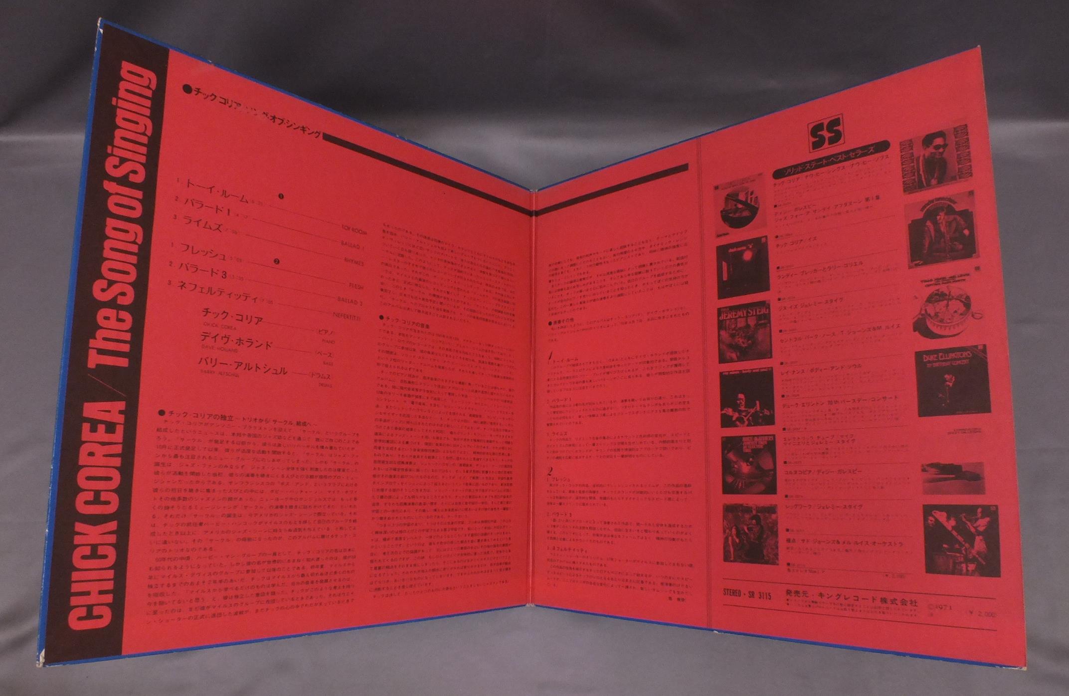 CHICK COREAチック・コリア/SONG OF SINGINGソング・オブ・シンギング SR3115 製造国:日本盤 / Media:LP外観:VG+盤の状態:EX+ 価格(税込):¥1,878(売約済) 送料 7inch:定形外郵便 360円~LP:定形外郵便 660円~送料は、注文の最終画面で確認頂けます。 > > CHICK COREA/SONG OF SINGING 外観 (VG+)特記事項:背やヘリにスレ。外観VG+の共通説明:ダメージやや有り。シミ、ヨゴレ、スレなど多少~やや多め。 盤の状態 (EX+)特記事項:薄いスリキズ・スレ少し。一見してきれいな状態です。盤EX+の共通説明:盤面の極薄いスリキズ、スレ少し程度 音に出そうなものは無いように見える(極軽微なソフトティック音は除く)。 Tweet それぞれの画像をクリックすると、大きい写真が見られます こちらの商品もお勧めです 1,650円 PHINEAS NEWBORNフィニアス・ニューボーン / PIANO PORTRAITSピアノ・ポートレイト 770円 HERBIE MANNハービー・マン / HOLD ON. I`M COMIN`ホールド・オン 770円 SONYA ROBINSONソニア・ロビンソン / SONYAソニア 1,320円 RICHIE COLEリッチー・コール / ALIVE !アライヴ ! 990円 RICHIE COLEリッチー・コール / ALIVE !アライヴ ! 990円 DAVE GRUSINデイヴ・グルーシン / ONE OF A KINDデイヴ・グルーシン・ジェントル・サウンド 990円 JOHN LEWISジョン・ルイス / EUROPEAN WINDOWSヨーロッパの窓 440円 SADAO WATANABE渡辺貞夫 / CALIFORNIA SHOWERカリフォルニア・シャワー