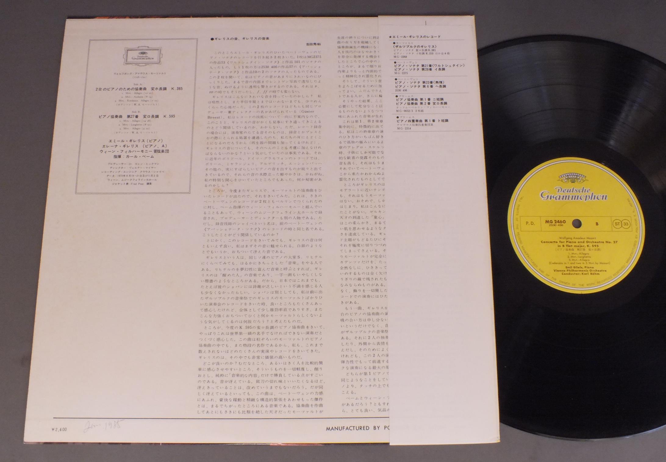 GILELSギレリス/MOZART - CONC. FORTWO PIANOS KV 365モーツァルト - 2台のピアノのための協奏曲 MG2460 製造国:日本盤 / Media:LP外観:EX盤の状態:EX 価格(税込):¥330(売約済) 送料 7inch:定形外郵便 360円~LP:定形外郵便 660円~送料は、注文の最終画面で確認頂けます。 > > GILELS/MOZART - CONC. FORTWO PIANOS KV 365 外観 (EX)特記事項:裏ジャケにシミ外観EXの共通説明:ダメージが限定的。中古品としては保存状態がよい方。シミ、ヨゴレ、スレ 少し~軽度。 盤の状態 (EX)特記事項:薄いスリキズ・スレ軽くある感じ。プチ出そうなところは少しだけで、ほとんどが軽微なものの様子です。盤EXの共通説明:盤面のスリキズが薄いものが少し~軽度 音に出そうなものは無いように見える(軽微なソフトティック音は除く)。 帯の状態 ():シミ有り Tweet それぞれの画像をクリックすると、大きい写真が見られます こちらの商品もお勧めです 990円 KARAJANカラヤン / HOLST PLANETSホルスト 組曲`惑星` 1,320円 KARAJAN - VIENNA PHIL.カラヤン - ウィーン・フィル / R. STRAUSS - ALSO SPRACH ZARATHUSTRAリヒャルト・シュトラウス - 交響詩 ツァラトゥストラはかく語りき 990円 HUDECEK - SMETACEK - CZECHOSLOVAK RADIO SYM.フデチェック - スメタチェック - チェコ放送交響楽団 / MENDELSSOHN - VIOLIN CONCERTO etcオイストラフに捧ぐ(メンデルスゾーン - ヴァイオリン協奏曲他) 1,320円 BOHM - VIENNA PHIL.ベーム - ウィーン・フィル - ヘッツェル / R.STRAUSS - EIN HELDENLEBENR.シュトラウス 交響詩 英雄の生涯 990円 DERVAUXデルヴォ / CHABRIER ORCH.L WORKSスペイン-シャブリエ管弦楽曲集 990円 TOSHIHIRO KOIKE - MUSASHINO CIVIC PHIL.小池利宏 - 武蔵野市民交響楽団 / PAUL WHEAR - STONEHENGE SYMPHONY etcポール・ホエアー - ストーンヘンジ交響曲他 990円 CLUYTENSクリュイタンス / FRANCK-4POEMES SYMPHONIQUESフランク交響詩選集 990円 HANS SCHMIDT-ISSERSTEDT イッセルシュテット - シュナイダーハン / MOZART - VIOLIN CONCERTOS NO 4-5モーツァルト - ヴァイオリン協奏曲 第4番
