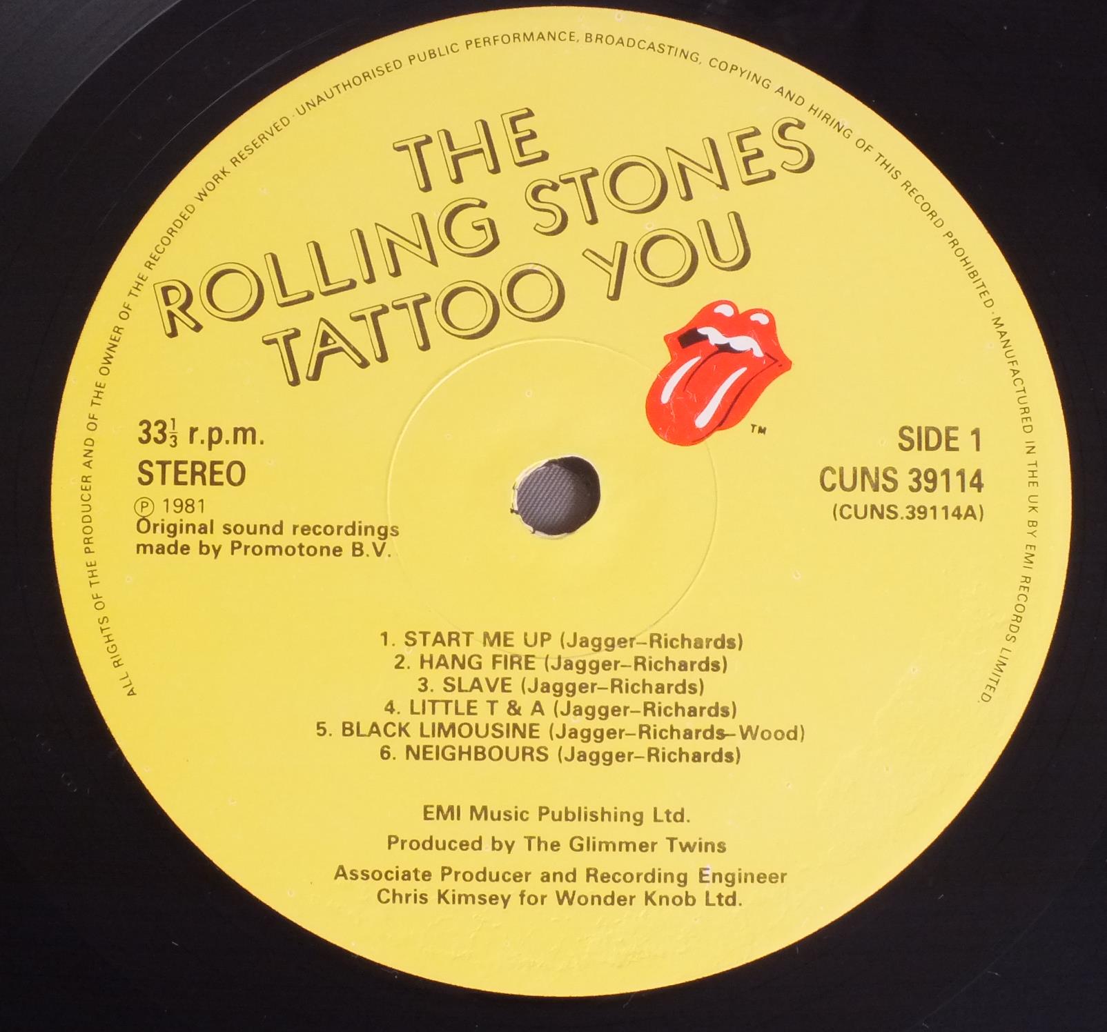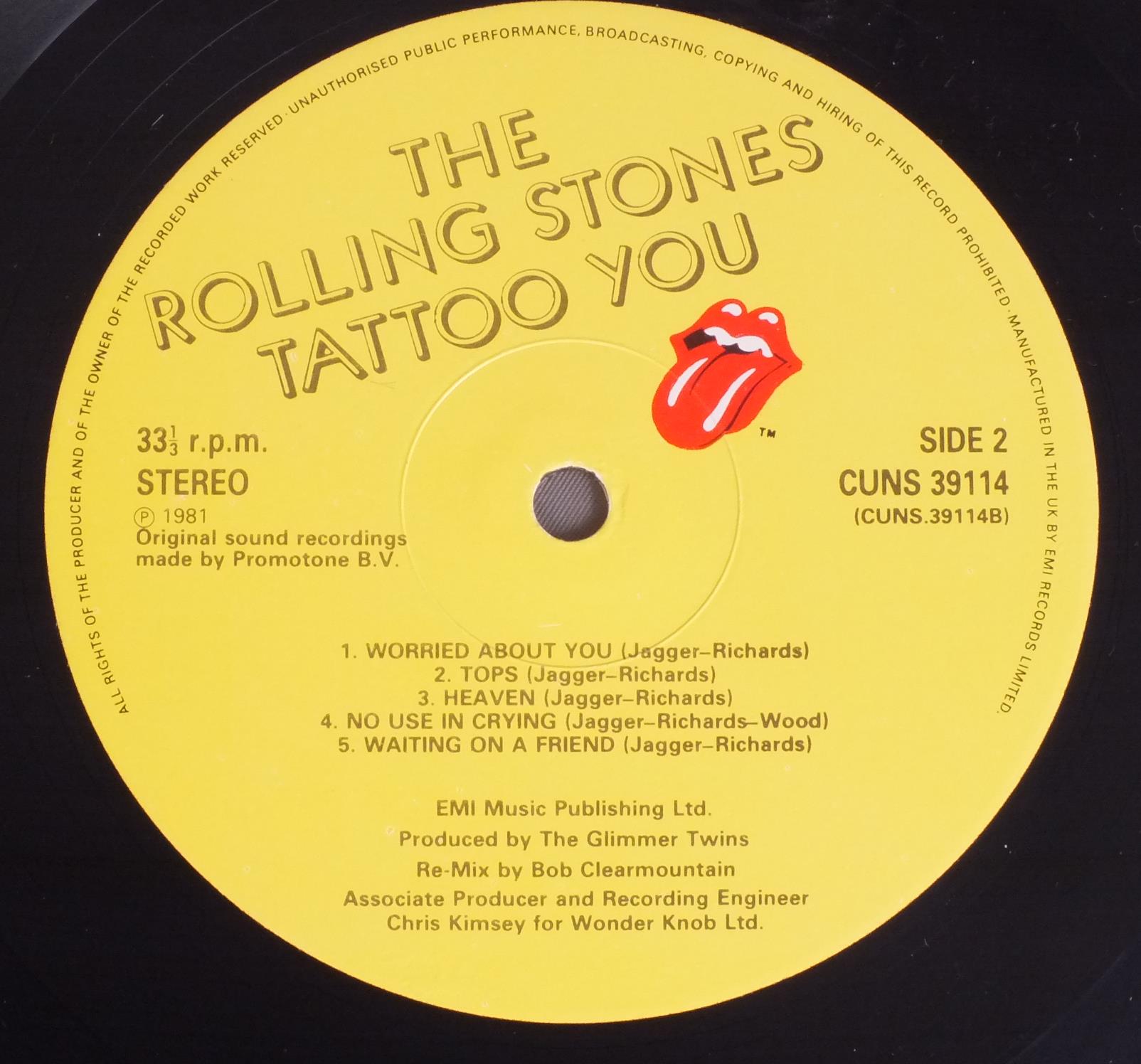 ROLLING STONES/TATTOO YOU CUNS39114 製造国:英国盤 / Media:LPMatrix:A-1 B-2外観:EX盤の状態:EX 価格(税込):¥4,950(売約済) 送料 7inch:定形外郵便 360円~LP:定形外郵便 660円~送料は、注文の最終画面で確認頂けます。 > > ROLLING STONES/TATTOO YOU 外観 (EX)特記事項:体的にスレやスリキズ、よごれ等は薄い感じ。きれいな状態です。オリジナルインナーもしっかりした状態で抜けも無いです。外観EXの共通説明:ダメージが限定的。中古品としては保存状態がよい方。シミ、ヨゴレ、スレ 少し~軽度。 盤の状態 (EX)特記事項:薄いスリキズ・スレ軽くある感じ。ほとんどが軽微なものの様子です。曲間など、静かなところを中心に聴いて見ましたが、チリプチ軽度で音もしっかり鳴っていました。盤EXの共通説明:盤面のスリキズが薄いものが少し~軽度 音に出そうなものは無いように見える(軽微なソフトティック音は除く)。 Tweet それぞれの画像をクリックすると、大きい写真が見られます こちらの商品もお勧めです 2,750円 ROLLING STONES / EMOTIONAL RESCUE + POSTEREMOTIONAL RESCUE ポスター付